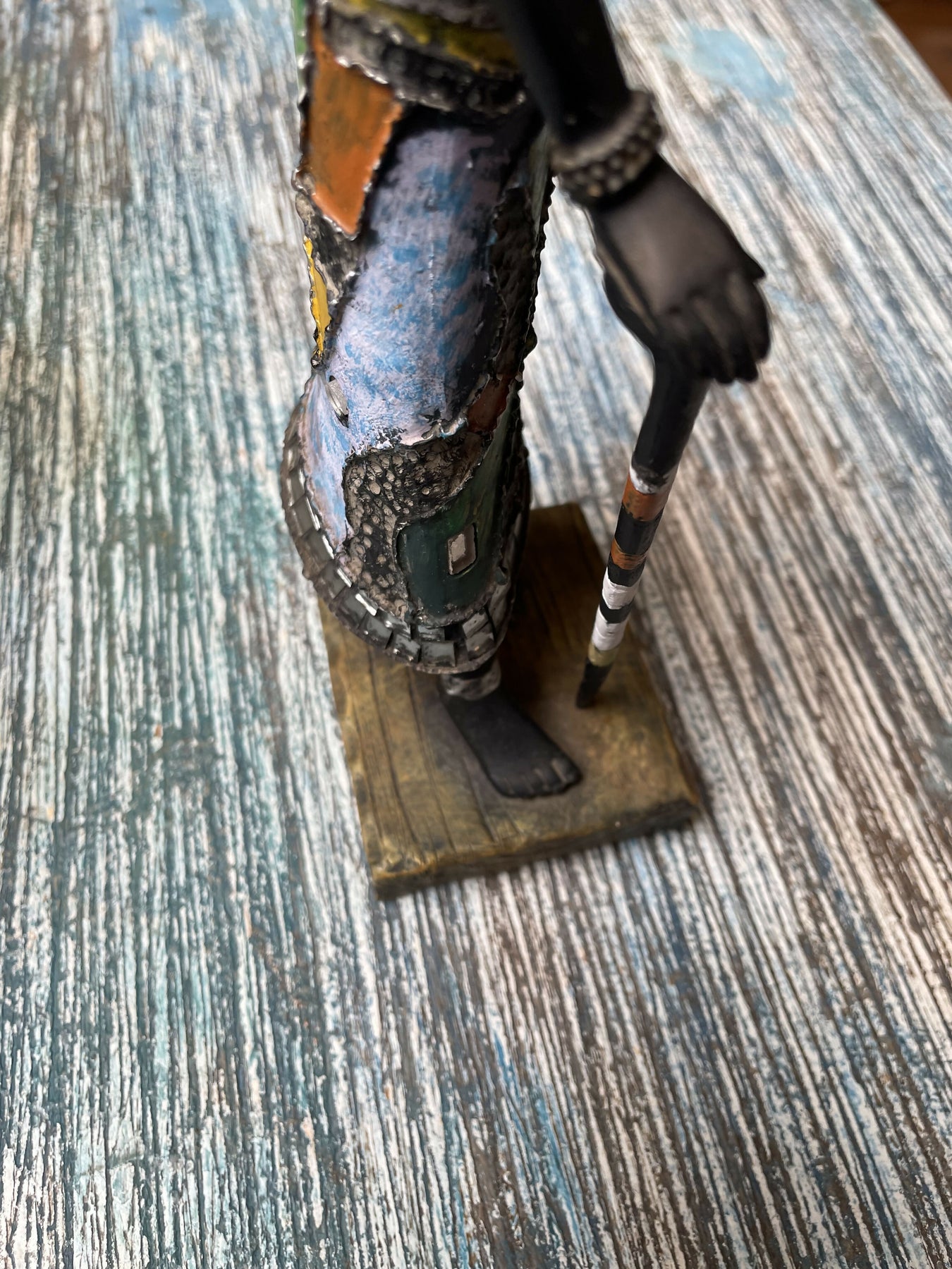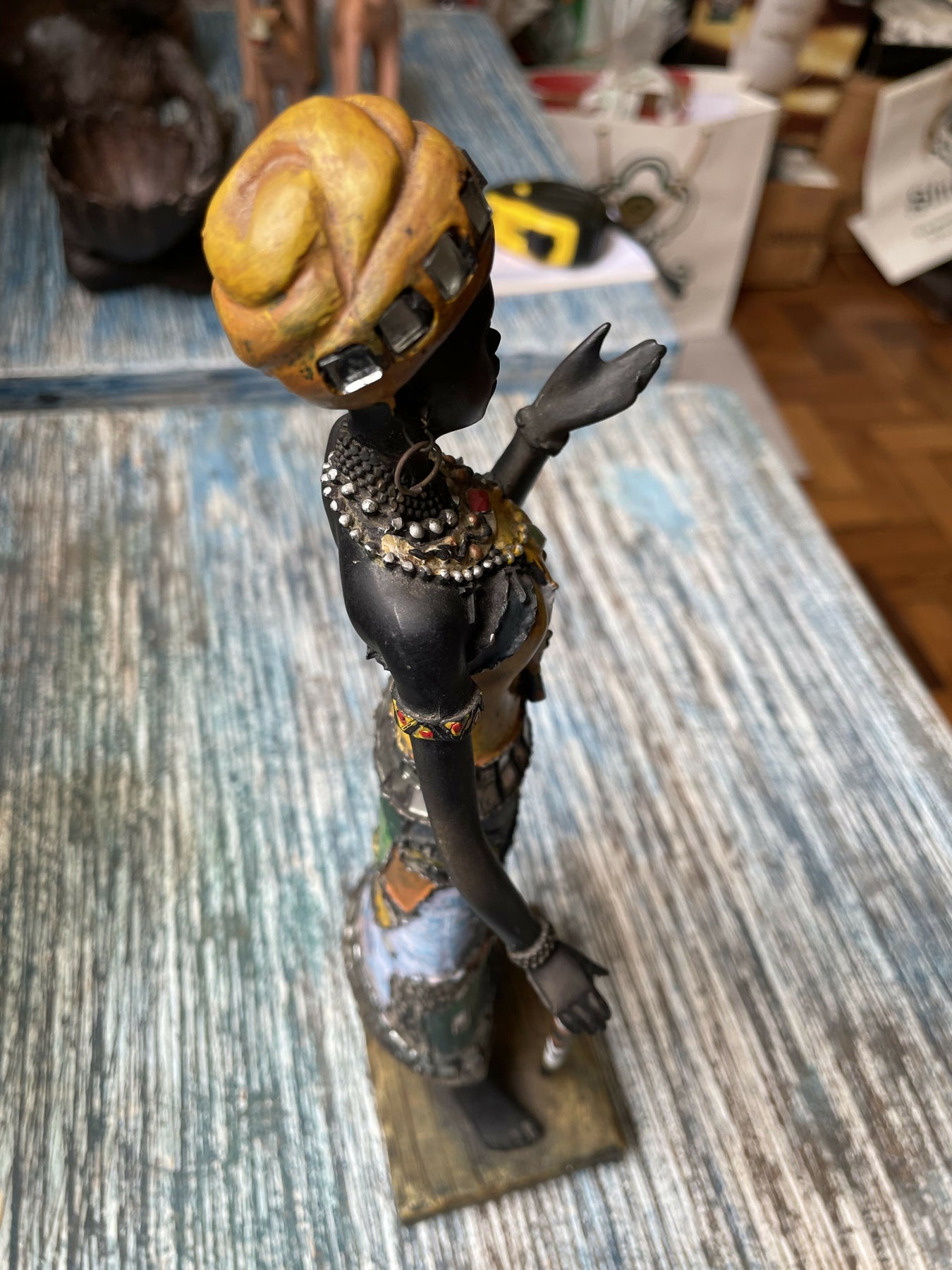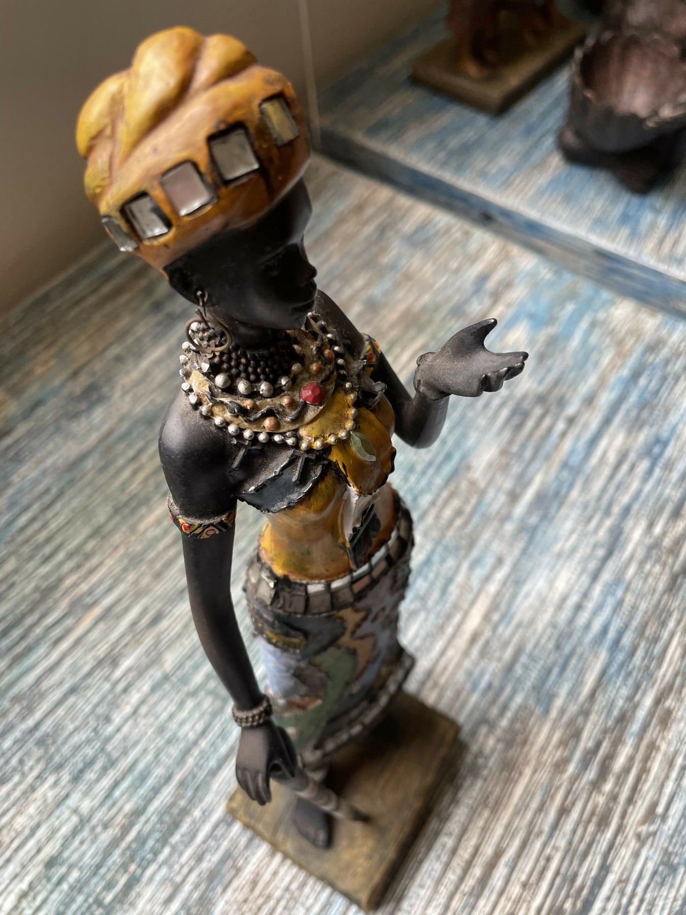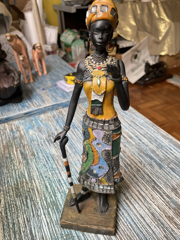Linda estatueta de mulher africana em resina trabalhada com pintura , mosaicos coloridas, miçangas, espelhos  e argolas.Peça inspirada na arte africana, aqui representada por uma mulher tribal.