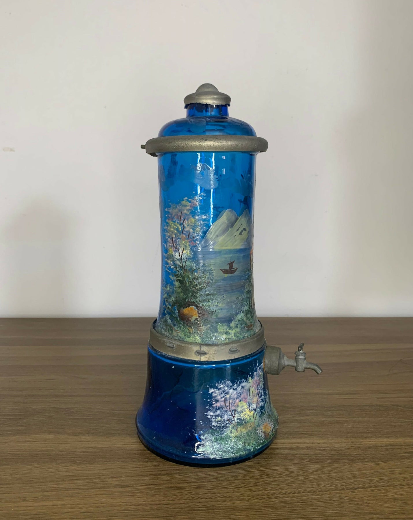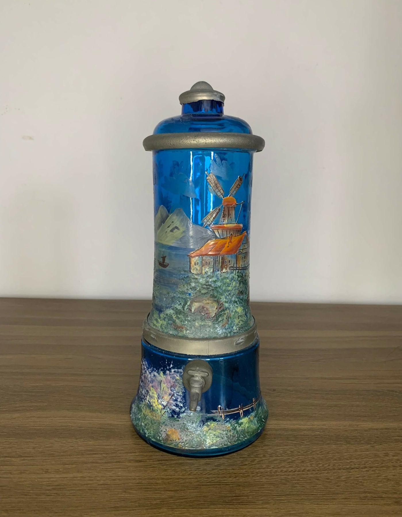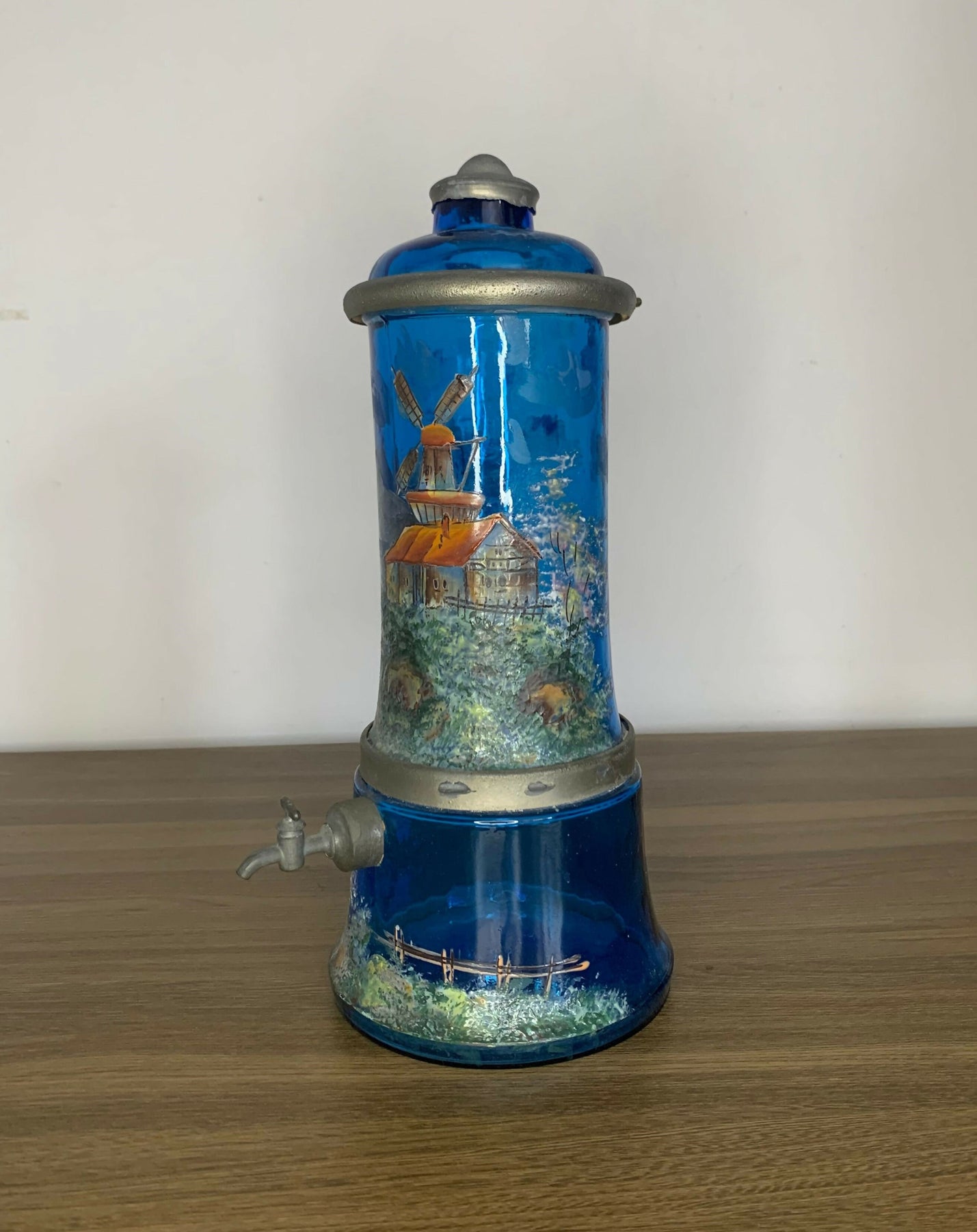 Garrafa de vidro na tonalidade azul cobalto com uma pintura feita a mão de uma paisagem e um moinho.