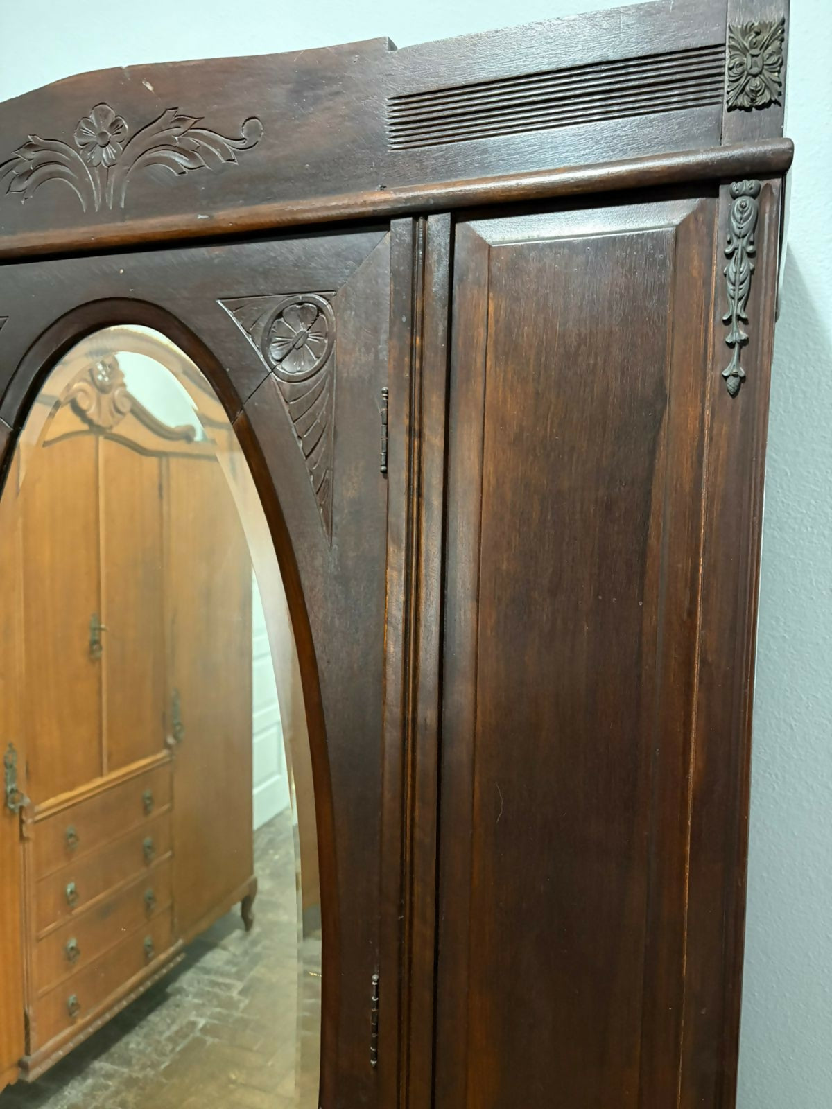 Porta única com espelho na frente. 02 gavetas menores e 01 gaveta grande.