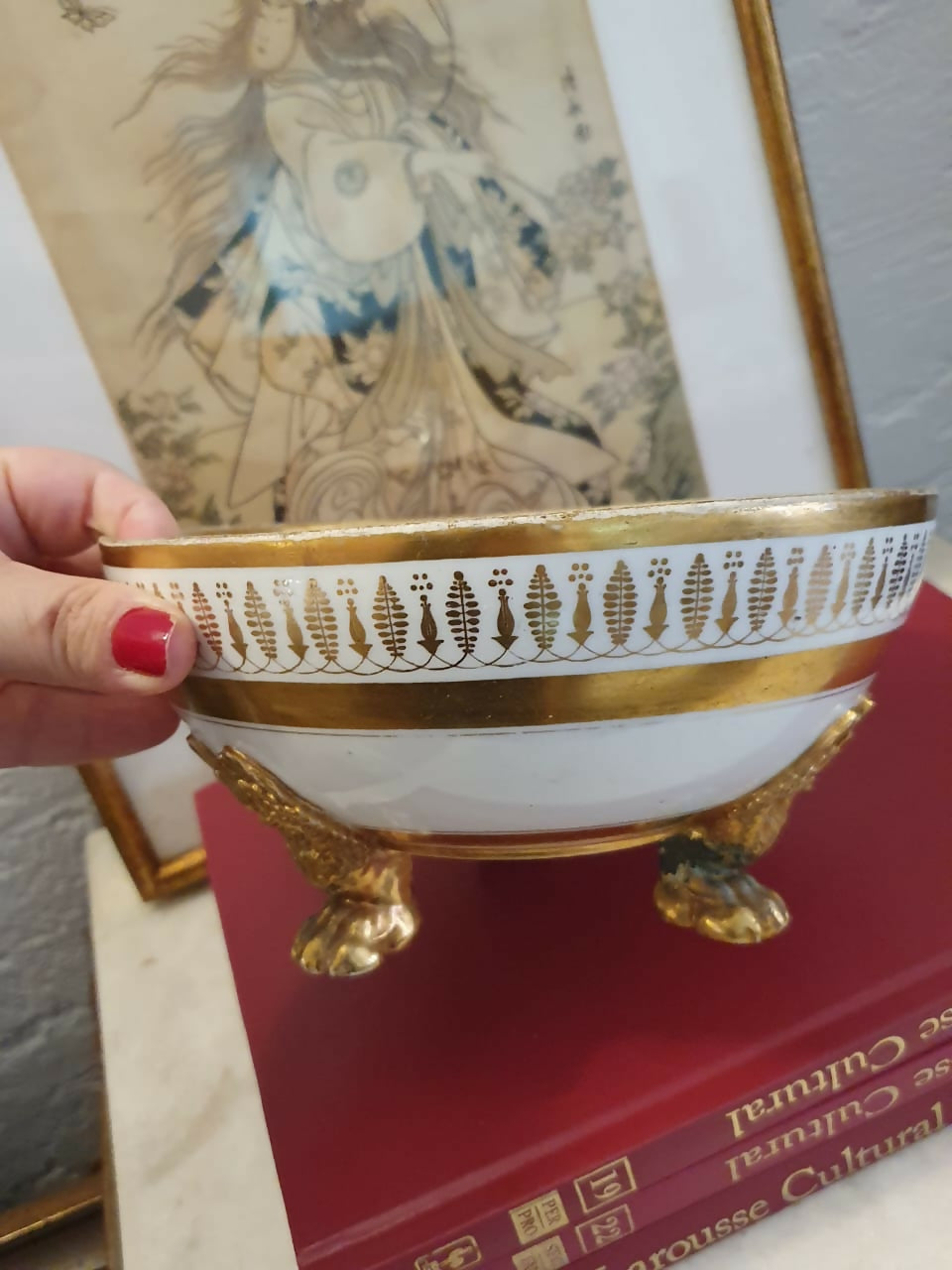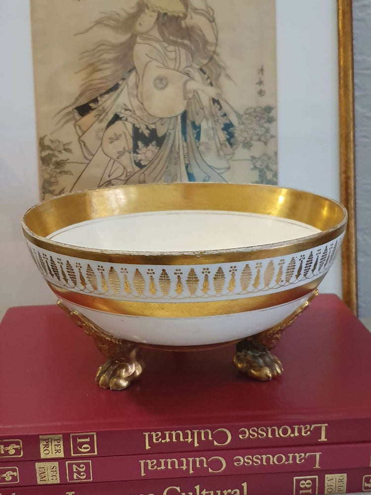 Jardiniére ou centro de mesa (gente, uma peça dessa fica linda em tudo quanto é lugar), em porcelana (provavelmente Limoges) do séc XIX,  com ricas dourações a ouro e pés em forma de garra de águia.