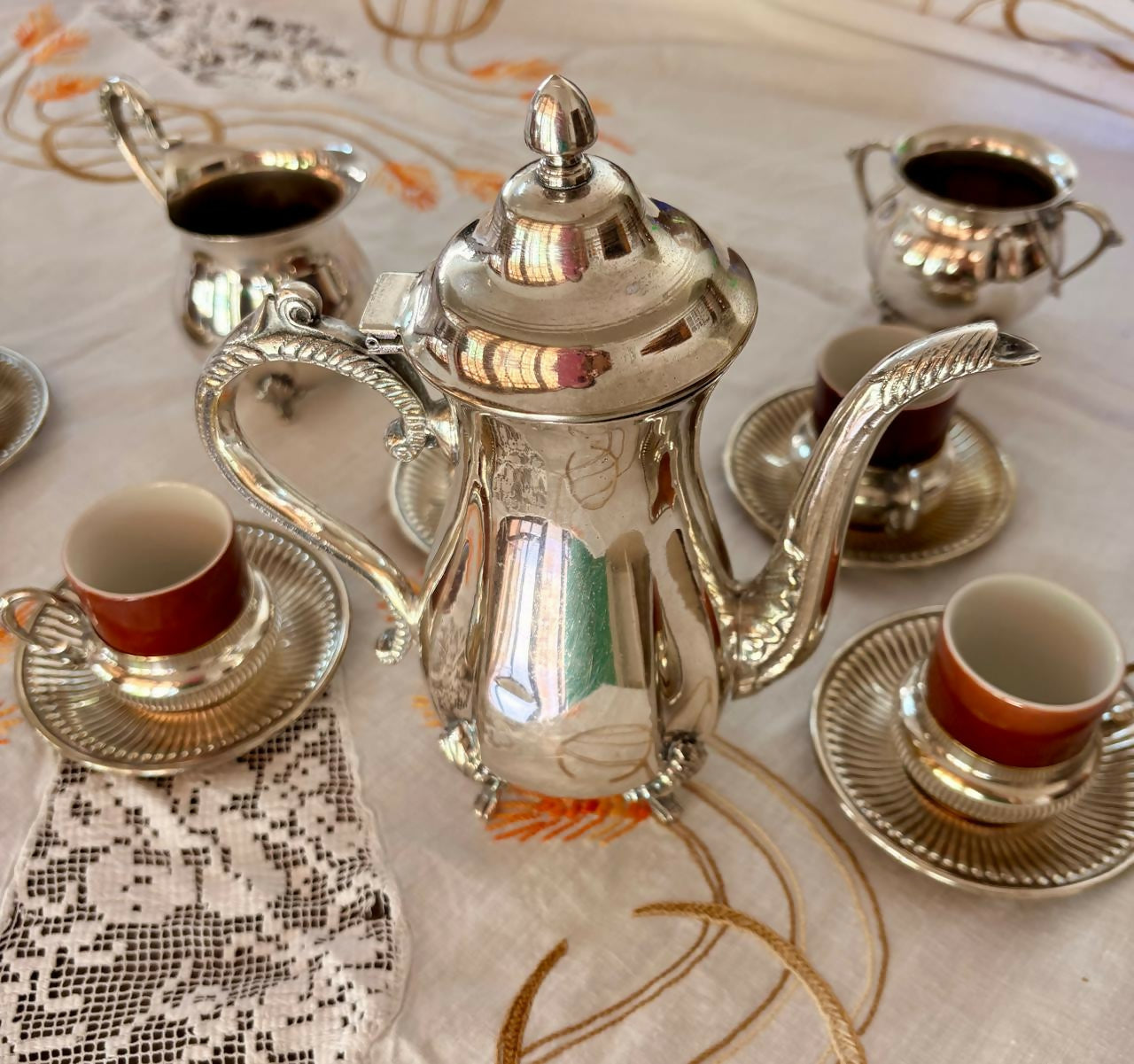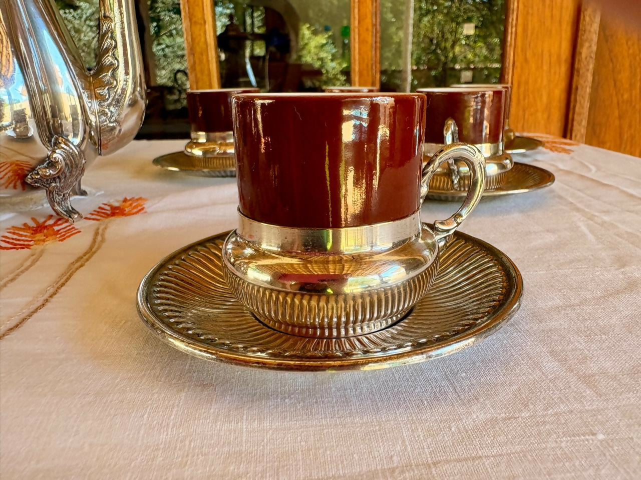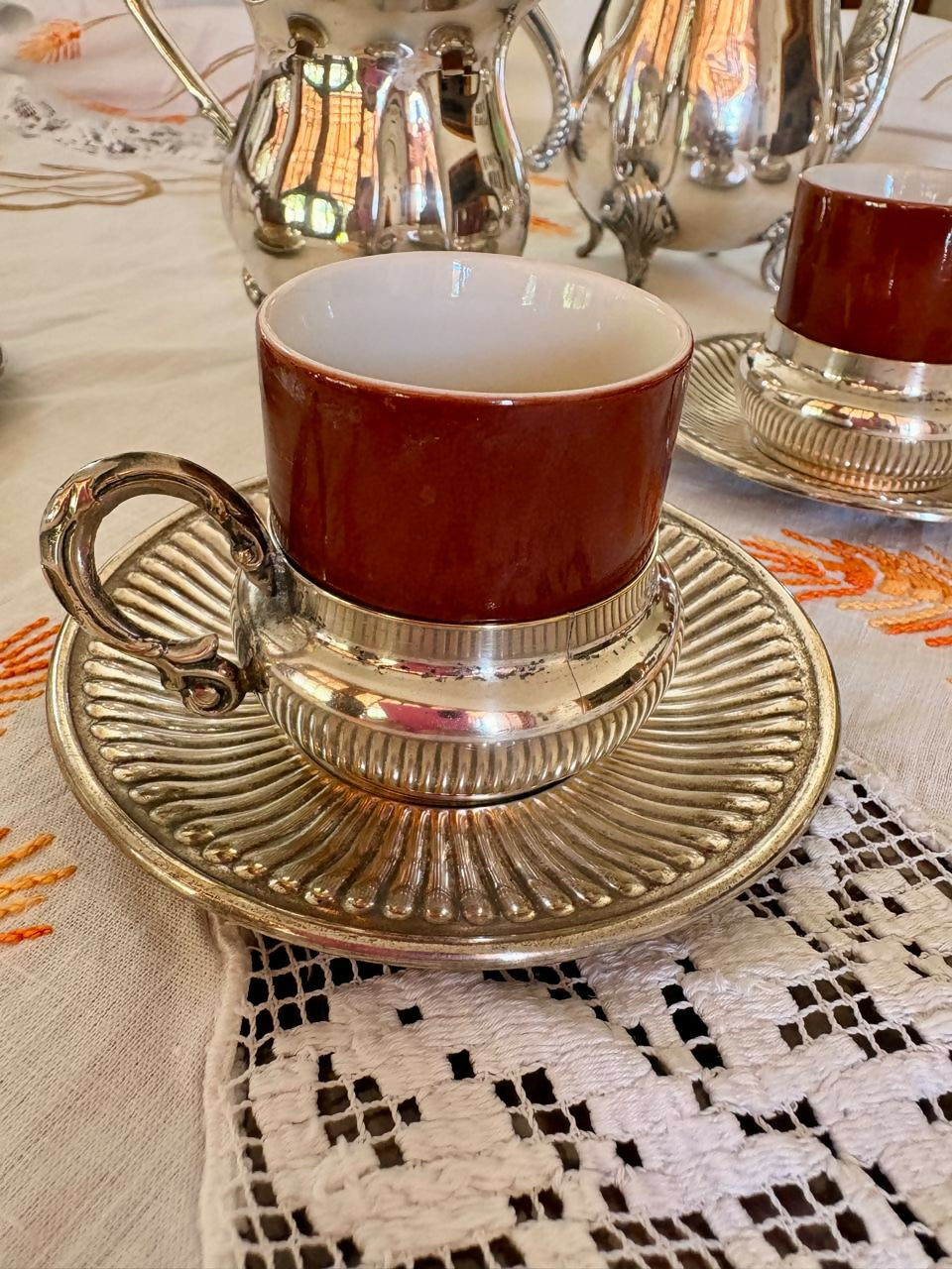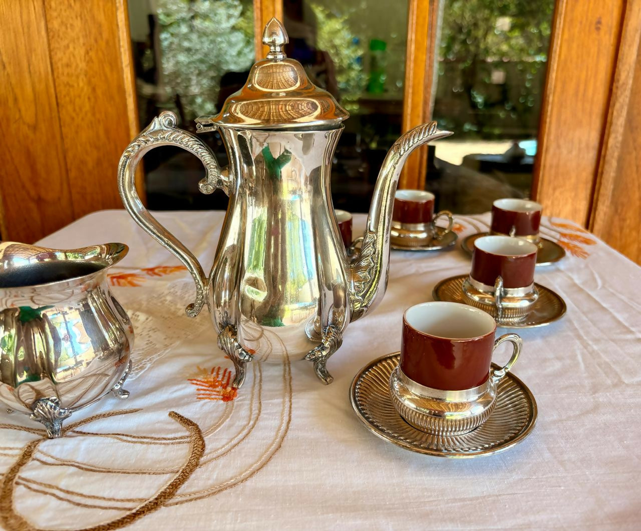 Antigo e raro jogo para café espanhol da marca Shekich Plate, contendo bule, açucareiro, cremeira e cinco xícaras com respectivos pires. As xícaras têm base em metal banhado à prata e louça vinho.