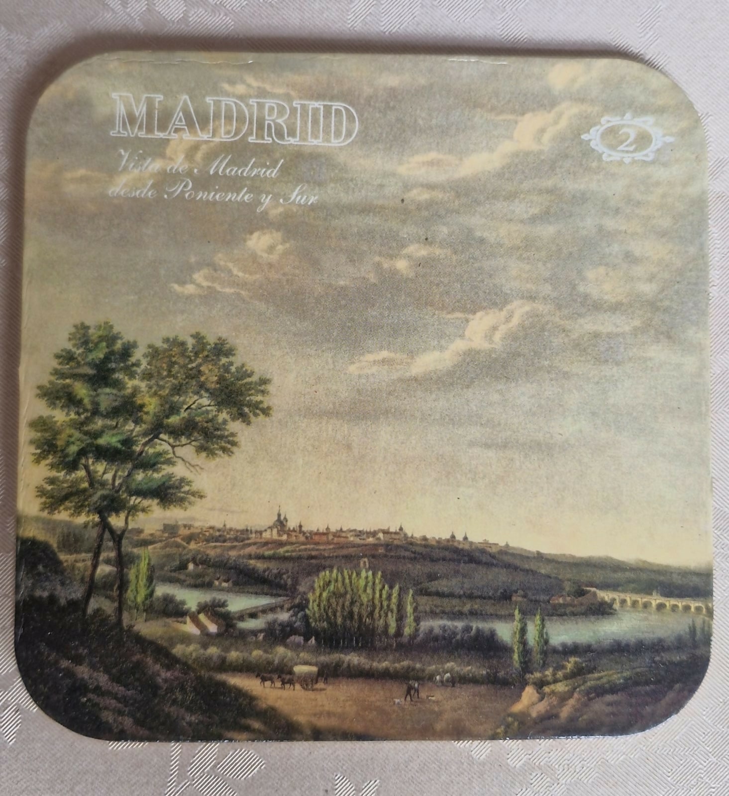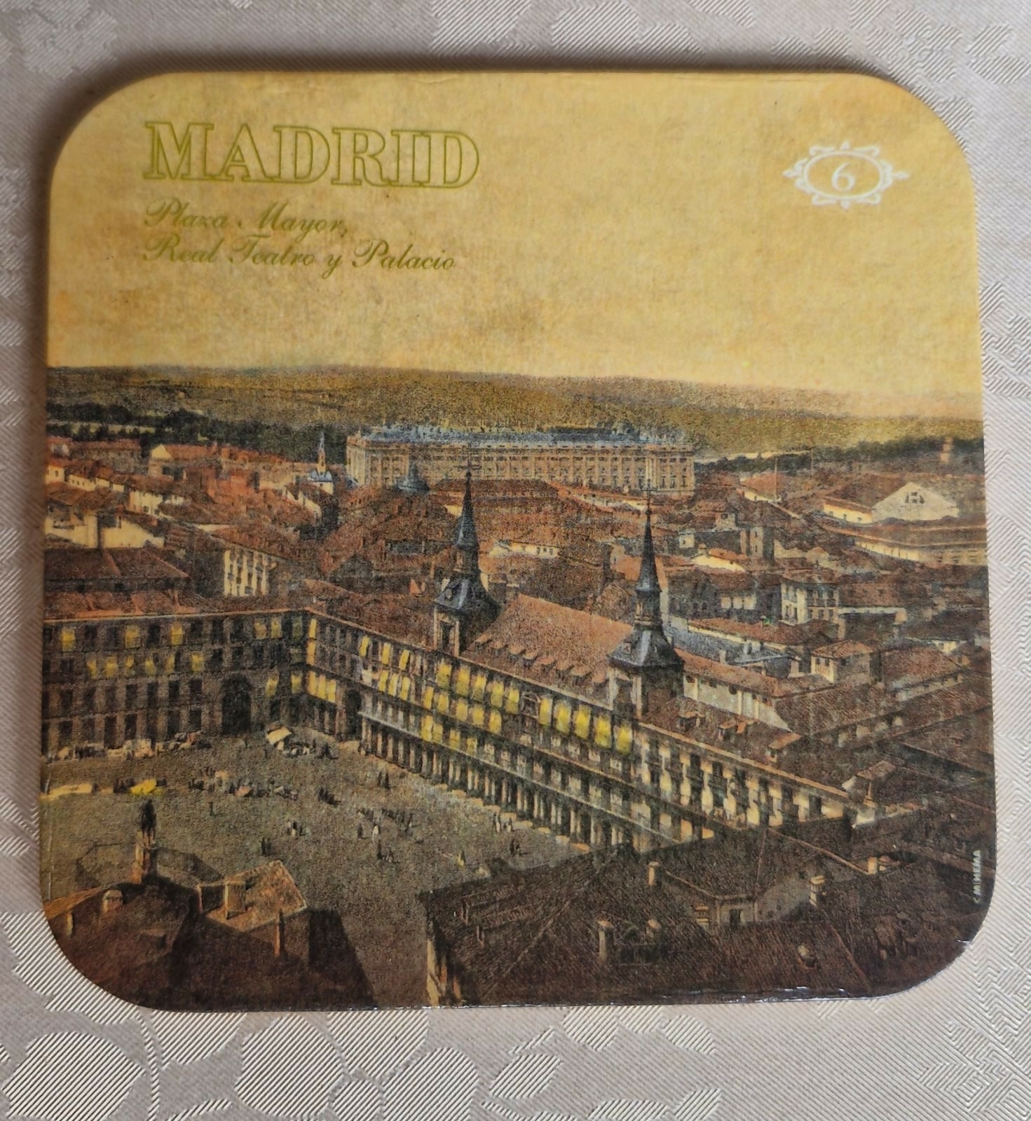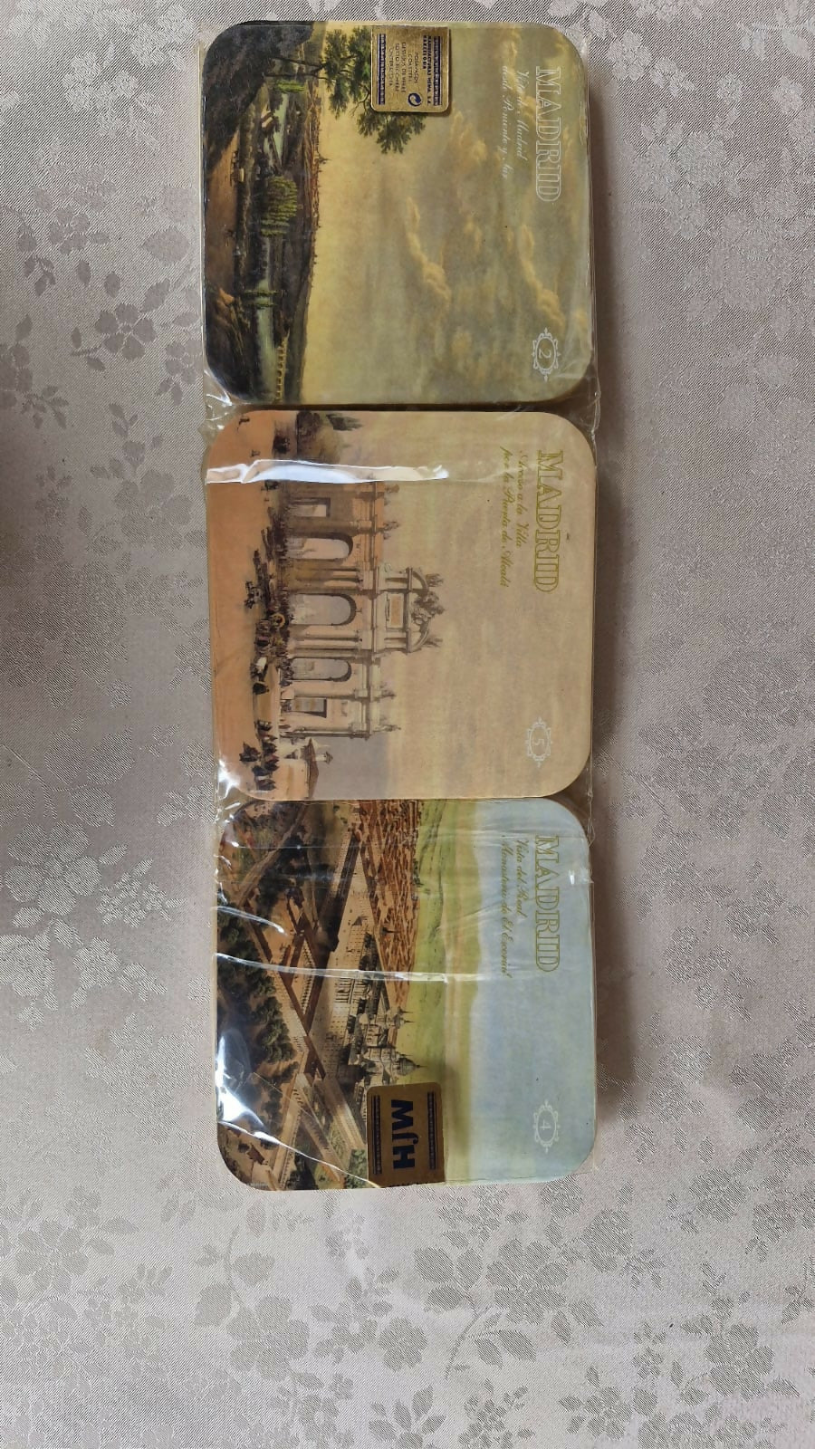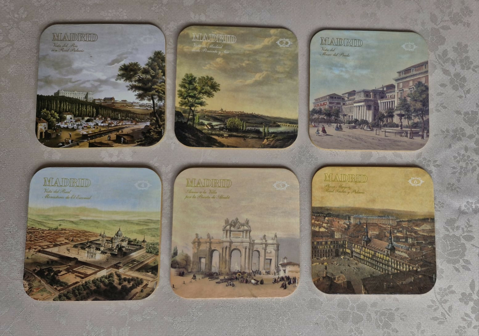 Lindo conjunto com 6 porta-copos de madeira confeccionados em Barcelona, com fotos de pontos turísticos de Madri. Embalagem original da loja Manufacturas Hema - Barcelona, em que foi adquirido.