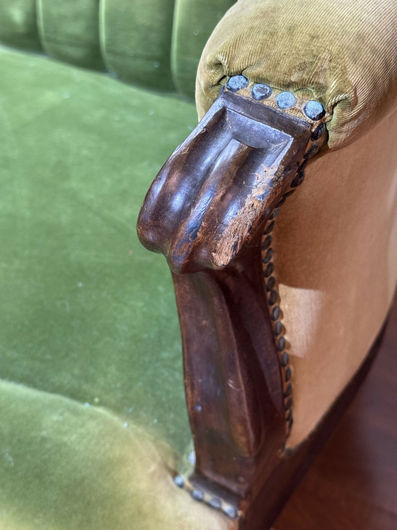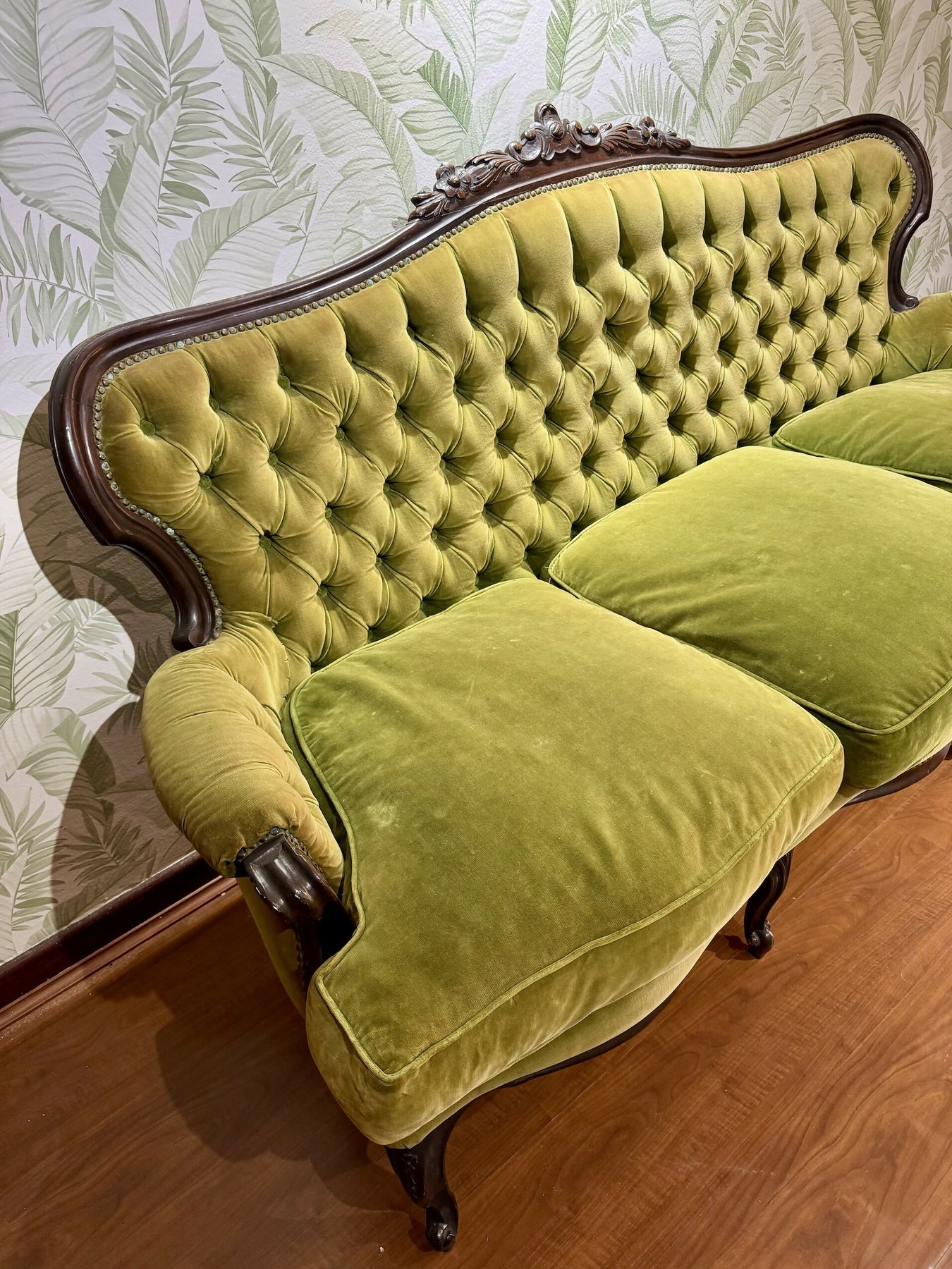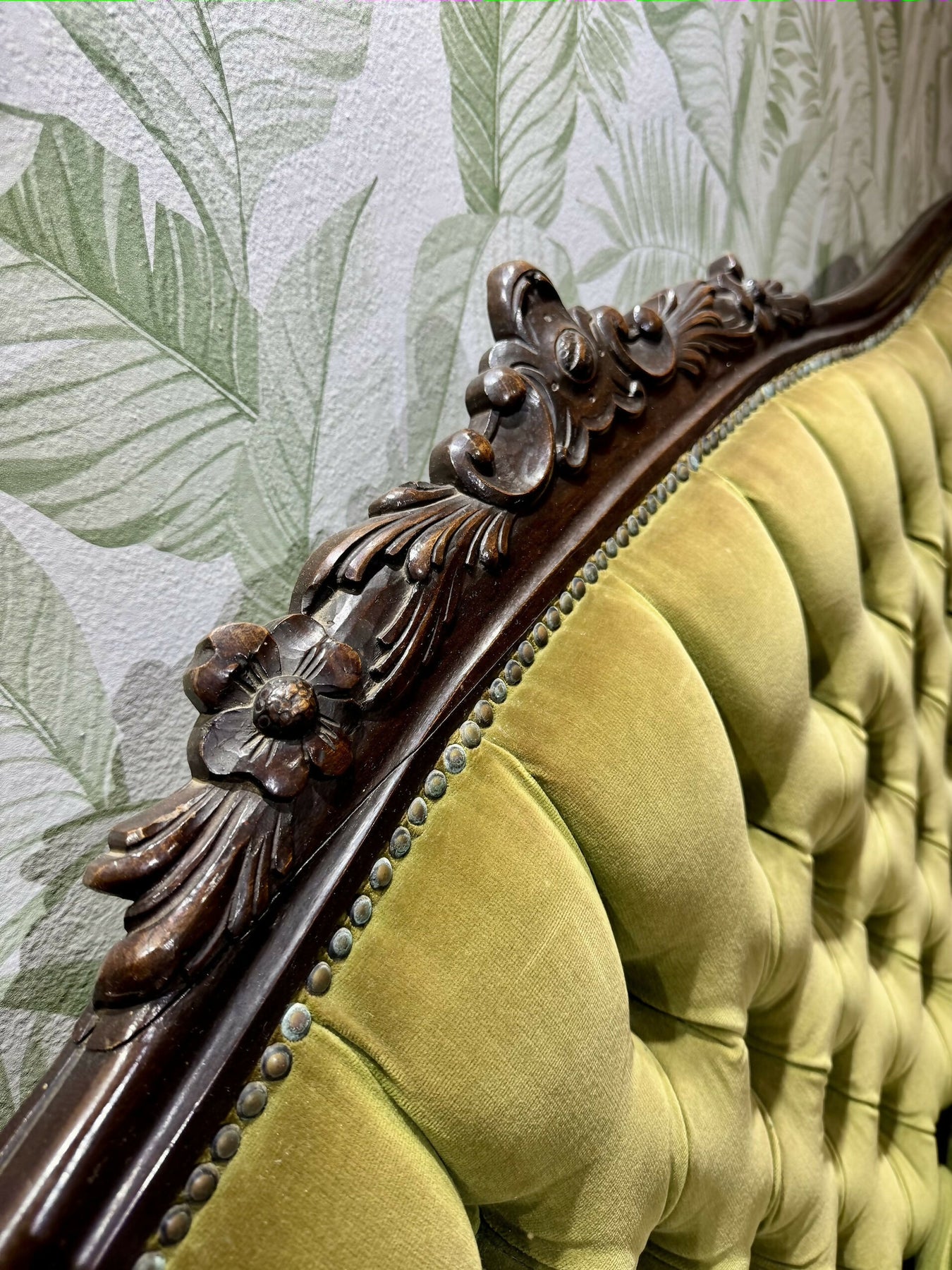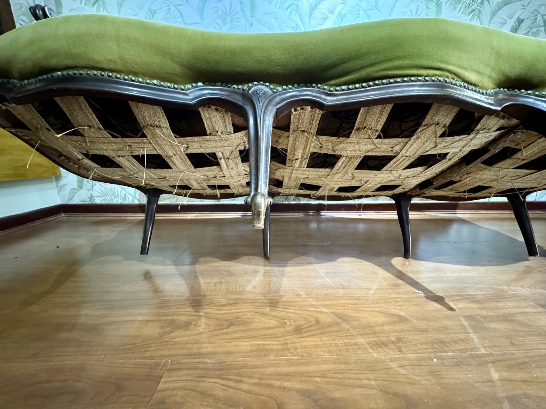Antigo sofá Luis XV modelo Palaciano. Em tecido veludo verde original e encosto em captone. Estofado em plumas de ganso.
