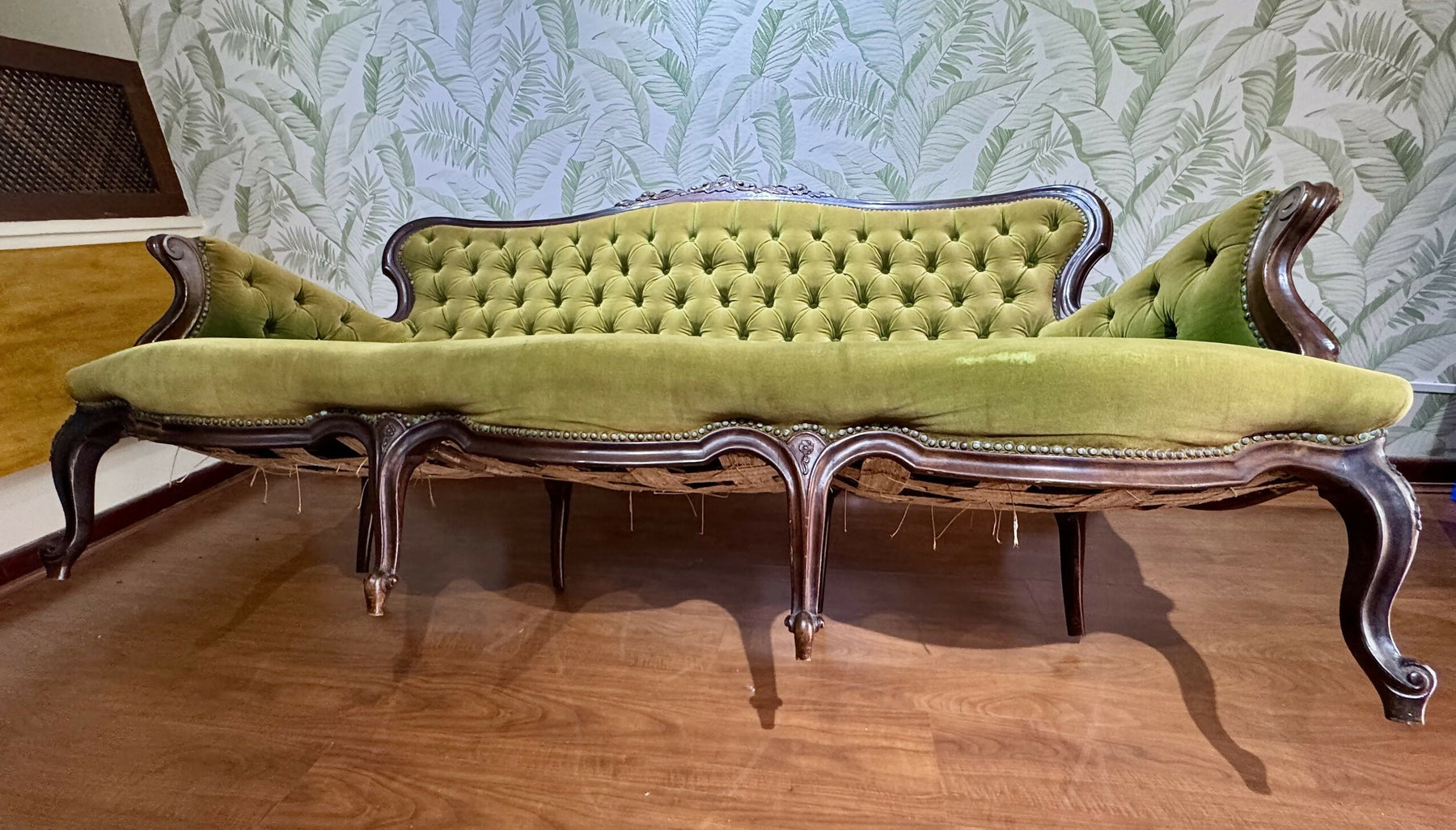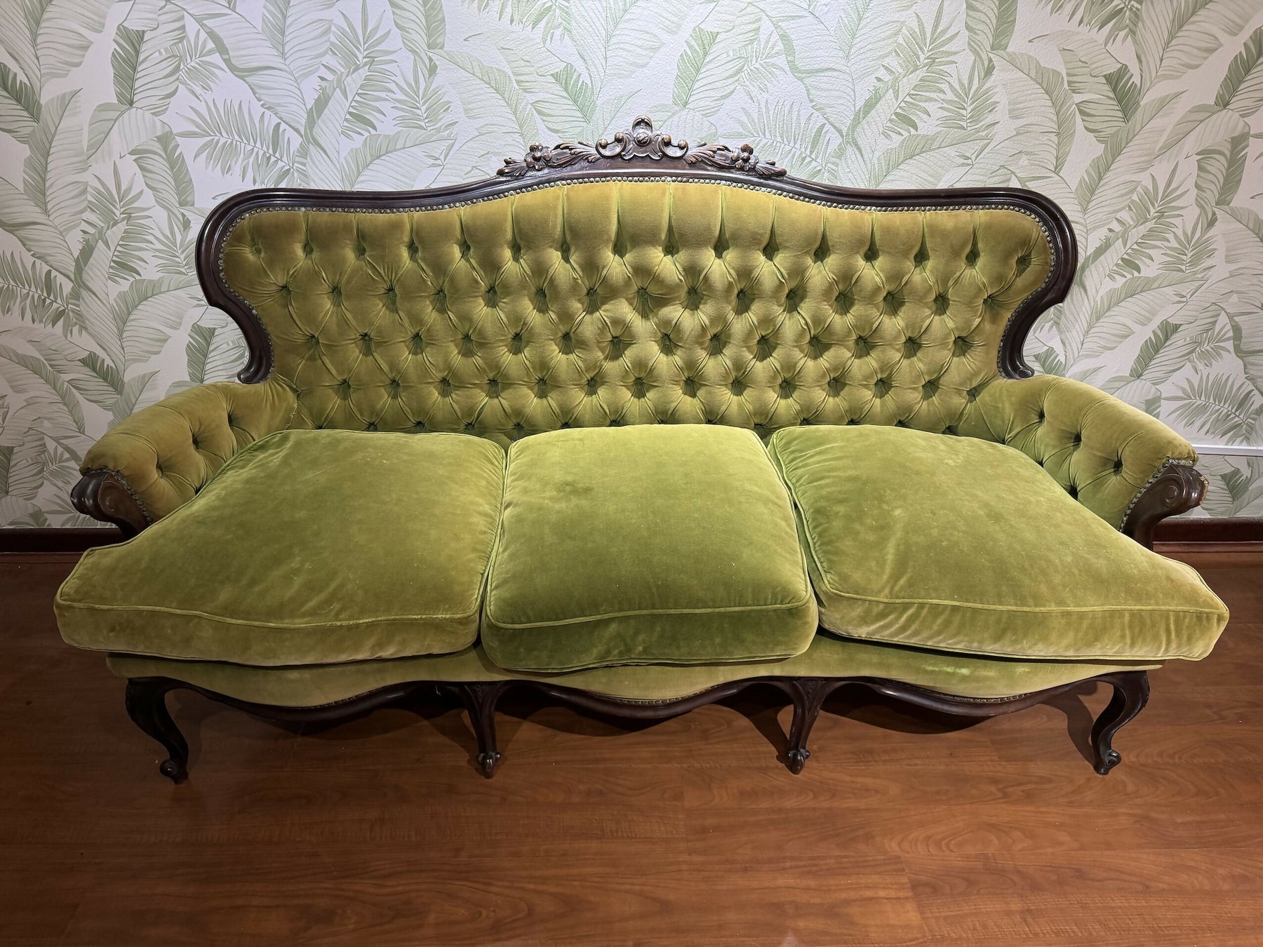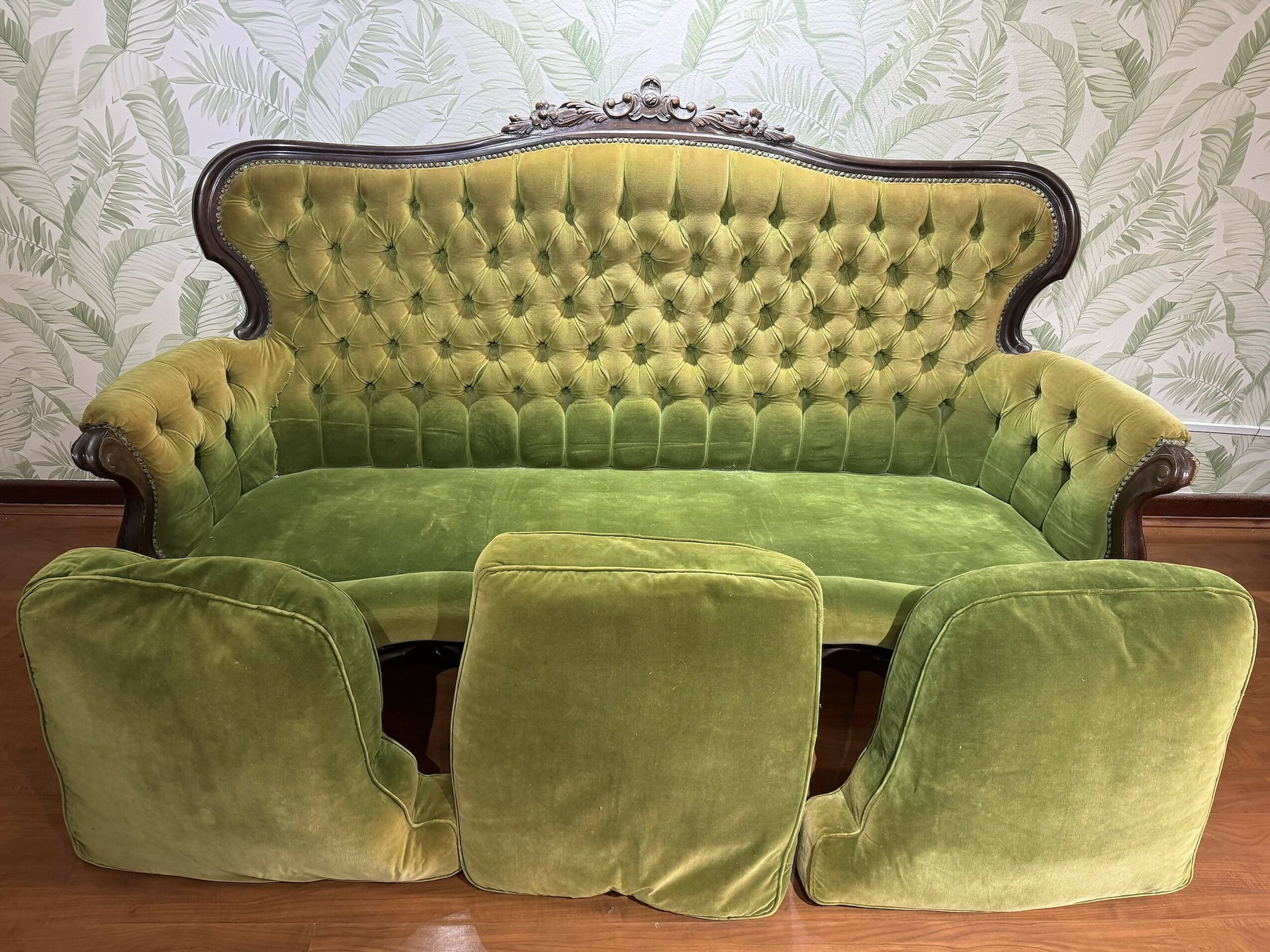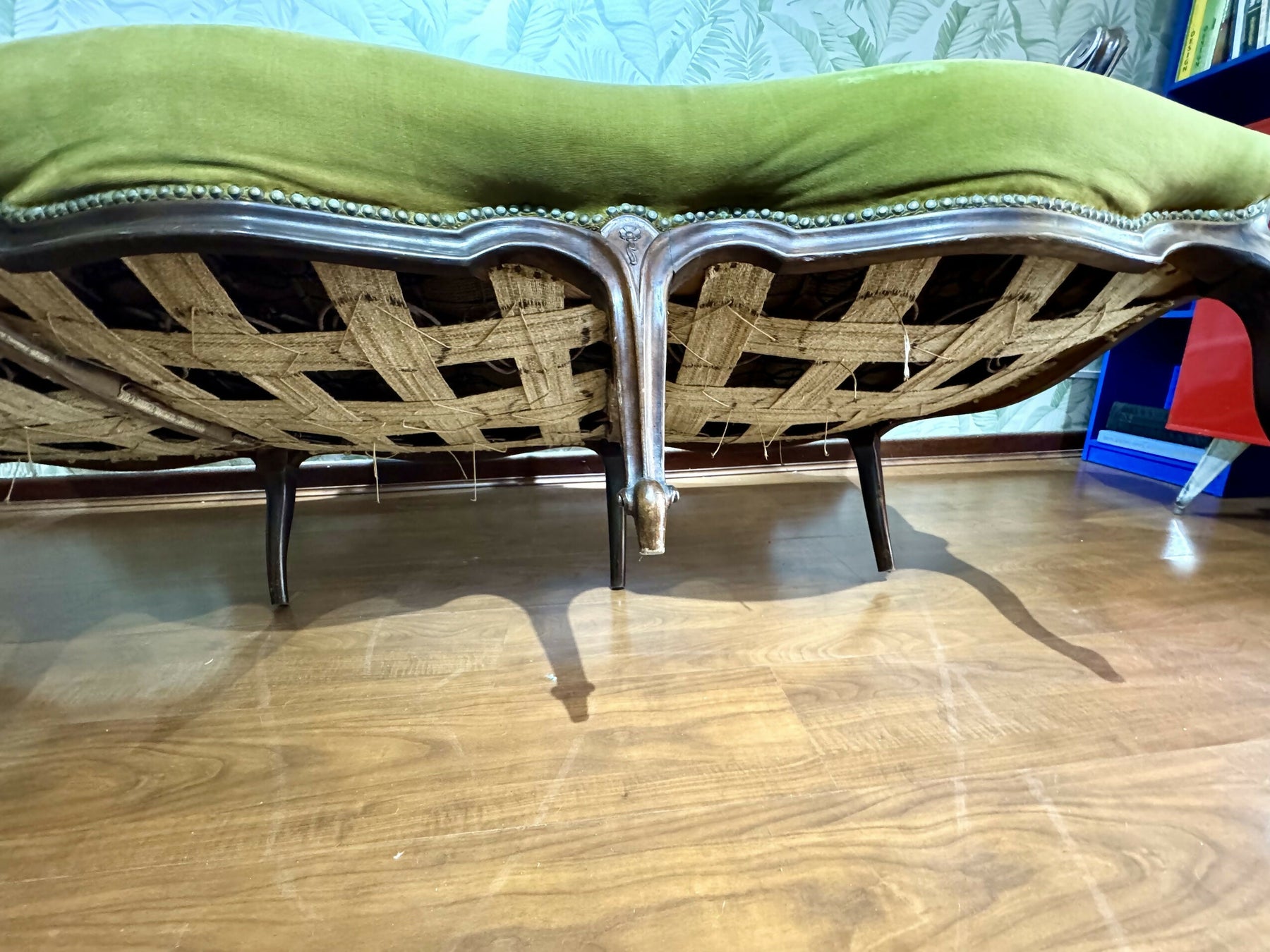 Antigo sofá Luis XV modelo Palaciano. Em tecido veludo verde original e encosto em captone. Estofado em plumas de ganso.