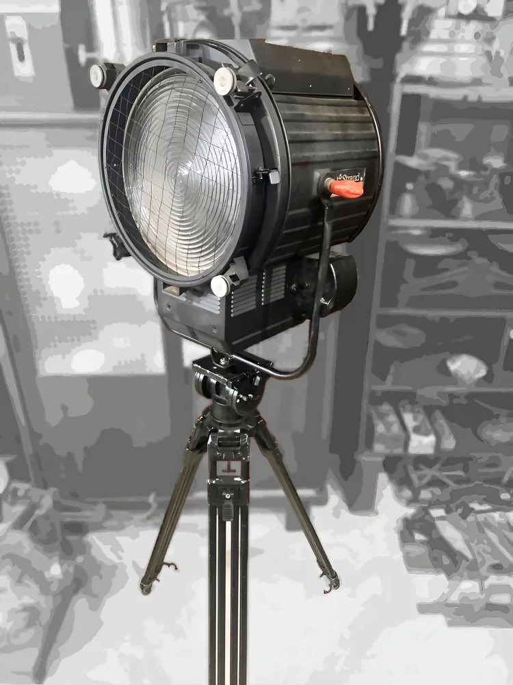 Jogo composto por refletor + tripé (visual original com pequenos desgastes do tempo) e tripé. Funcionamento revisado (soquete, plugs e fiação), tamanho (DxA: 42x34cm) e vidro raiado / Fresnel (original)