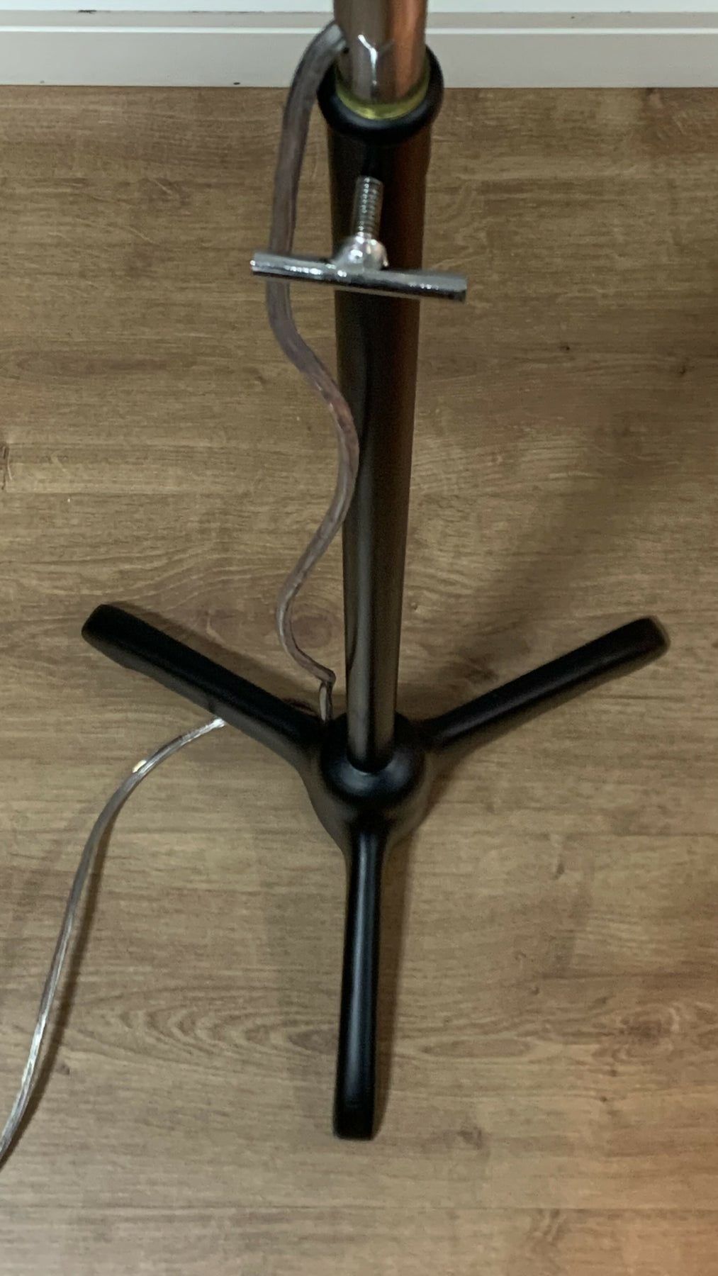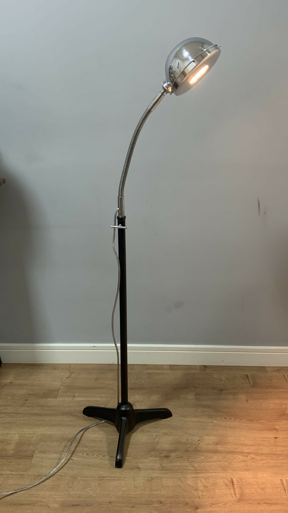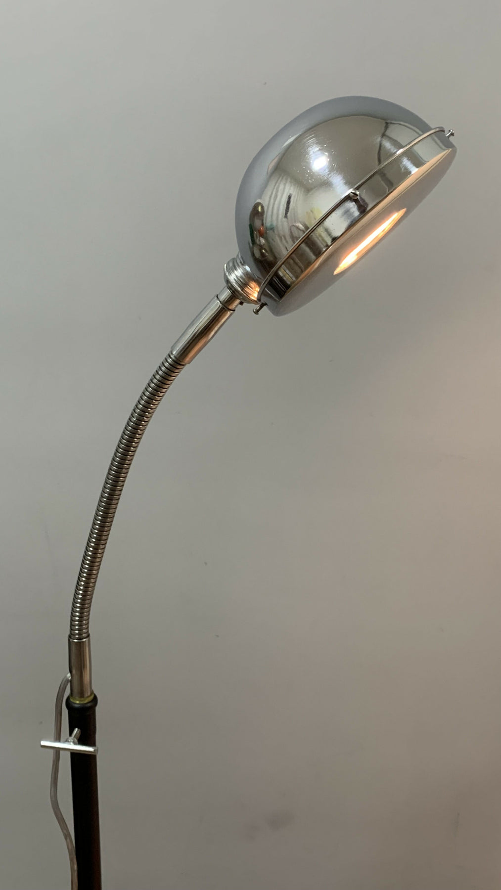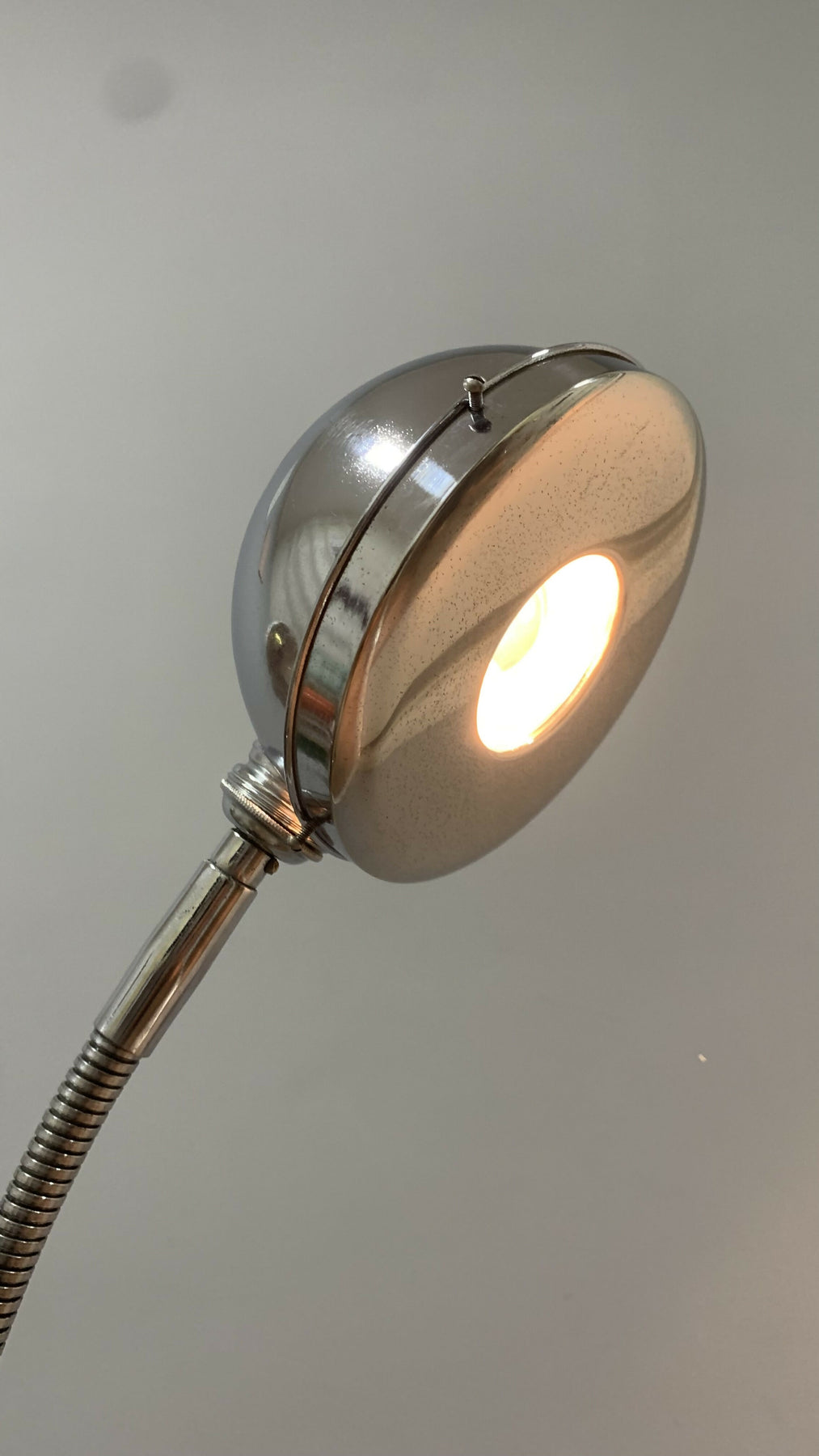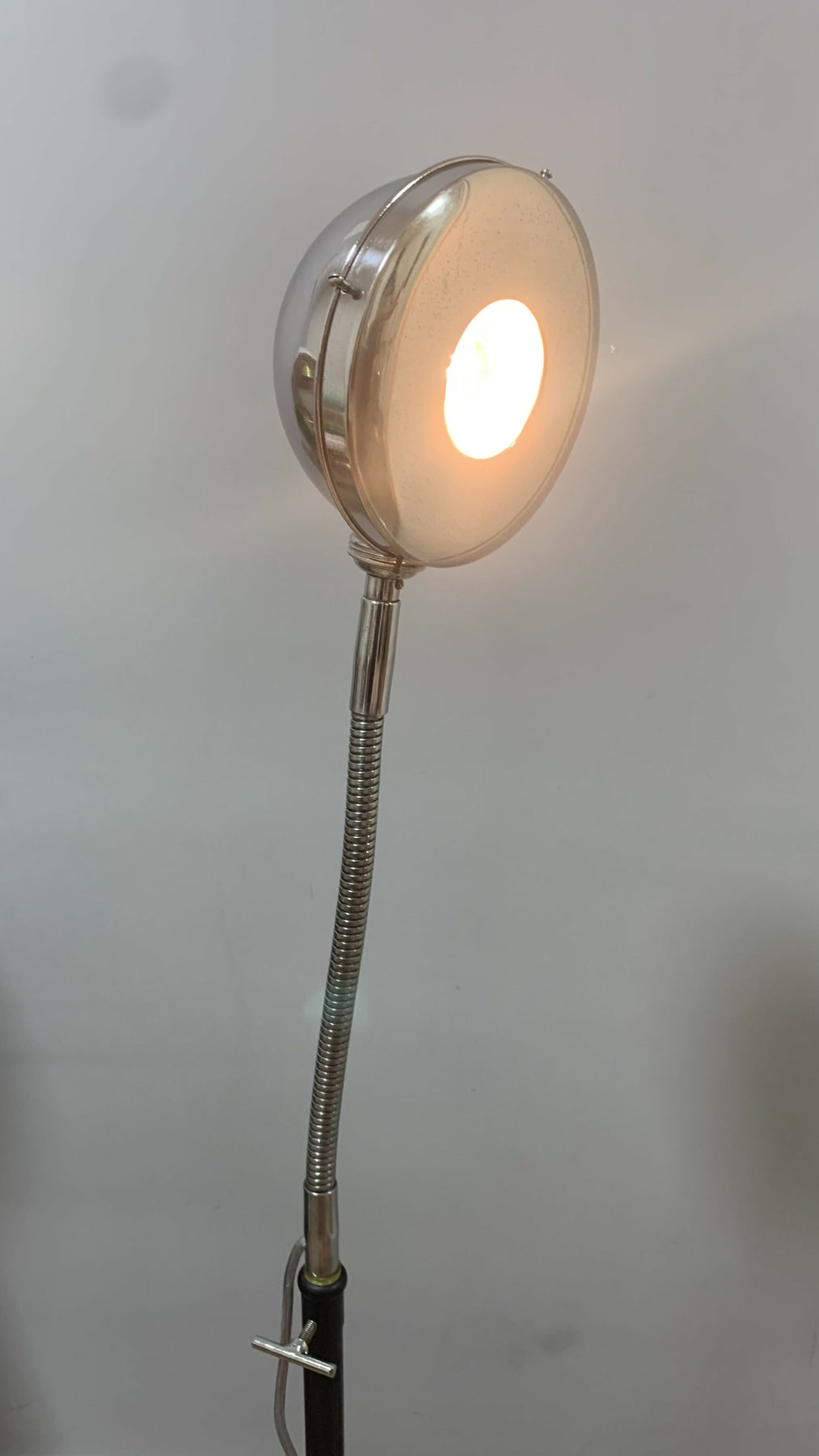 Linda luminária de piso confeccionada em metal modelo Eye Ball da chamada época Space Age que teve início na década de 50 e se estendeu até meados da década de 70. A sua haste flexível cromada permite posicionar a luz na posição de sua preferência e sua cúpula cromada possui uma espécie de tampa que permite focar melhor o objeto necessário mas também pode ser retirado e com isso permitir uma luz mais suave com o foco mais aberto. Sua base é  em metal preto fosco. Uma peça rara e linda para decorar o seu espaço. Nessa vovozinha consta algumas marcas do tempo mas não tira a sua beleza e utilidade.