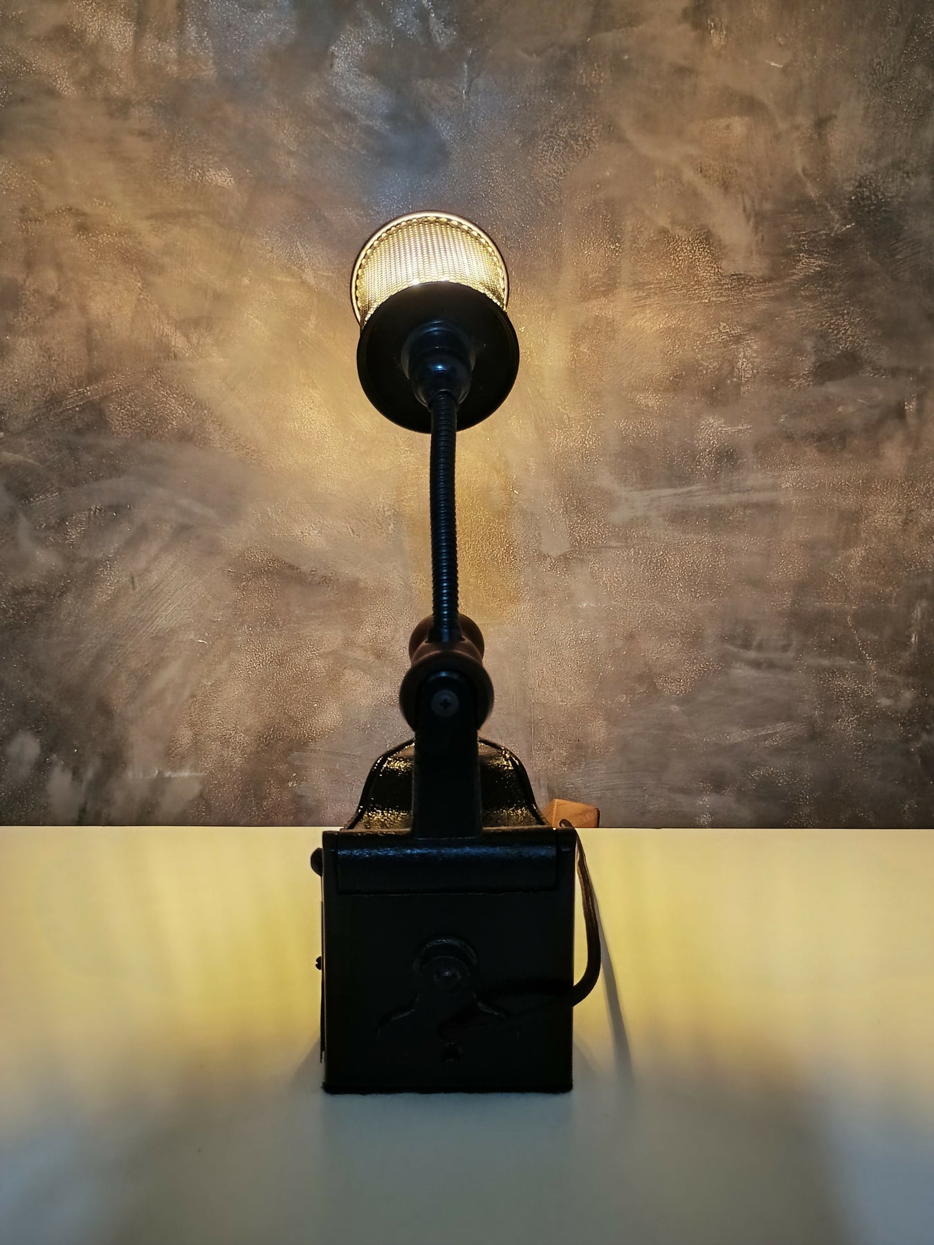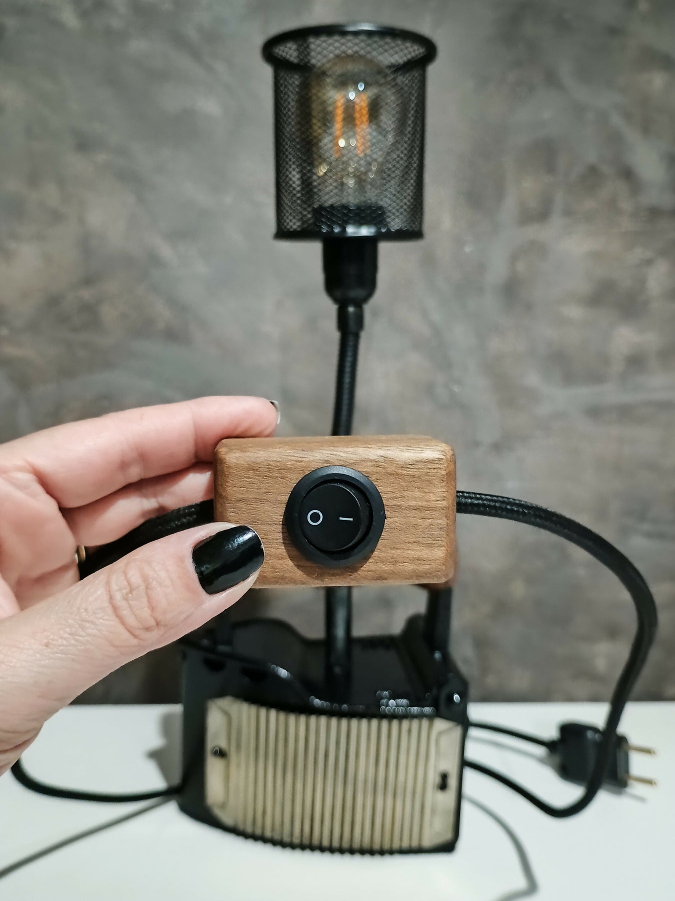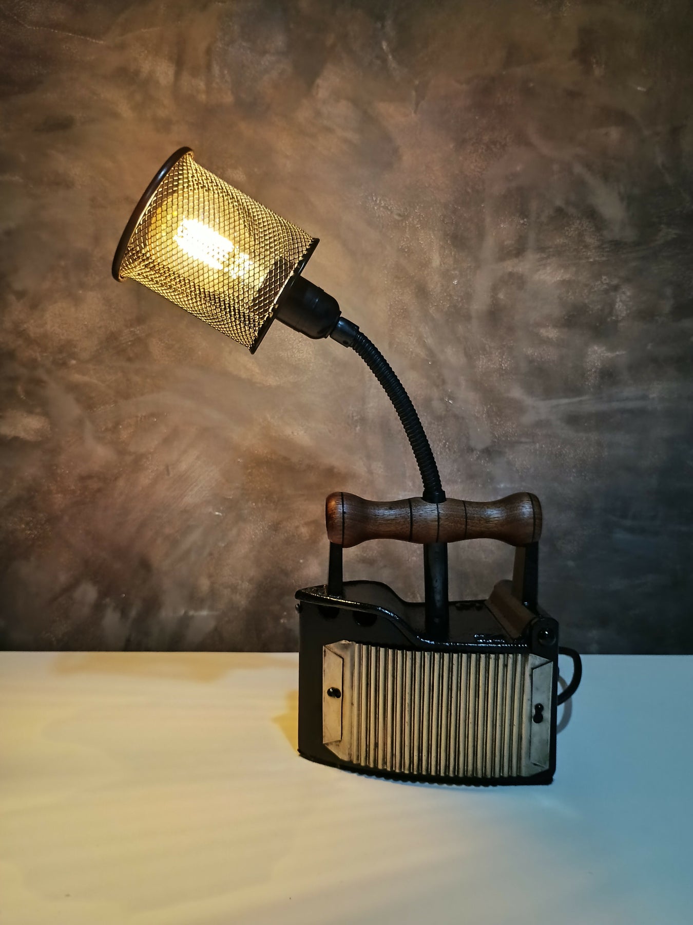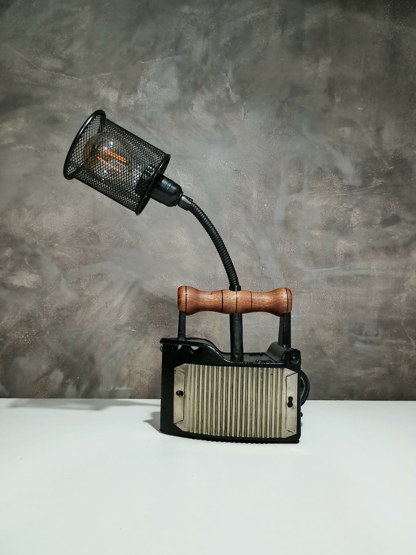 Contar um pouco da história dela: ferro tamanho mini que foi encontrado na feirinha do Capitólio, na capital do Rio Grande do Sul, Porto Alegre, somado ao ferro que sustenta a lâmpada que é flexível e, por último o porta canetas aramado estilo industrial!