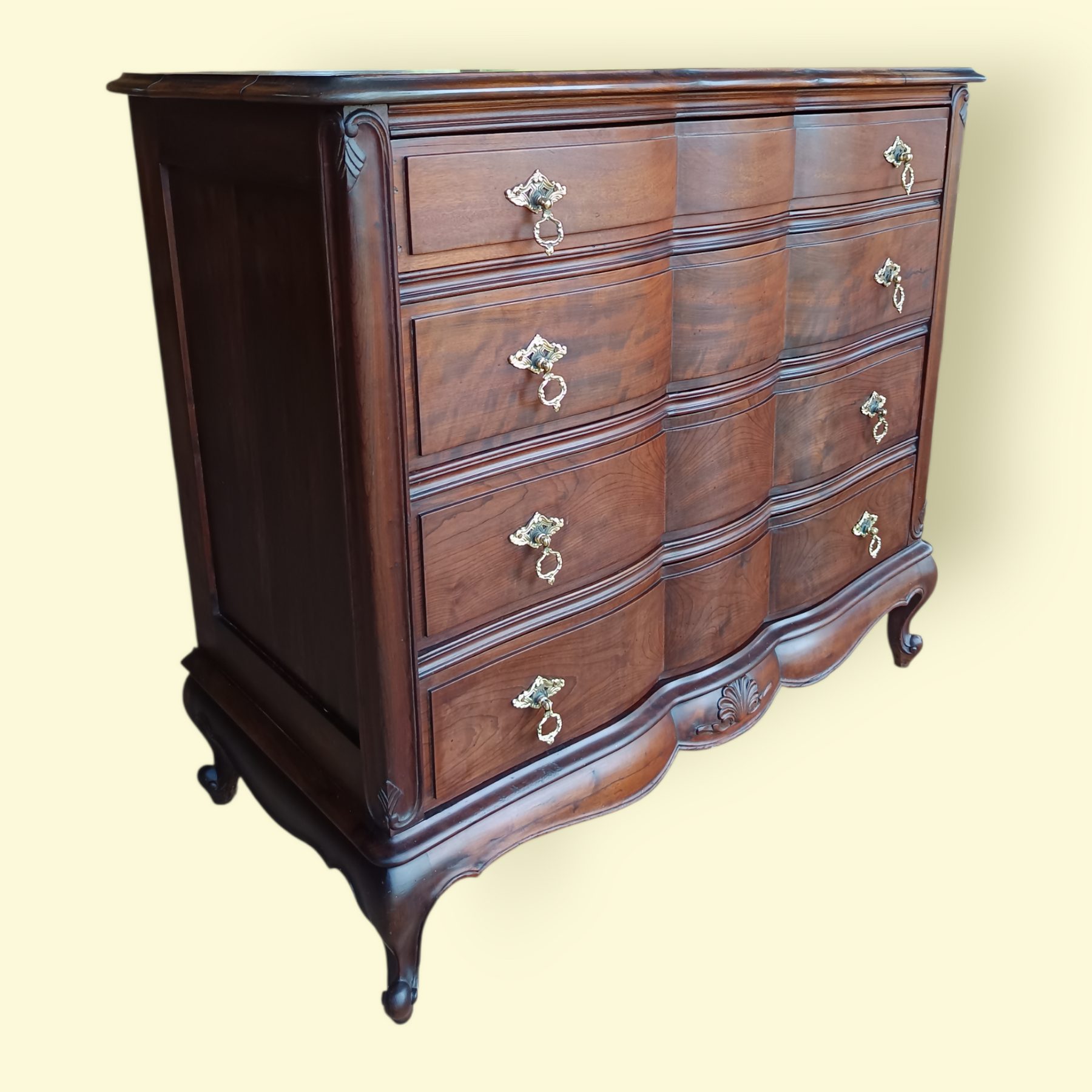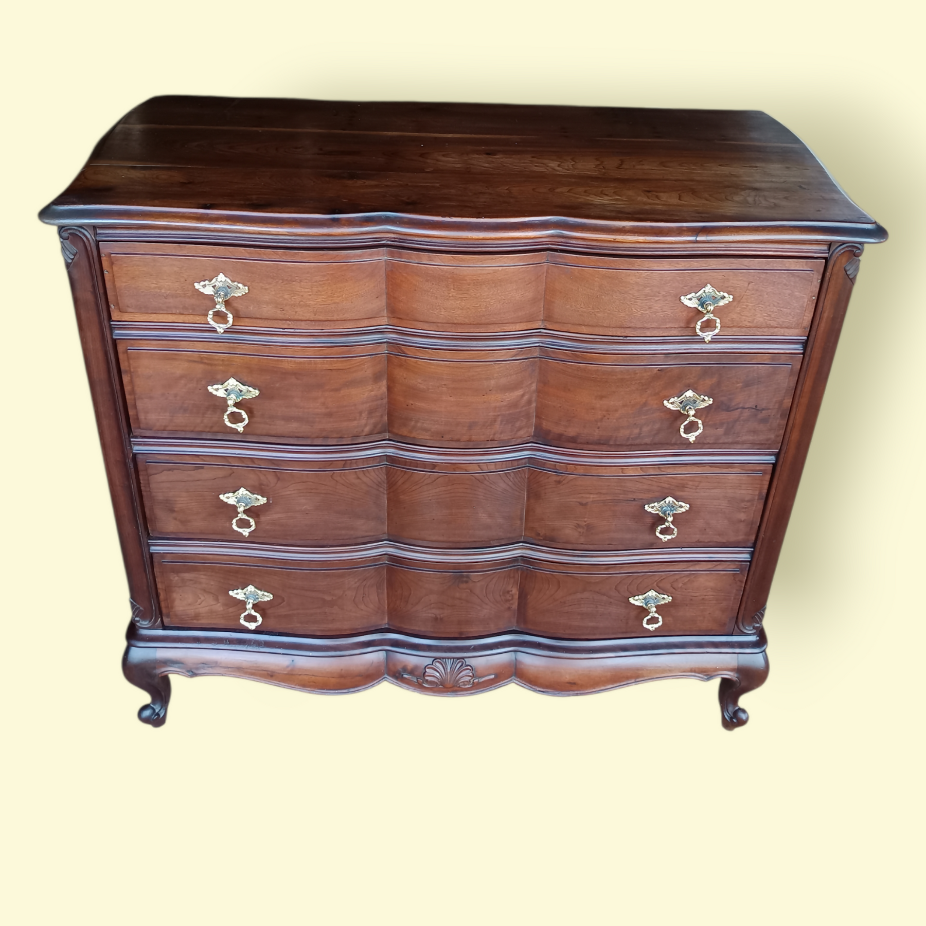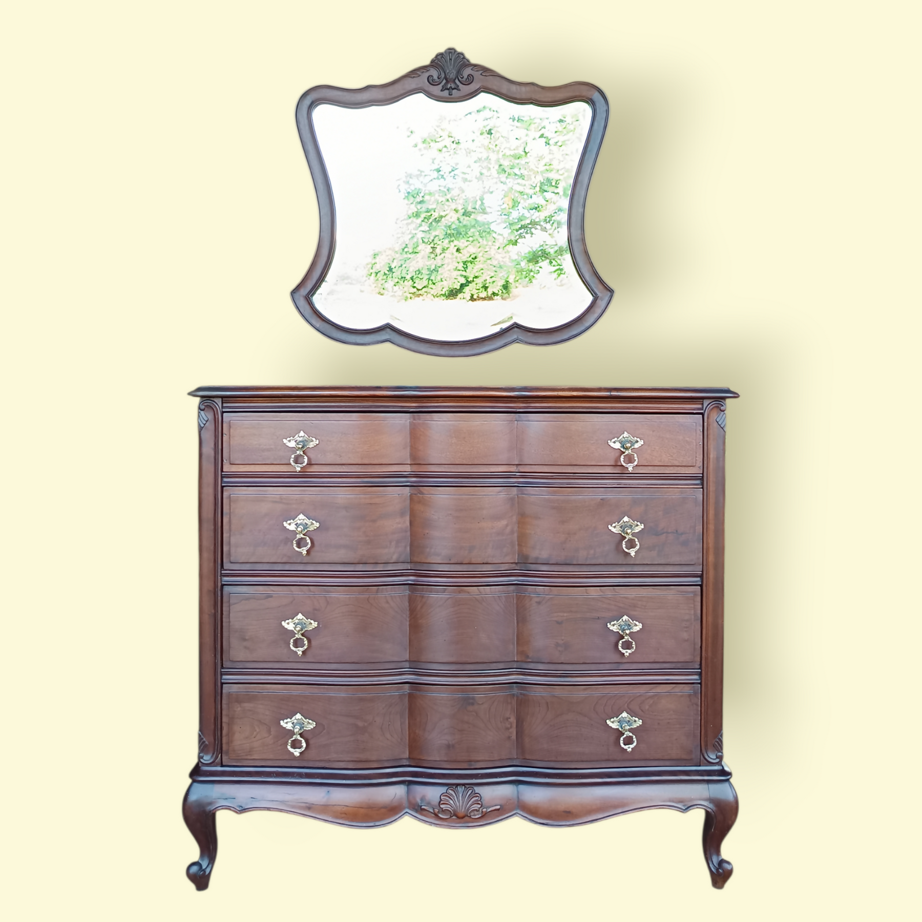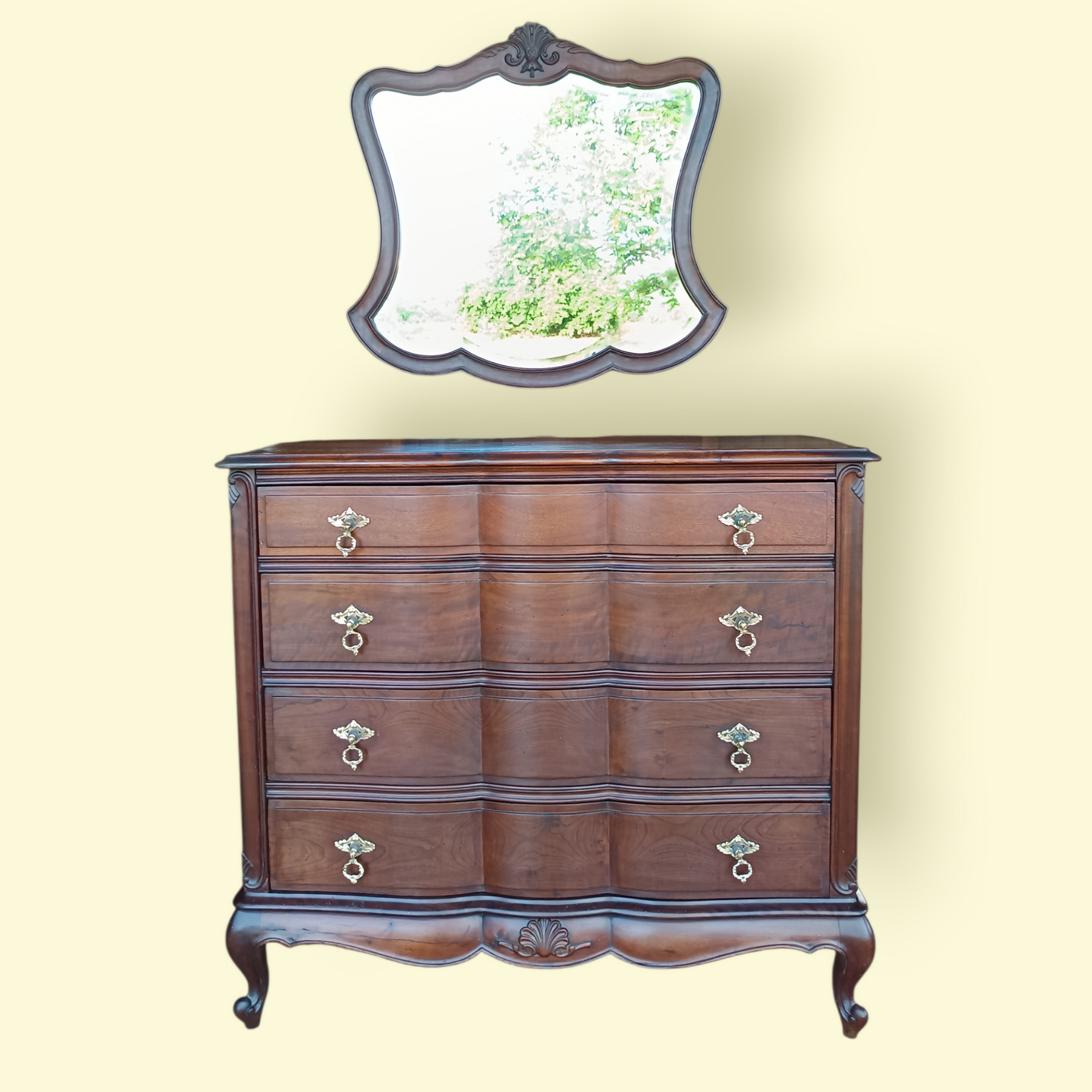 Cômoda sofisticada em madeira maciça, com design clássico de inspiração francesa. Possui linhas curvas elegantes, acabamento refinado e puxadores em Bronze que realçam sua nobreza. O espelho com moldura trabalhada completa a peça com charme e exclusividade.
