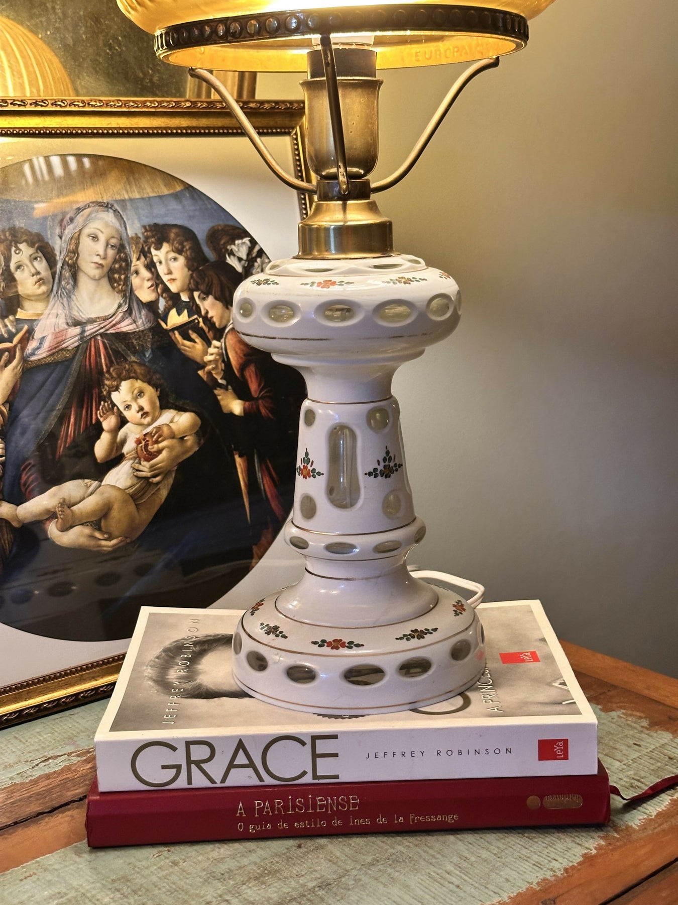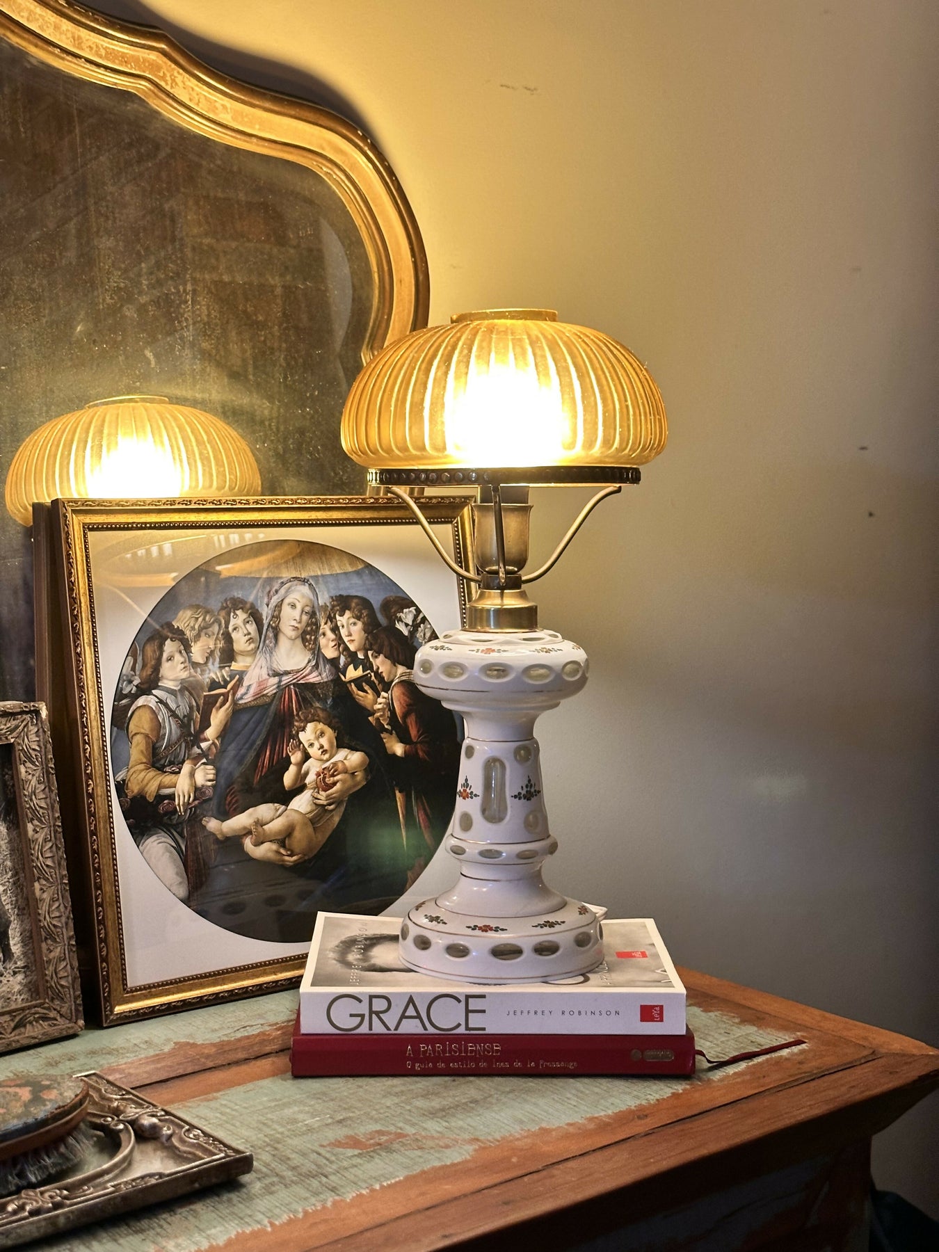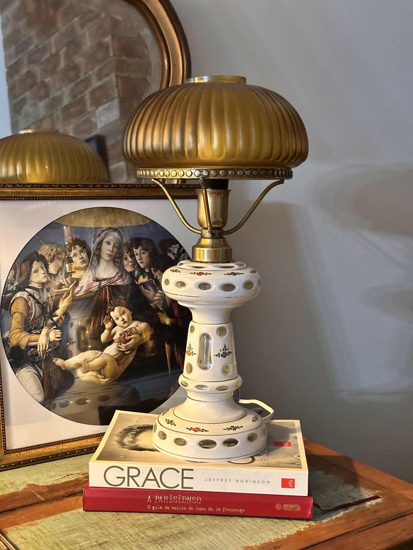 Maravilhoso e encantador abajur antigo em cristal overlay e pinturas de delicadas flores e cúpula em âmbar
