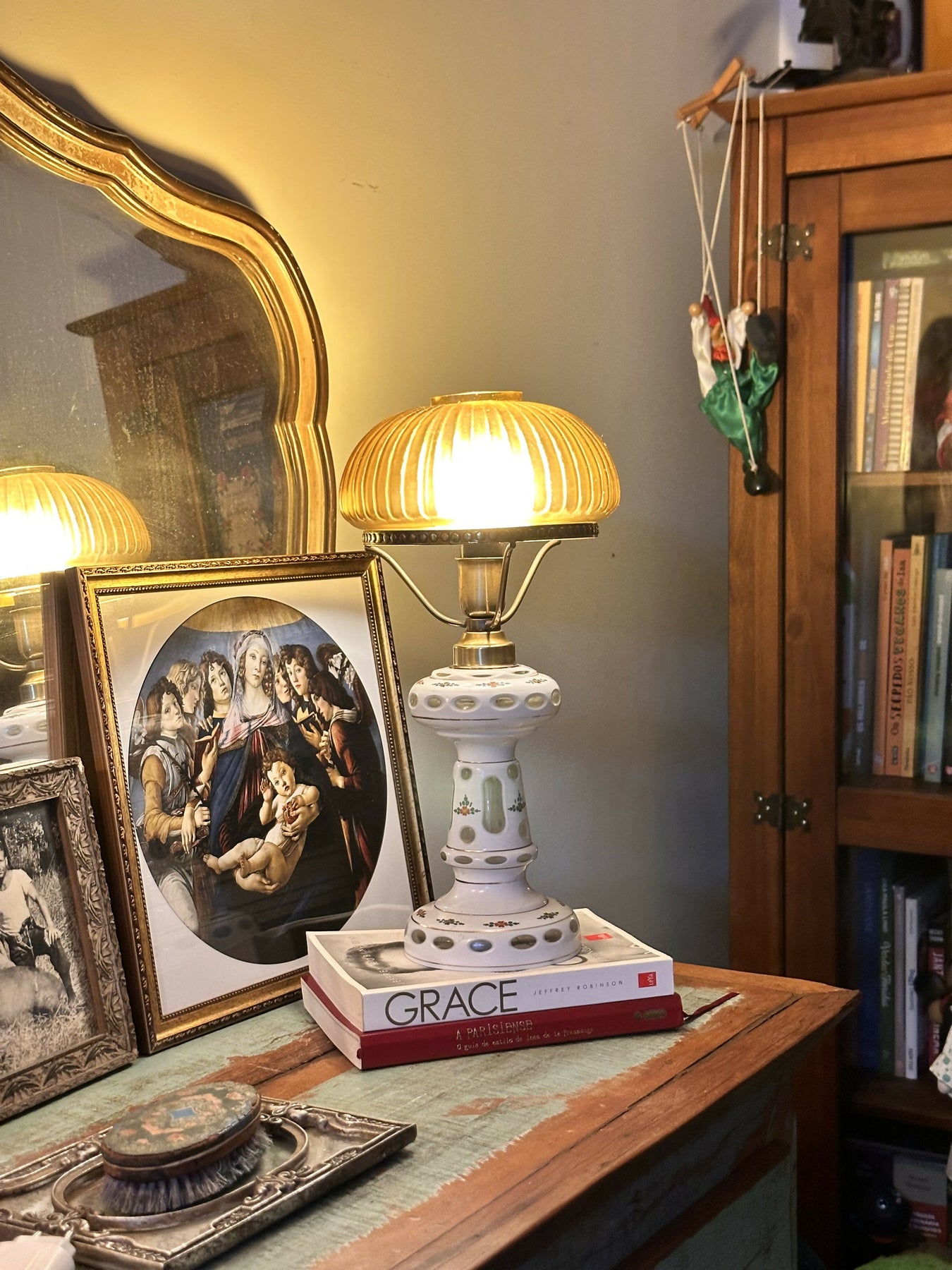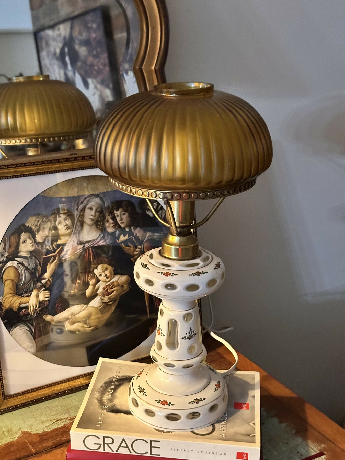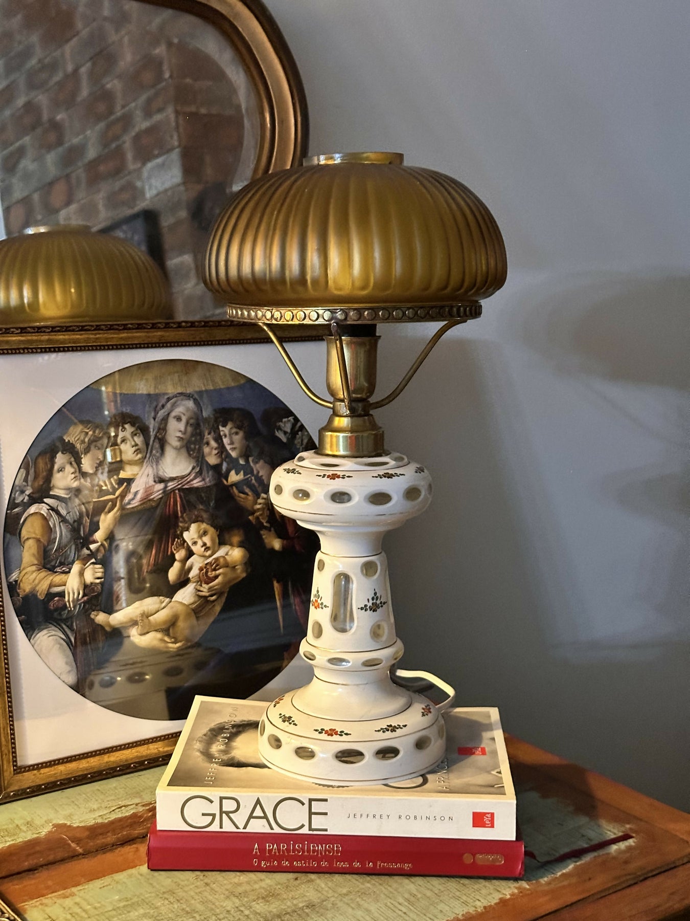 Maravilhoso e encantador abajur antigo em cristal overlay e pinturas de delicadas flores e cúpula em âmbar