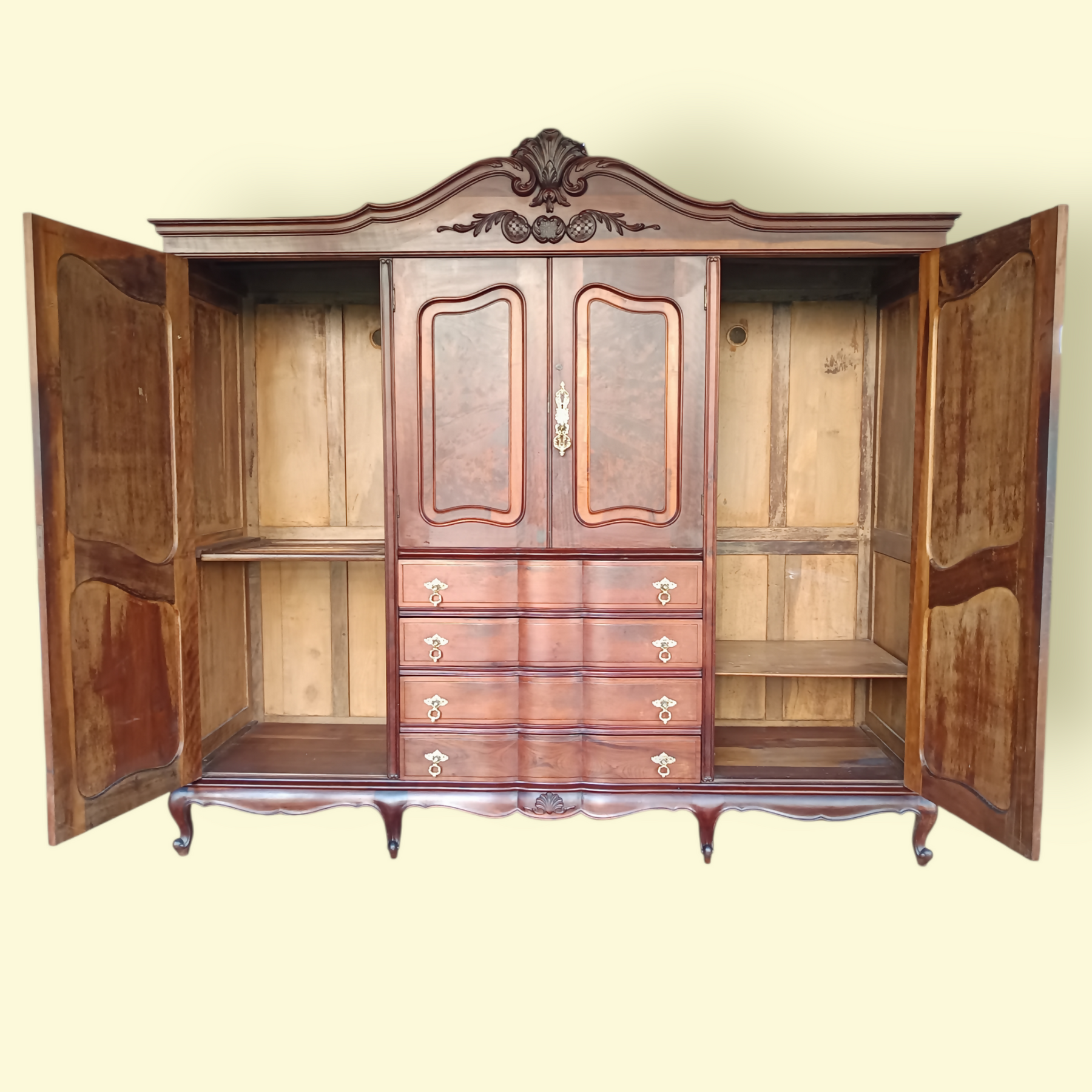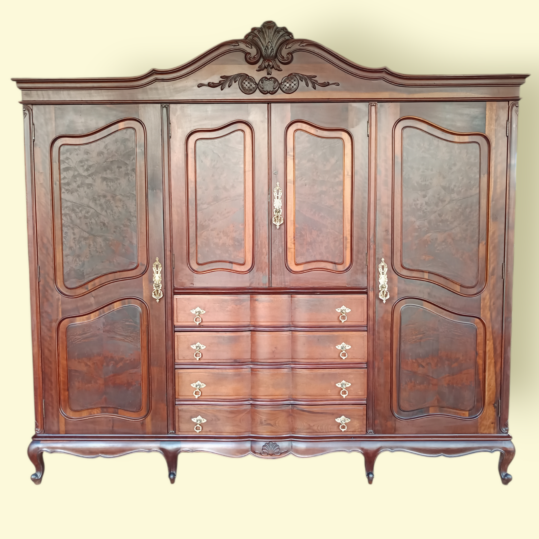 Móvel em madeira nobre, com design imponente e acabamento de alto padrão. Os entalhes delicados, linhas curvas e ferragens ornamentais revelam sofisticação atemporal, inspirada no estilo clássico europeu.