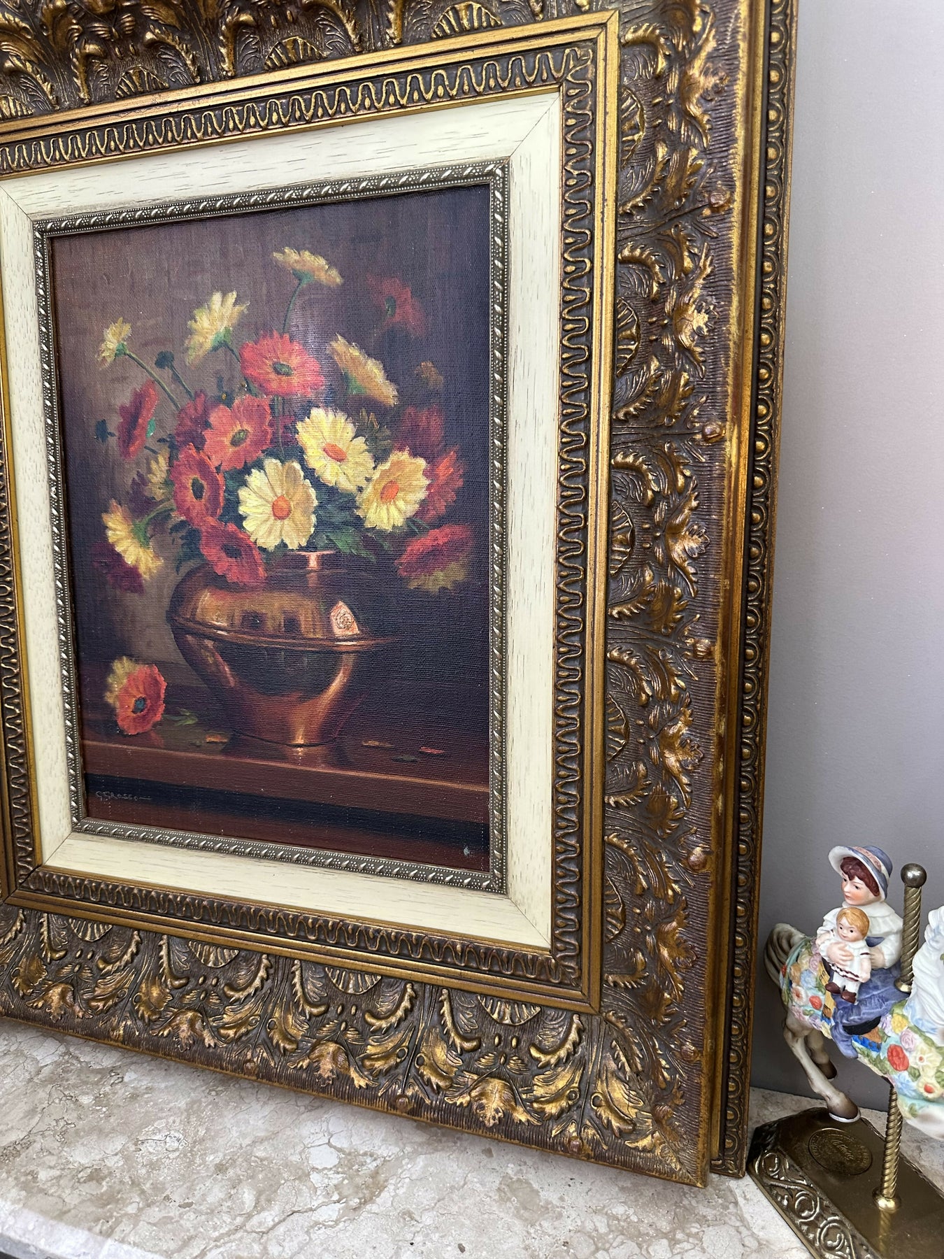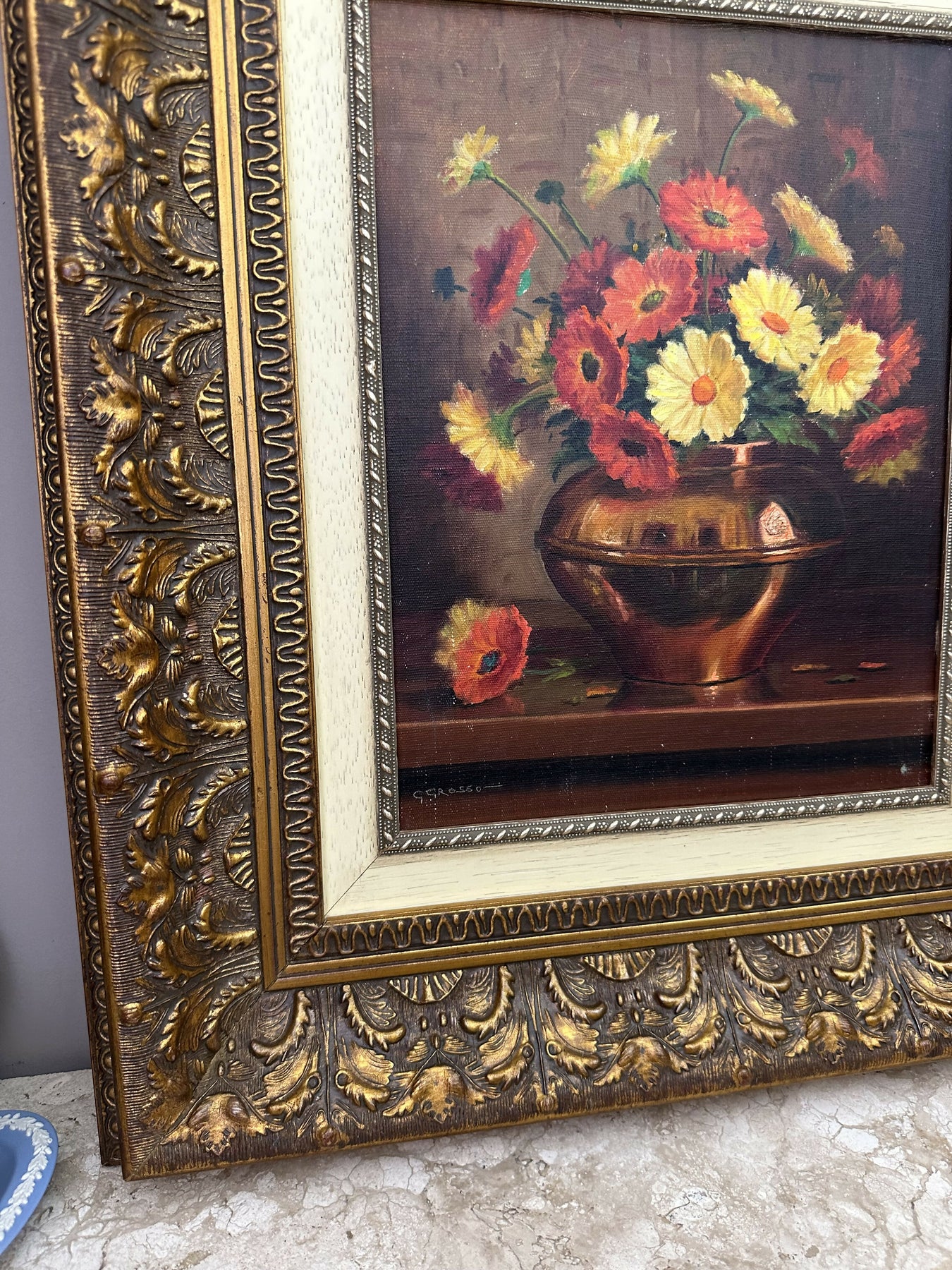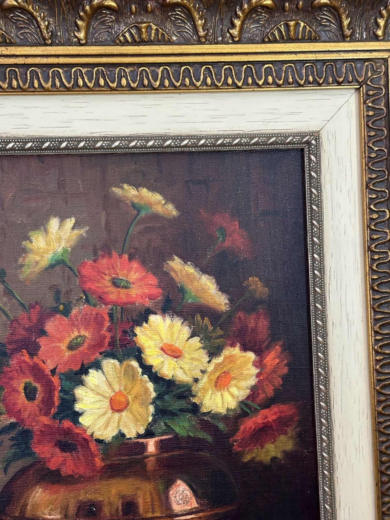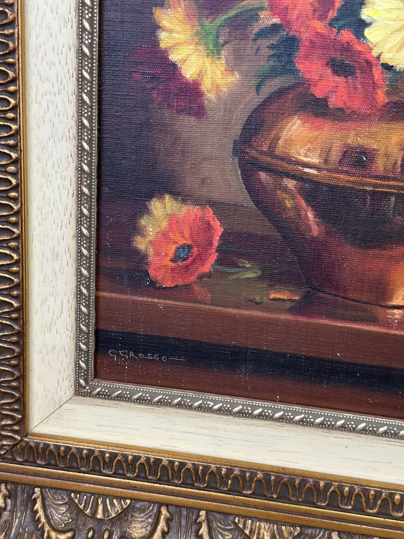 Maravilhoso quadro vintage de vaso de gérberas- pintura a óleo sobre tela OST - GUERINO GROSSO (Rio Claro, 1907 - São Paulo, 1988) e moldura ornamentada em madeira dourada