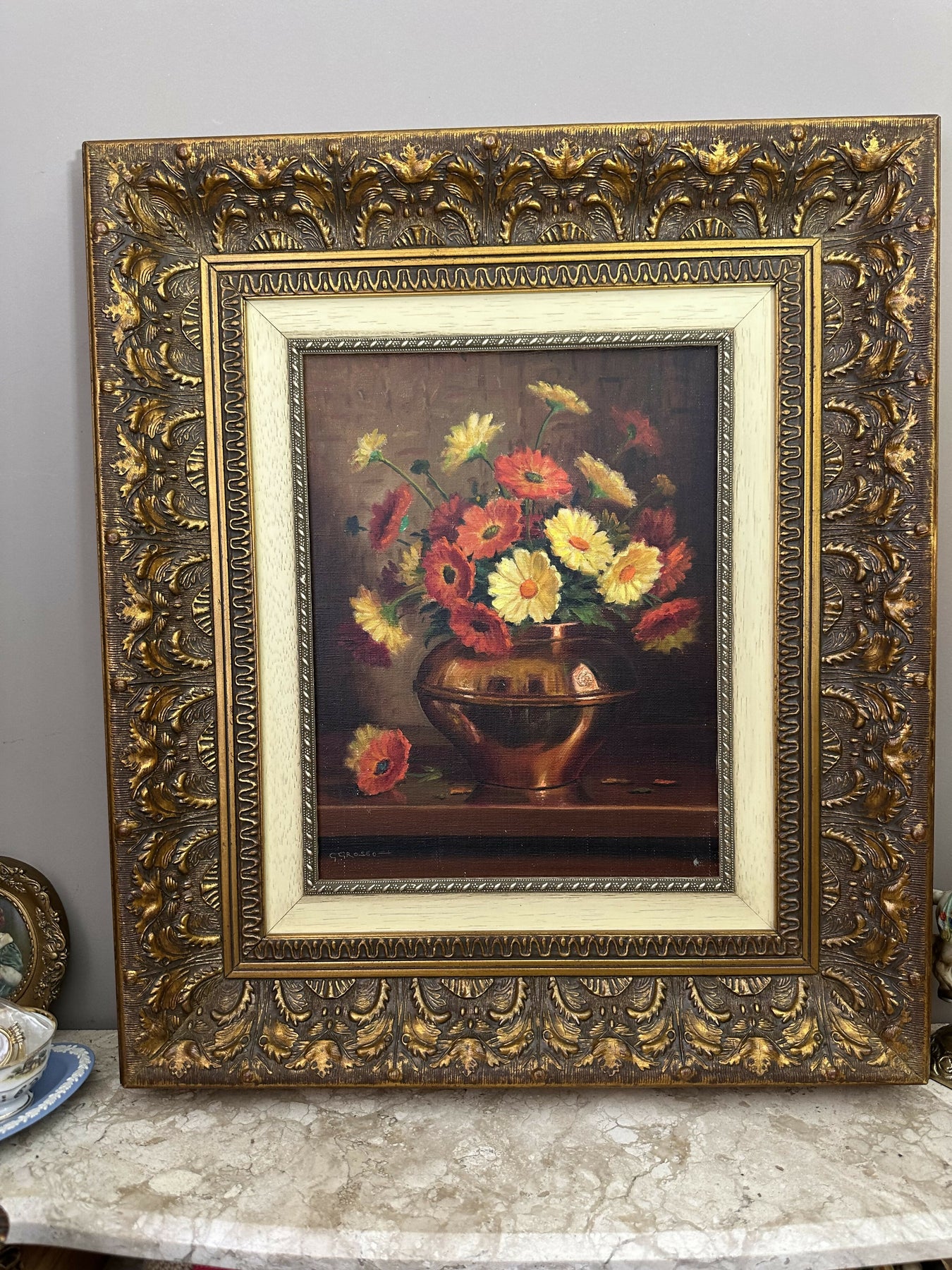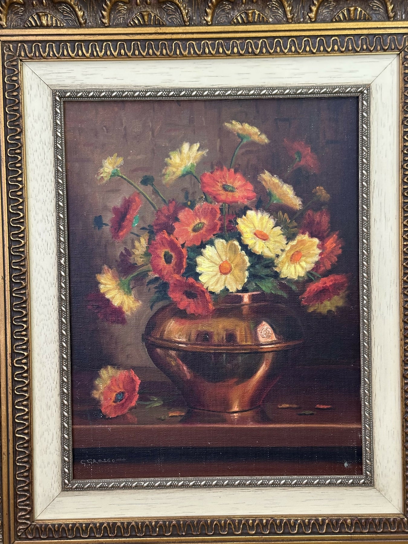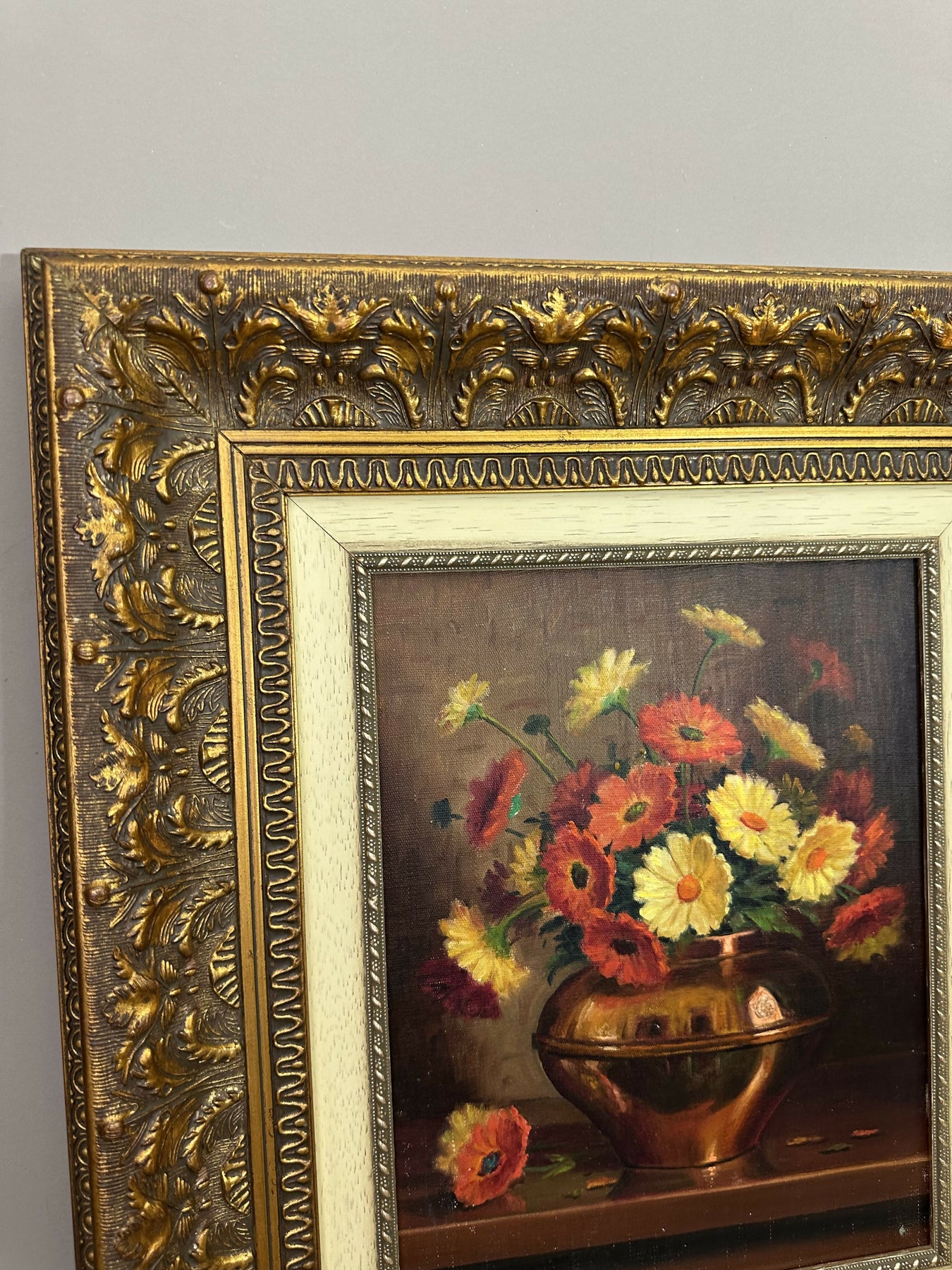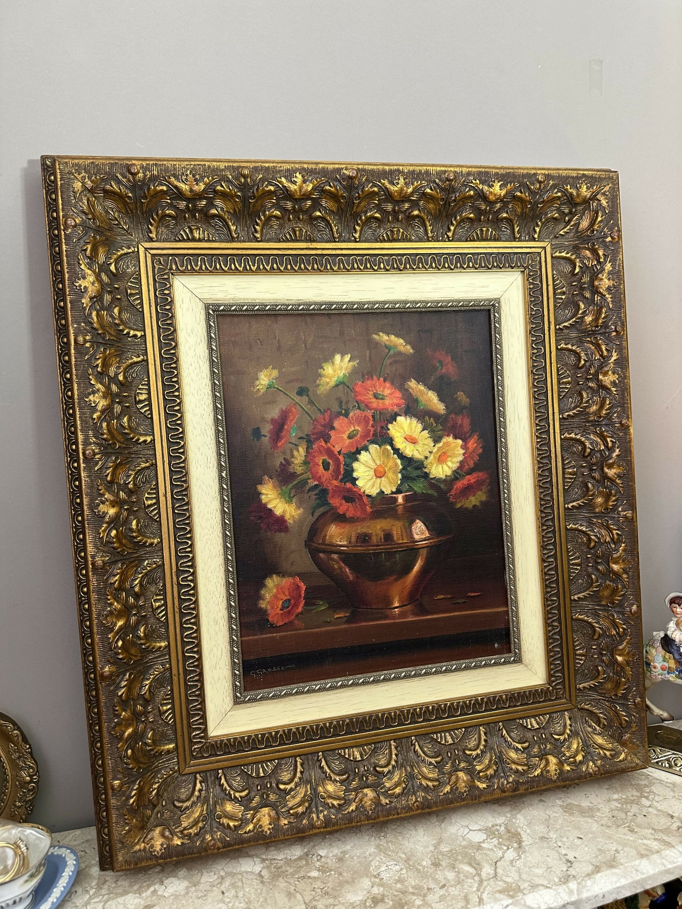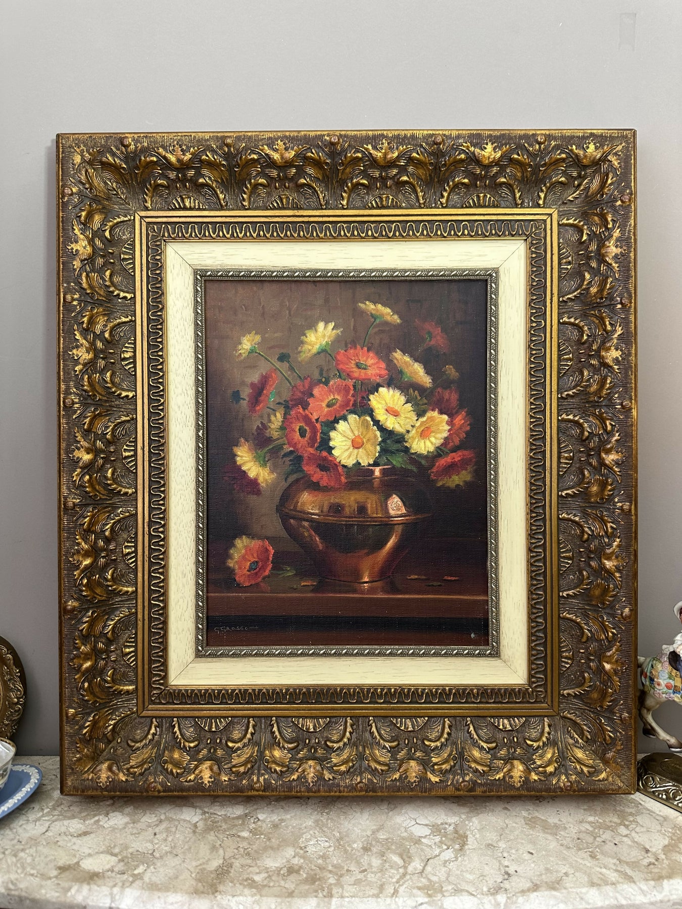 Maravilhoso quadro vintage de vaso de gérberas- pintura a óleo sobre tela OST - GUERINO GROSSO (Rio Claro, 1907 - São Paulo, 1988) e moldura ornamentada em madeira dourada
