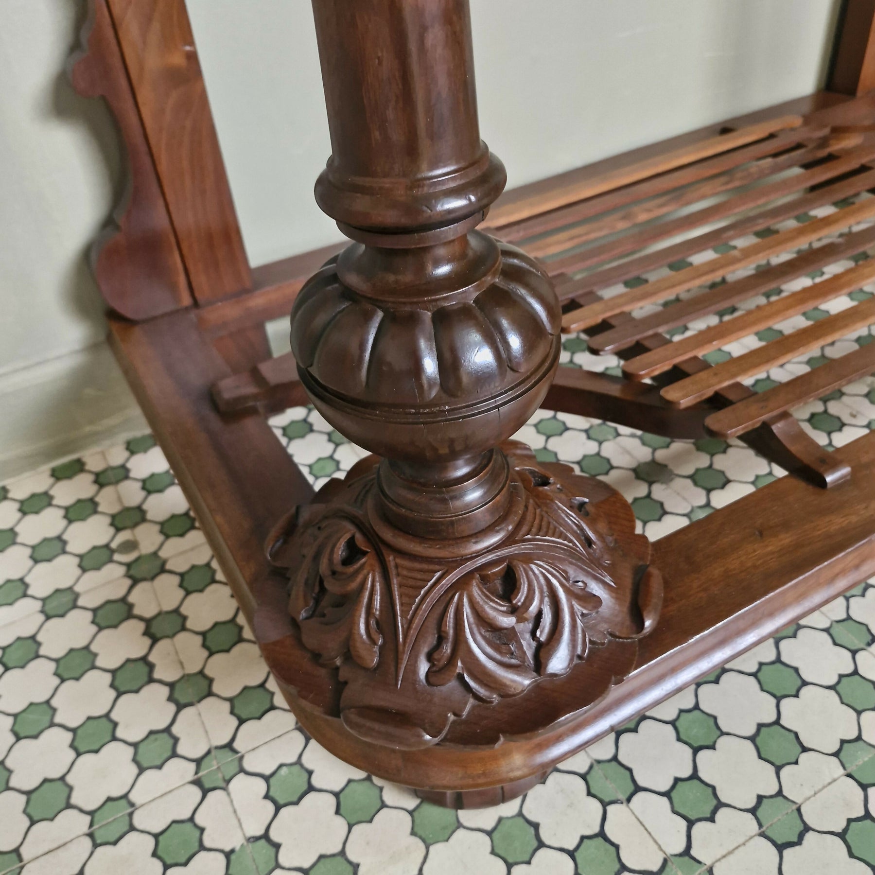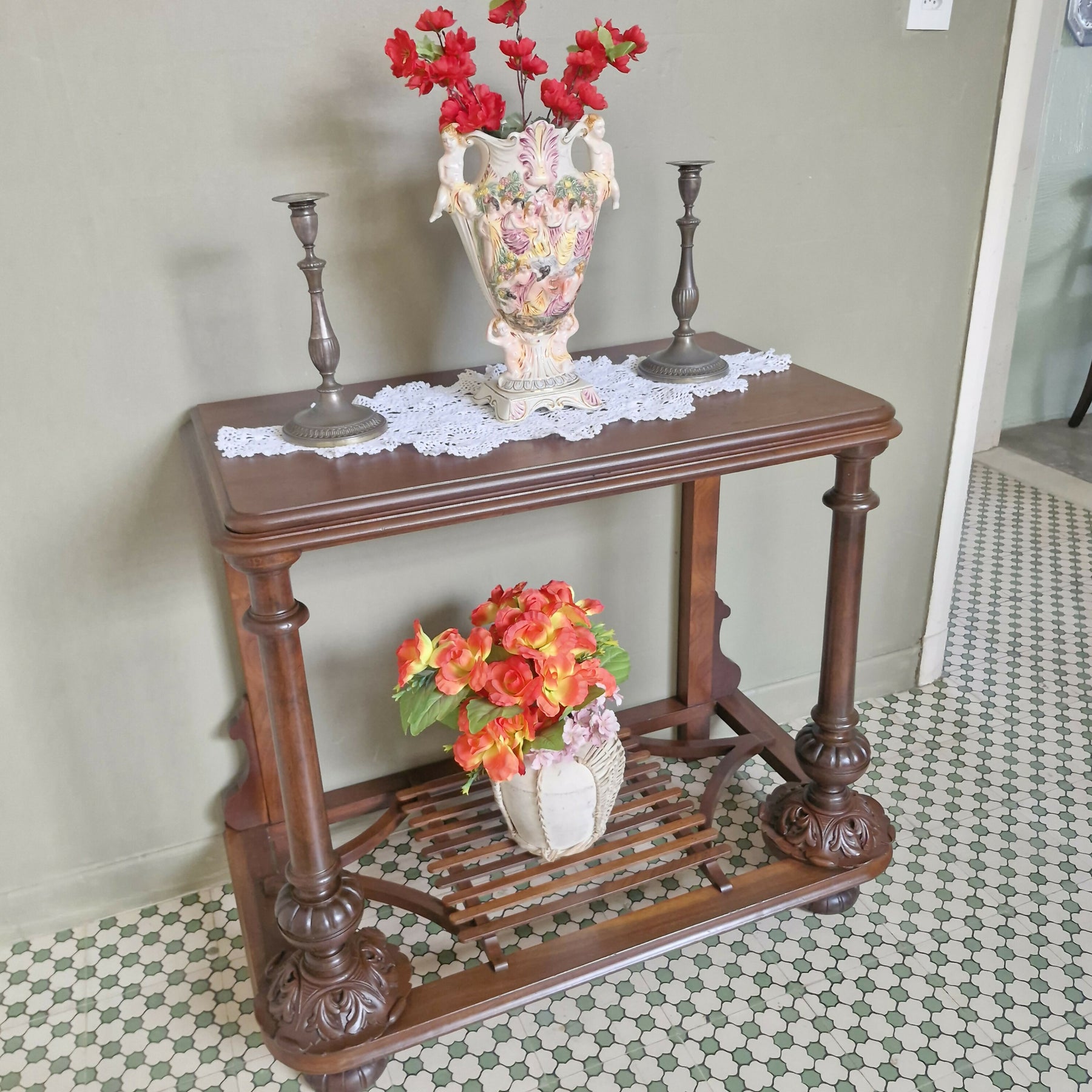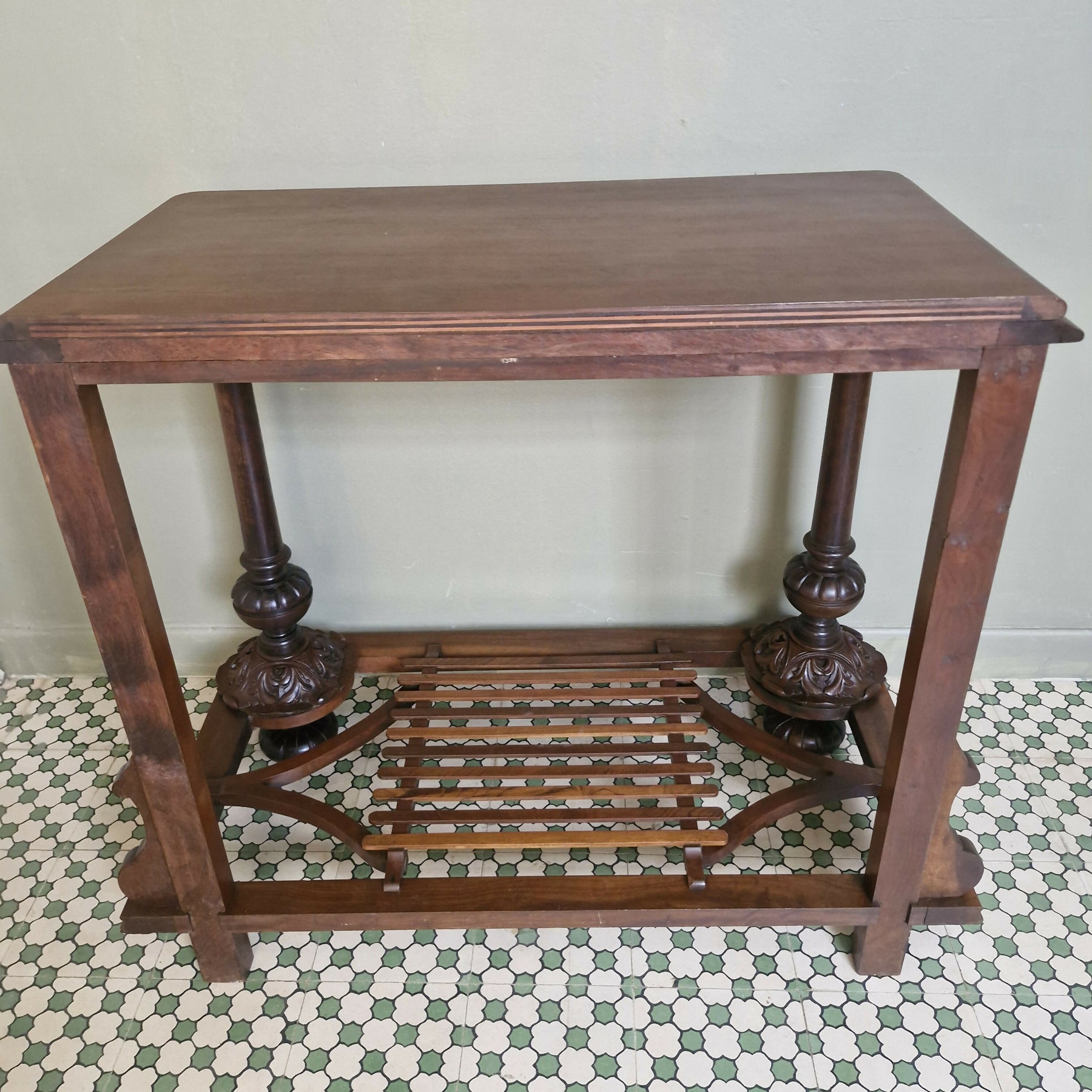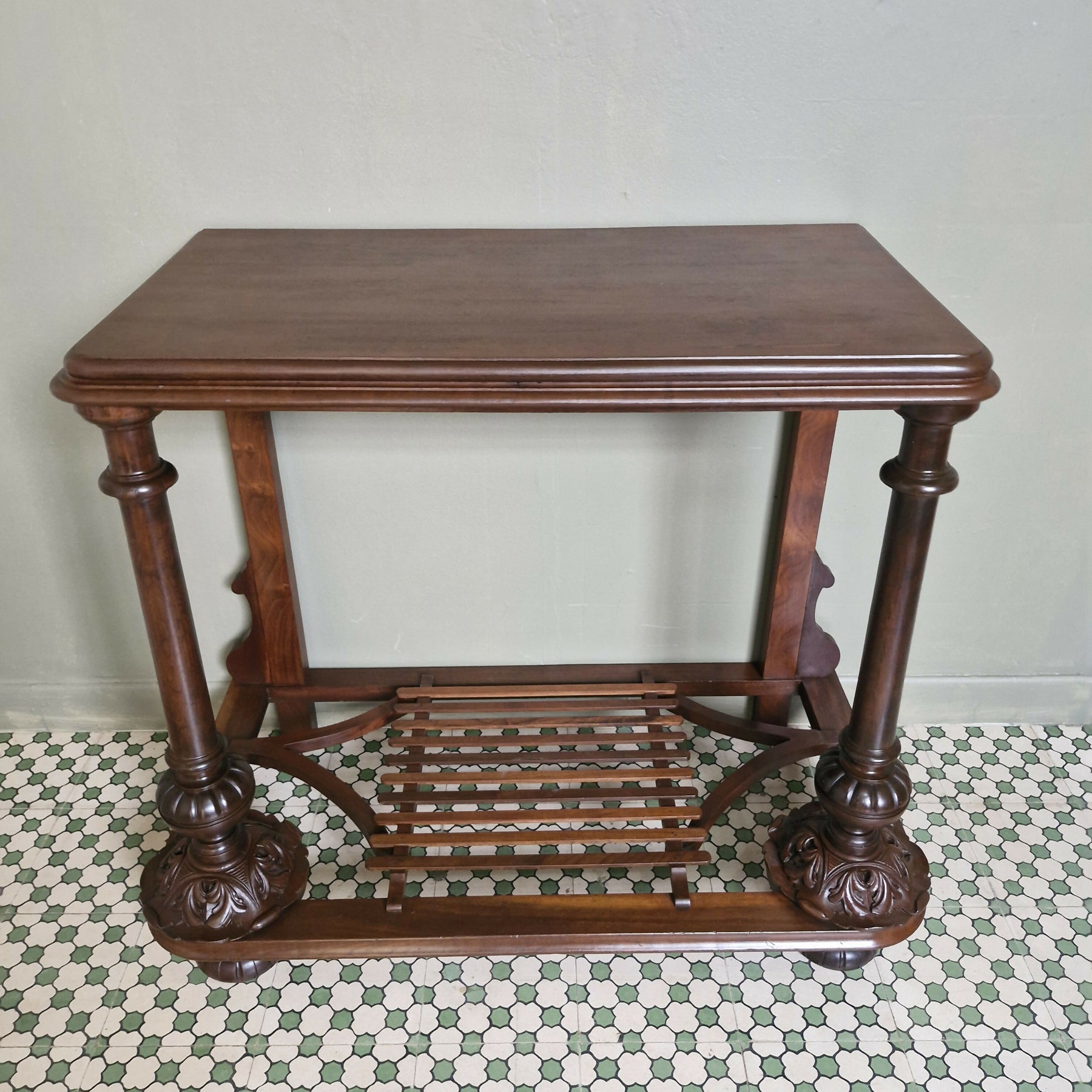 Belíssima mesa console em madeira de lei ricamente entalhada nos pés composta de o2 prateleiras uma embaixo toda detalhada e tampo com cantos arredondados,maravilhosa peça restaurada para pronta entrega.