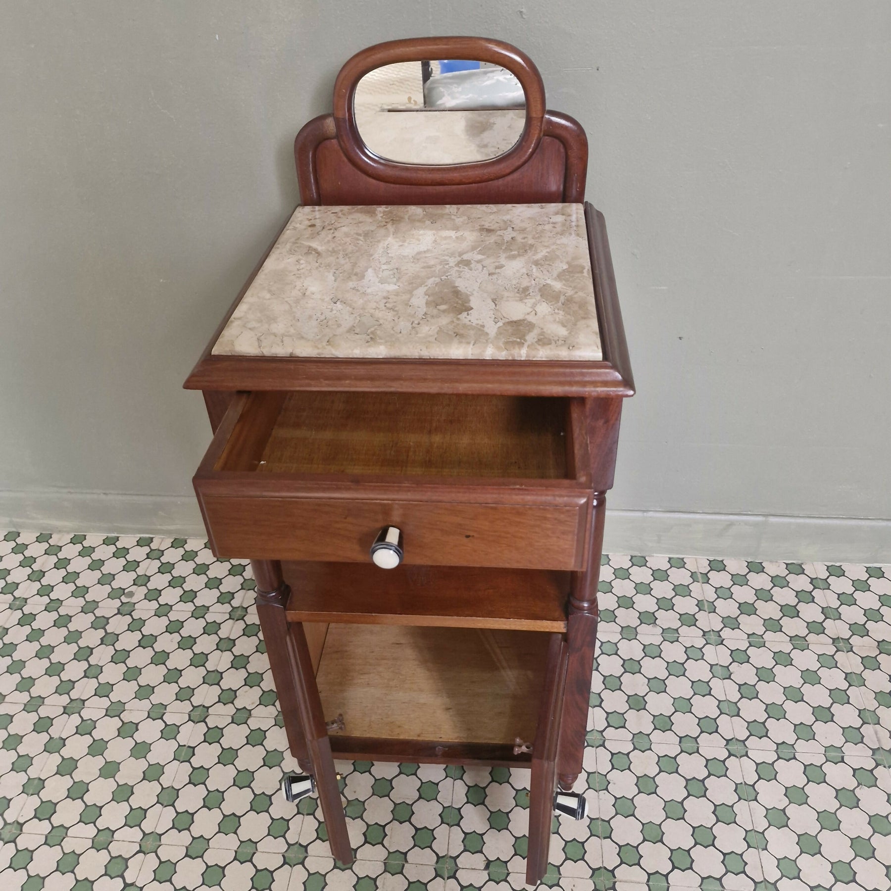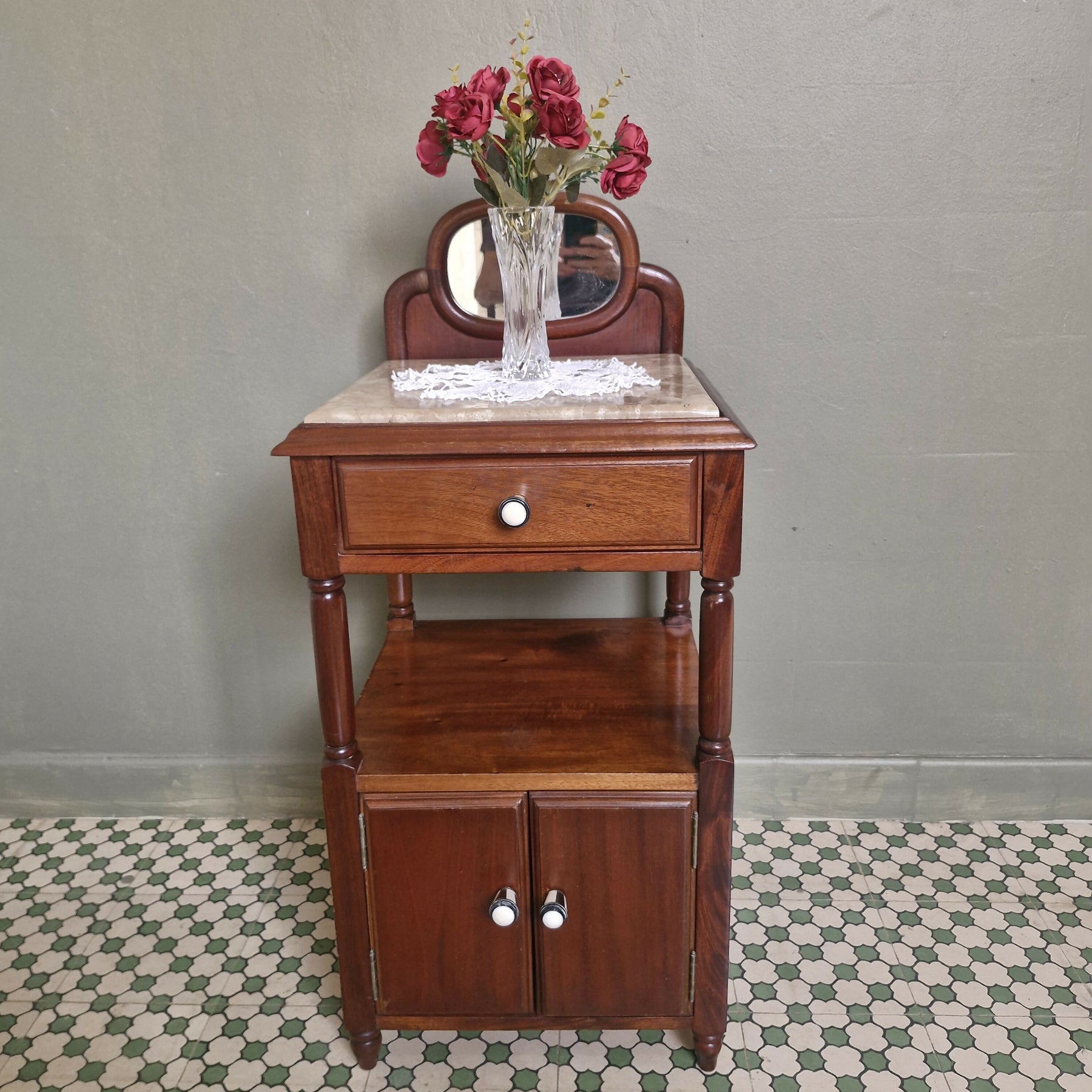 Maravilhosa peca mesa de cabeceira,  apoio ou criado mudo alto com espelho e tampo de mármore travertino,  composto de 1 gaveta ee 2 porta ma parte inferior puxadores de madre perola.