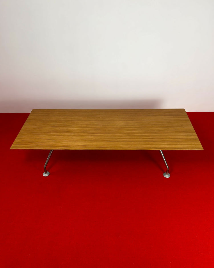 Produzida com tampo em madeira natural laminada, com bordas arredondadas nas laterais e pés metálicos curvos.