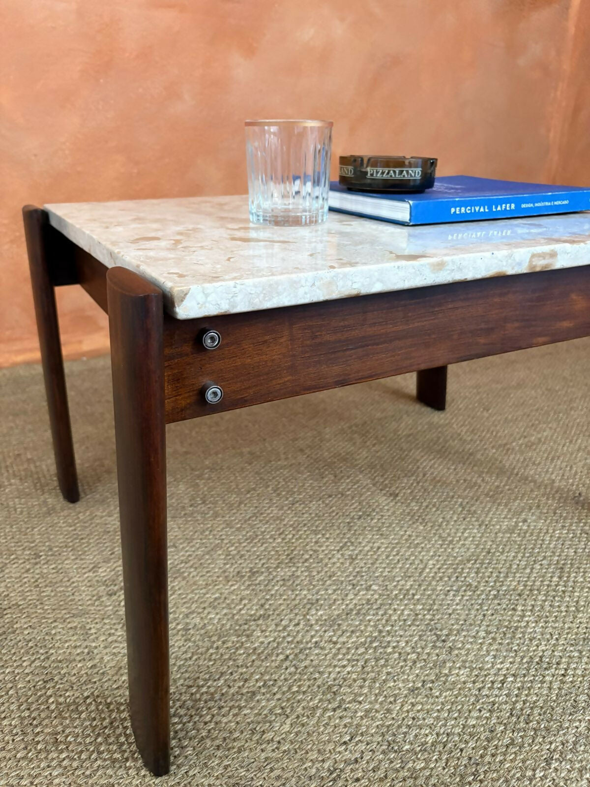 As linhas retas e a junção aparente com parafusos metálicos reforçam o caráter funcional do design de Lafer, onde cada detalhe tem um propósito — nada é decorativo por acaso.