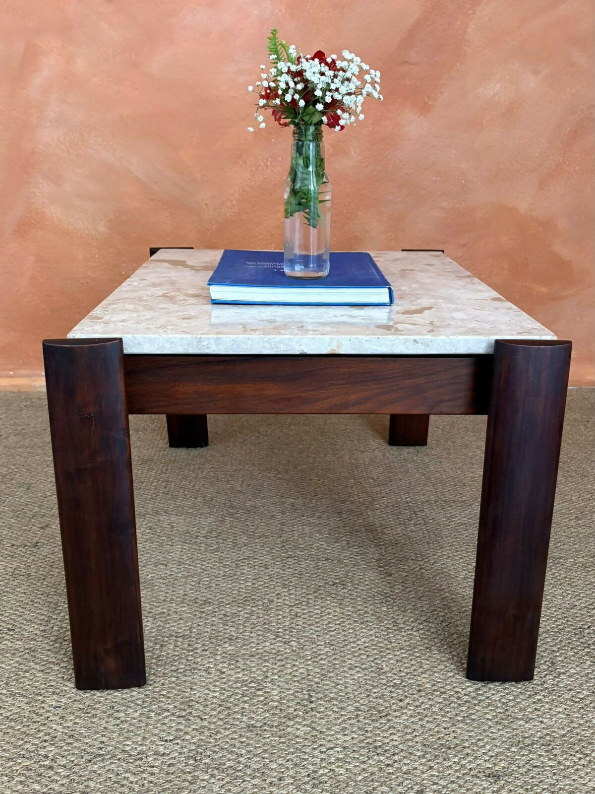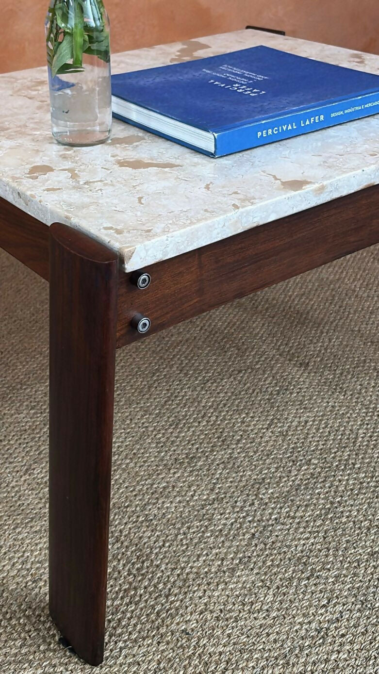 A estrutura é feita em pau ferro maciço, madeira nobre brasileira de tons quentes e veios intensos, que contrasta de forma elegante com o tampo em mármore travertino.