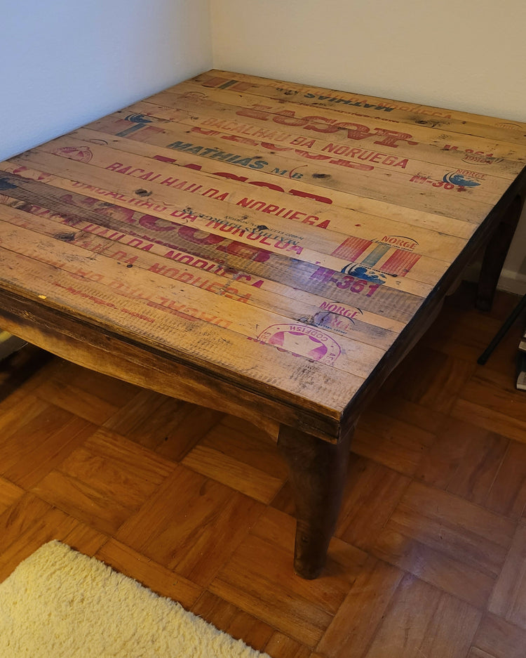 Mesa de centro com pés anos 60 em madeira maciça e tampo anos 2020 assinado pelo artista Renato Larini feito com caixas de madeira de bacalhau da Noruega. Sem dúvida um móvel cheio de personalidade com muito espaço para colocar livros e outros objetos. Possui um pequeno lascado no tampo (foto).