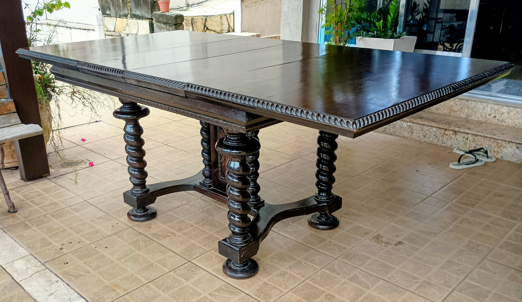 Magnífica mesa de jantar antiga, produzida no final do século XIX / início do século XX, inteiramente construída em jacarandá legítimo, mantendo total originalidade, sem qualquer tipo de restauro.