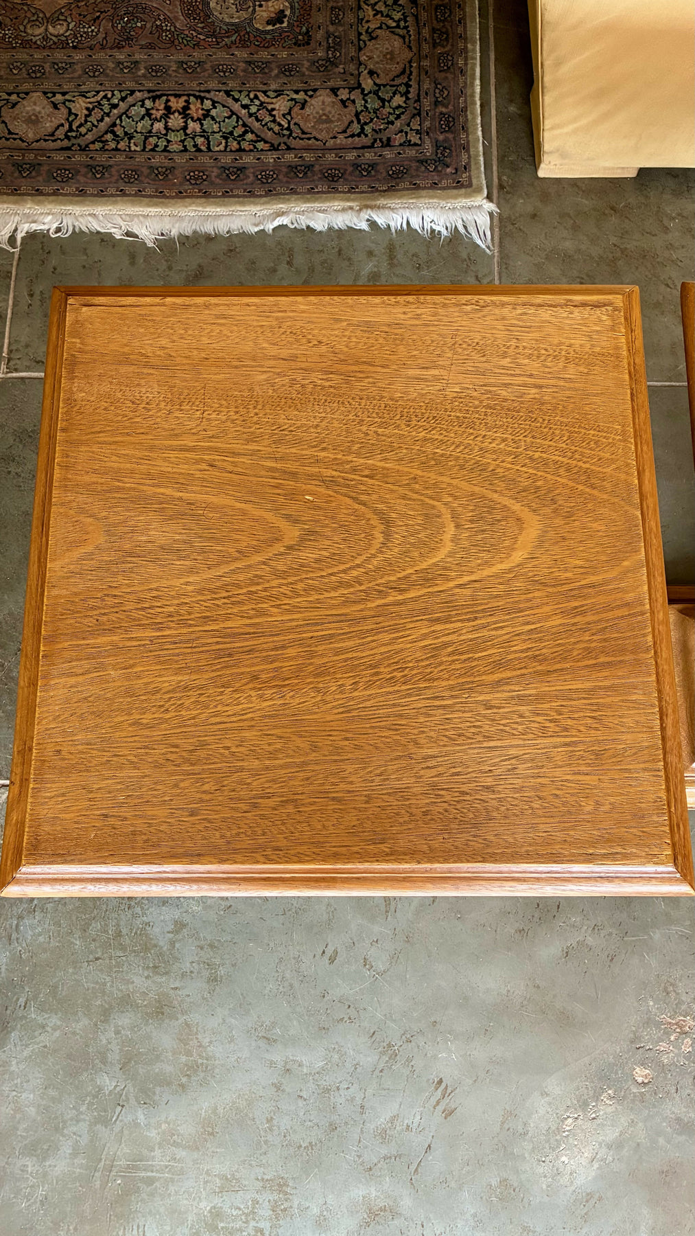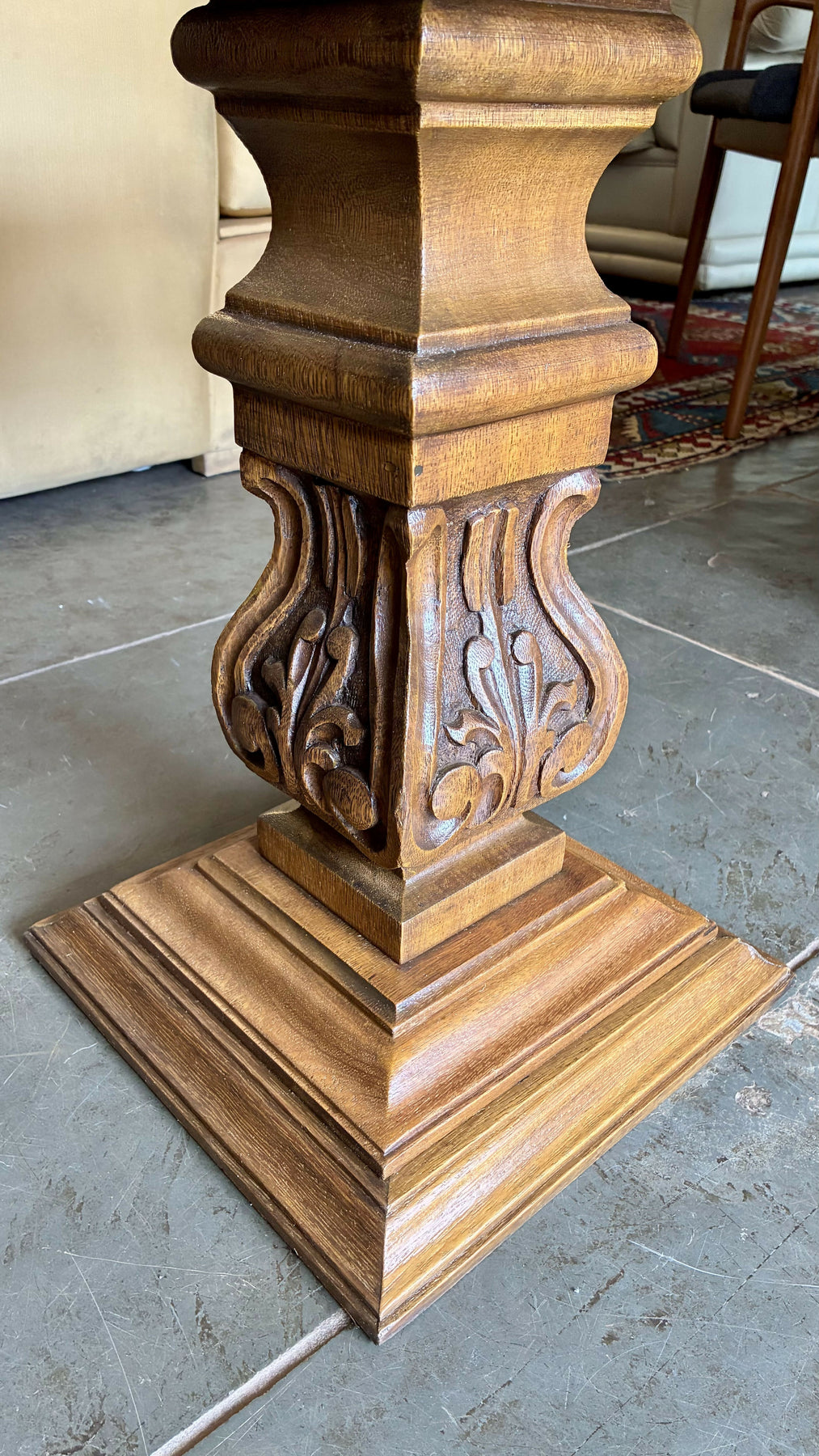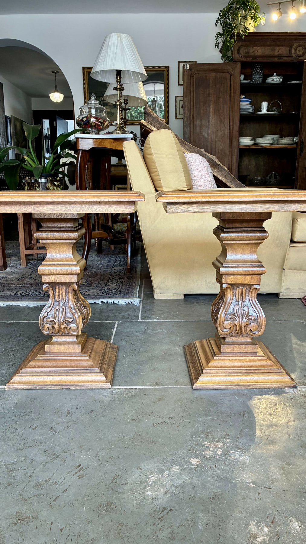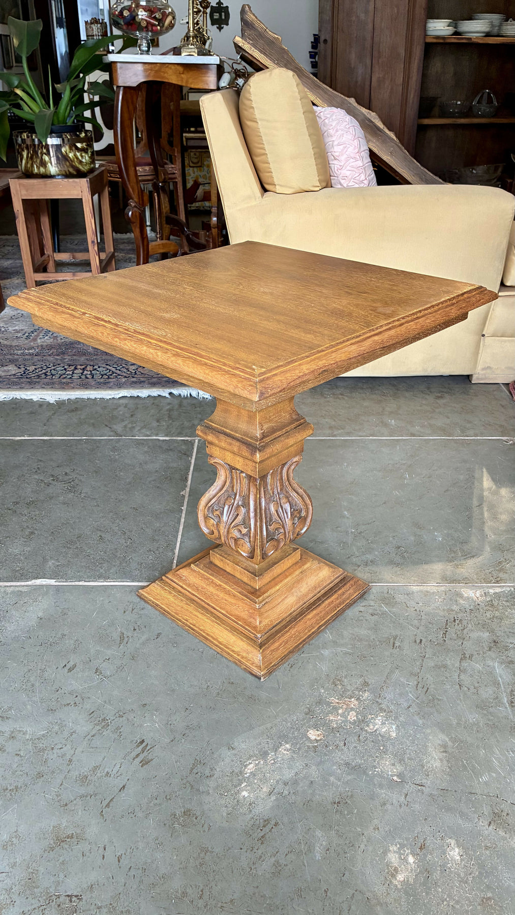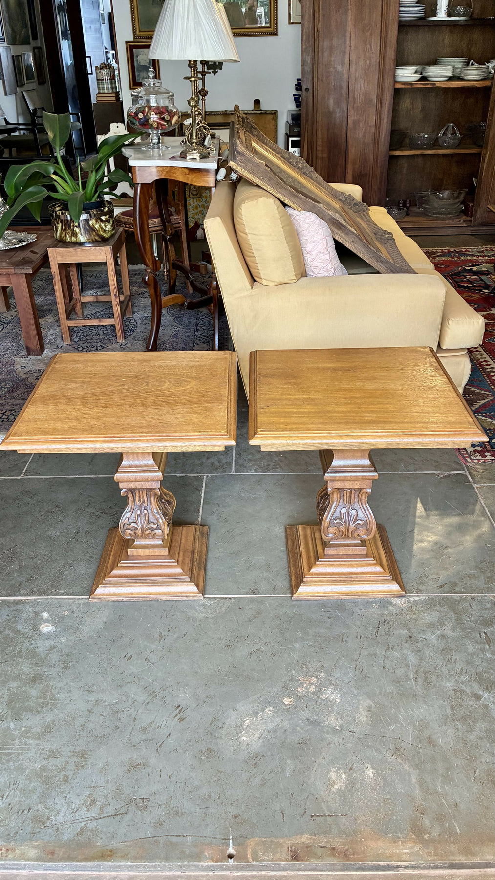 Mesinhas laterais em madeira maciça, com acabamento natural e tom quente, apresentando base robusta em formato de pedestal com entalhes clássicos e detalhes decorativos