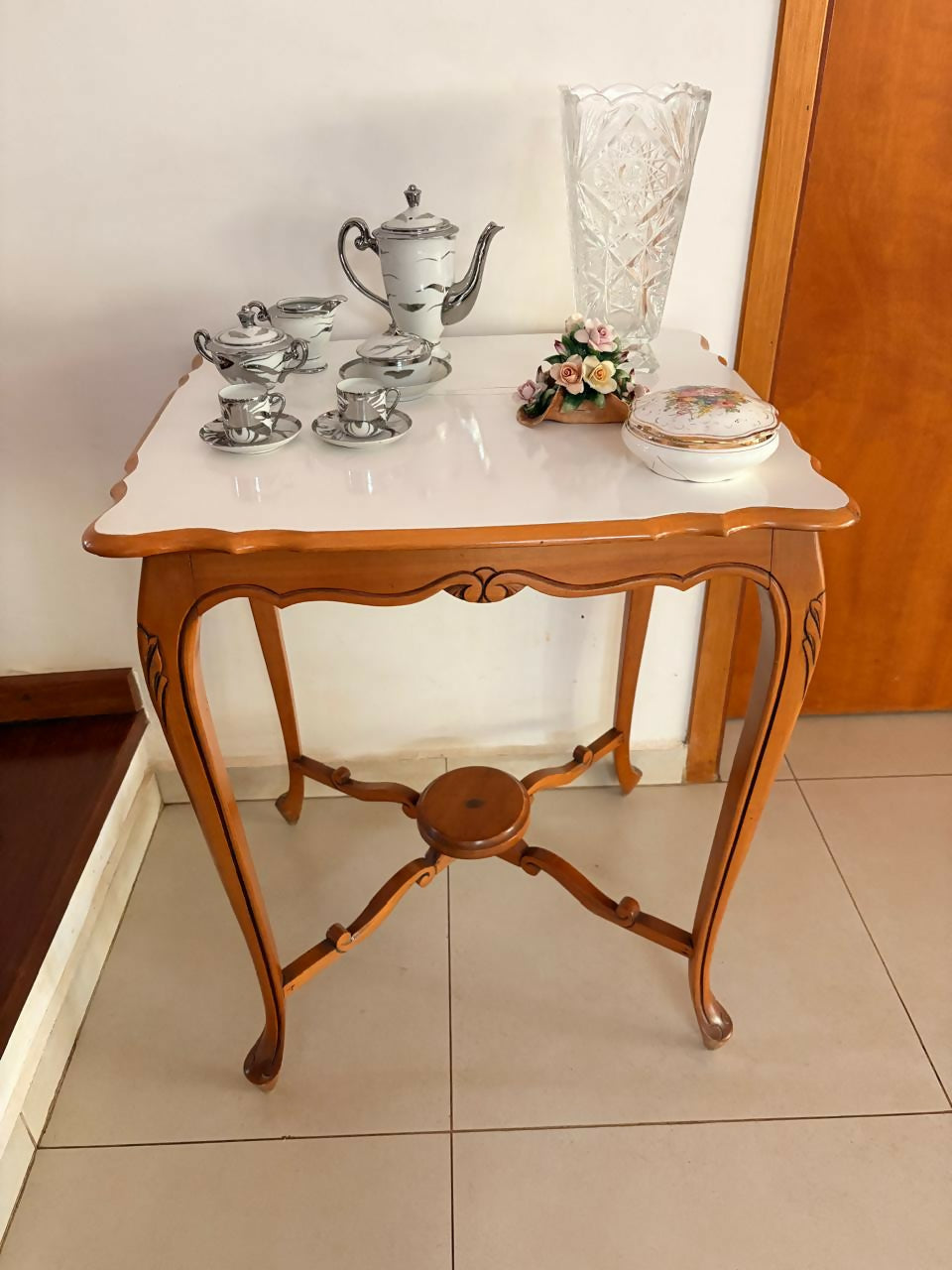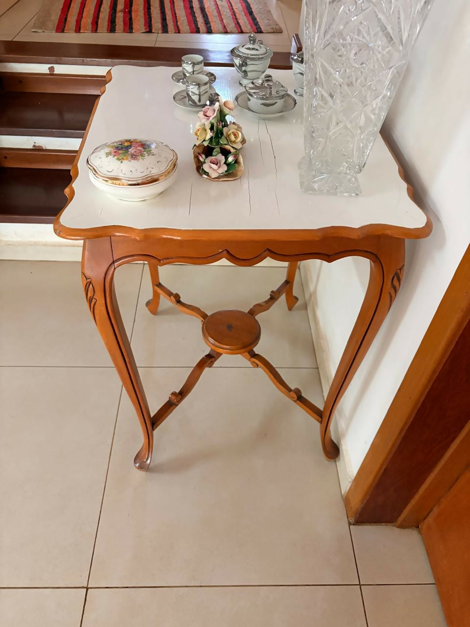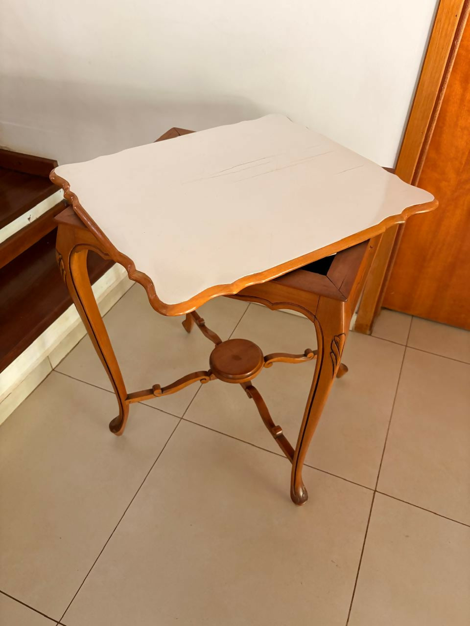 Mesinha de apoio clássica alta, madeira nobre (pau marfim), detalhes esculpidos e com tampo giratório. Medidas 78 cm de altura , 64 cm de largura e  57 de profundidade.