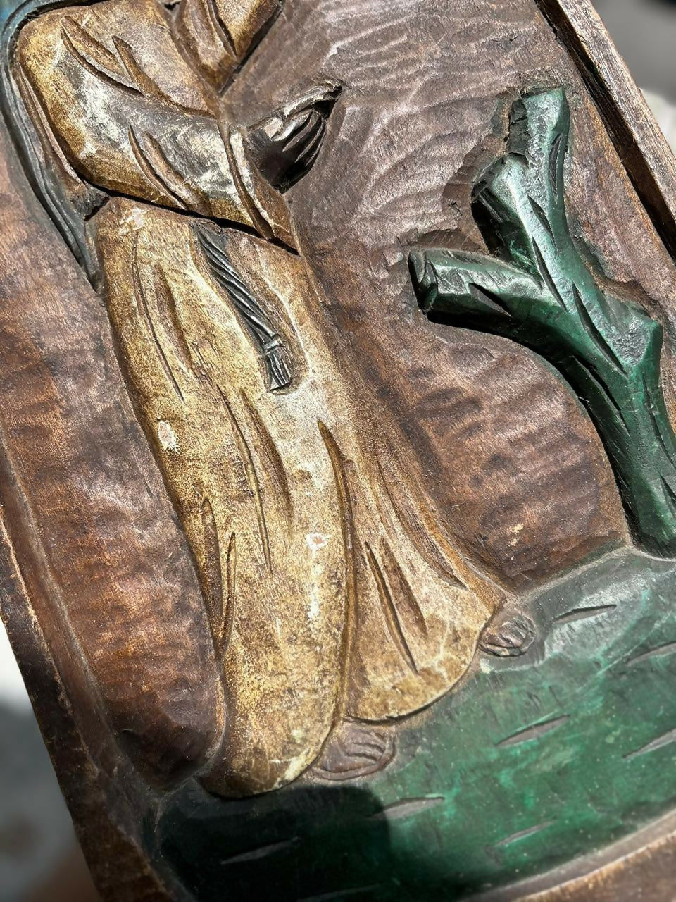 Magnífico painel em relevo esculpido manualmente em madeira maciça, representando São Francisco de Assis, o protetor dos animais e da natureza. Esta peça é um exemplar autêntico da arte sacra popular brasileira, datada aproximadamente da década de 1980.
