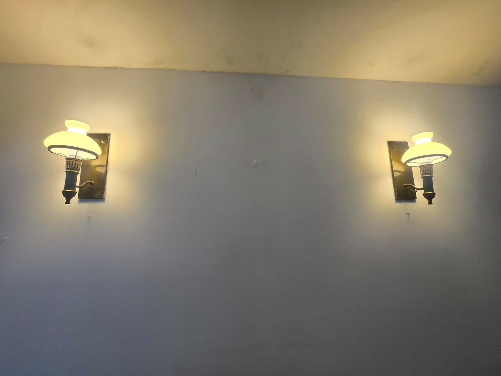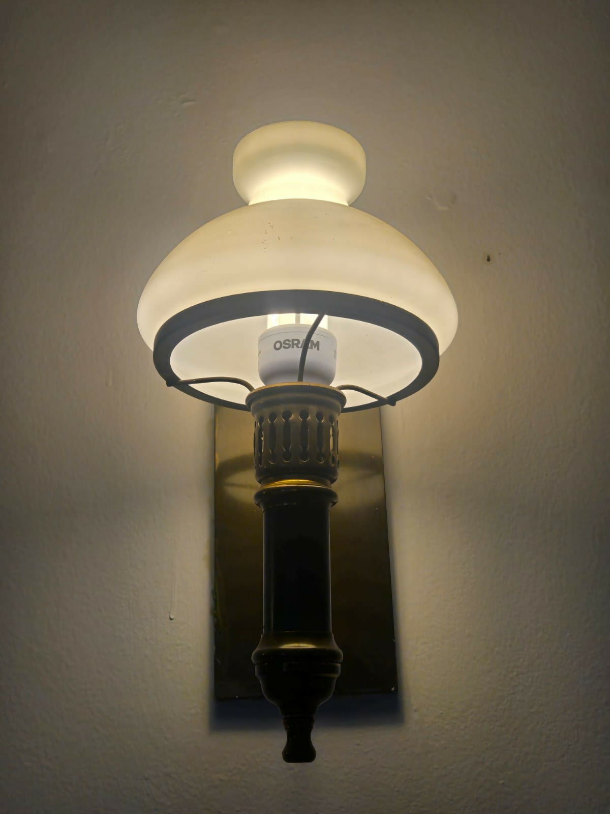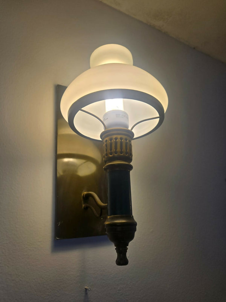 De estilo clássico funcional, com referência direta às luminárias de lampião reinterpretadas para uso elétrico, estas arandelas são típicas de meados do século XX, período em que esse desenho era amplamente utilizado em residências, edifícios institucionais e espaços públicos. A combinação entre estrutura sólida, detalhes esmaltados e vidro leitoso resulta em iluminação elegante, difusa e acolhedora.