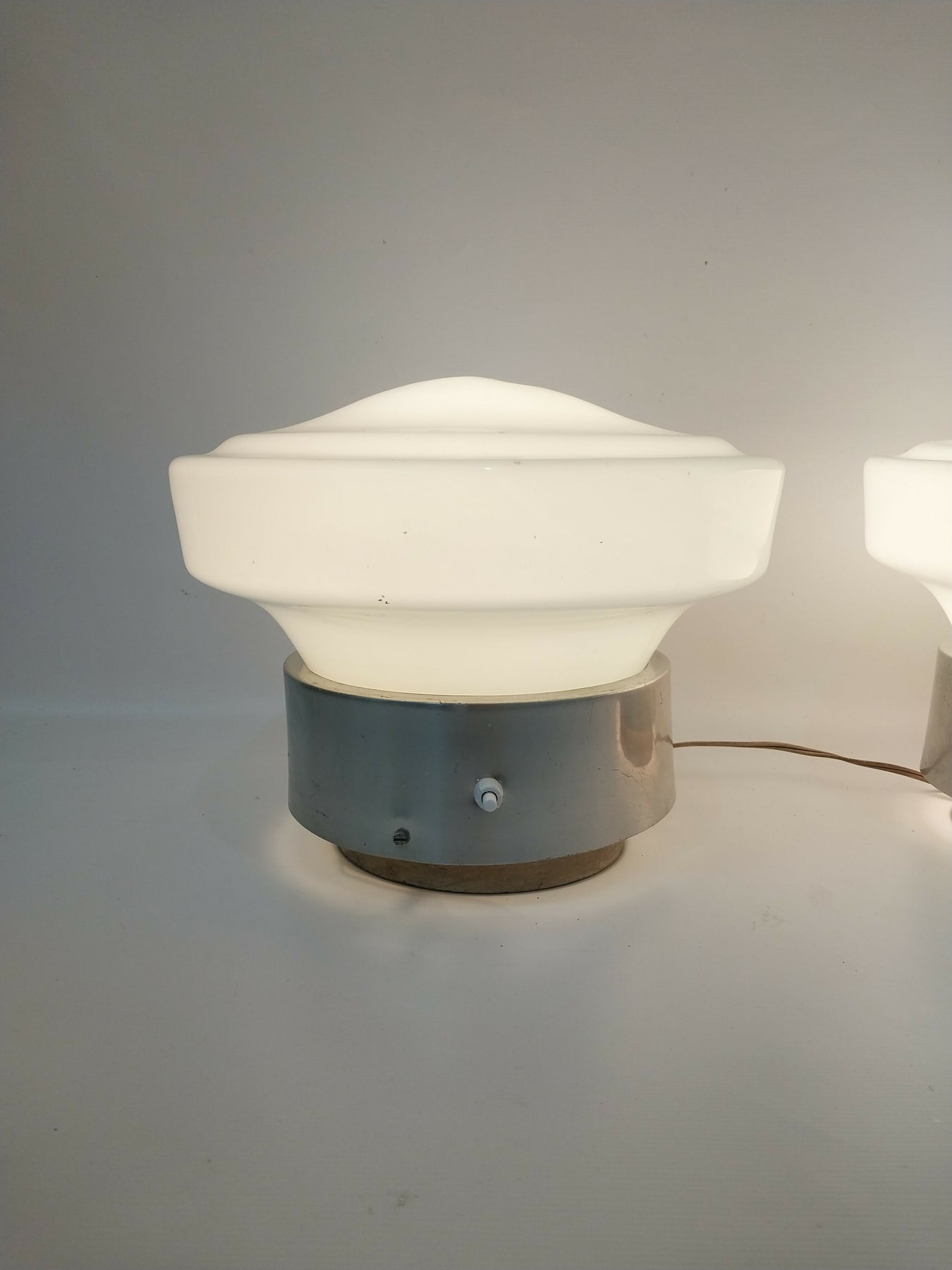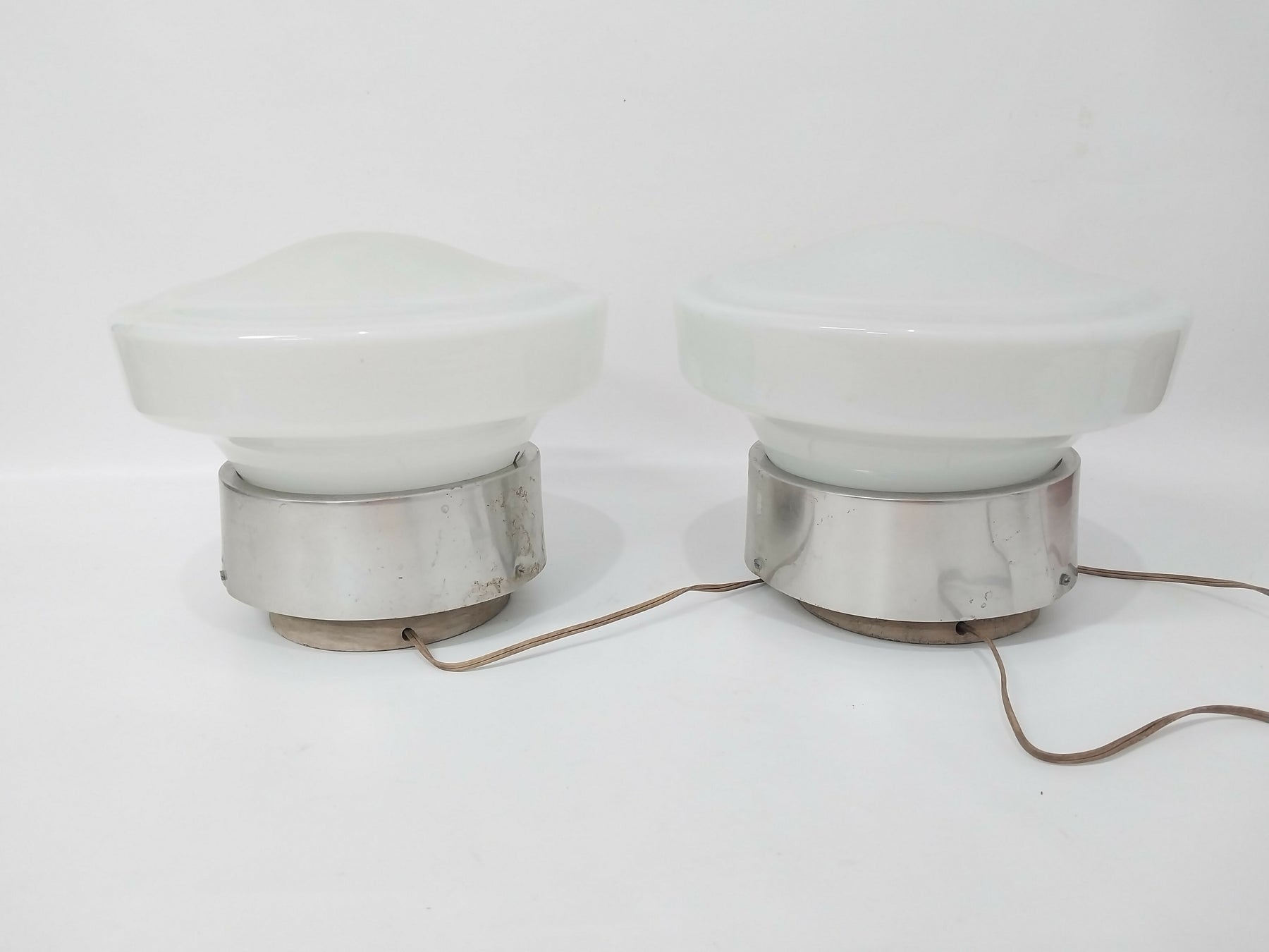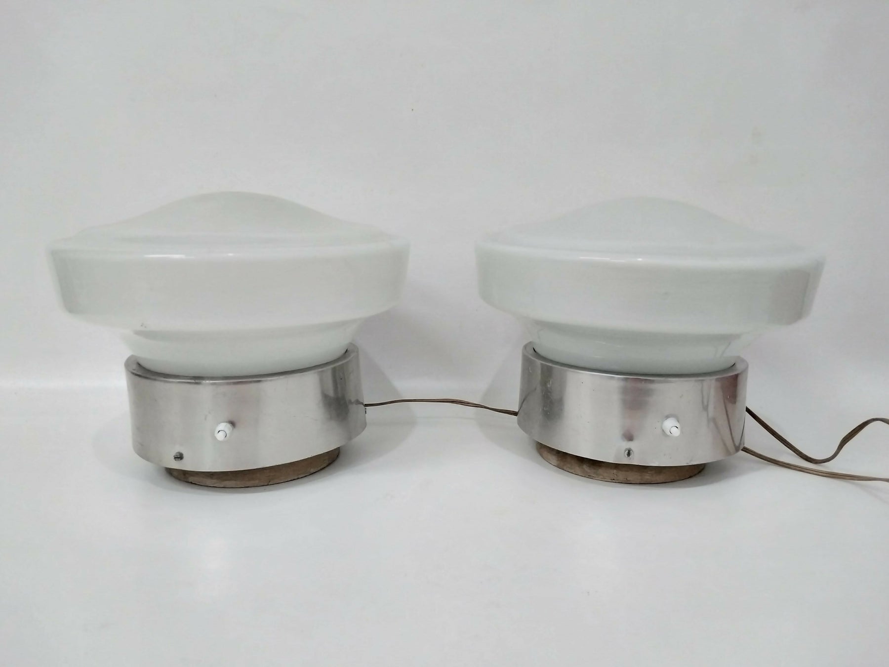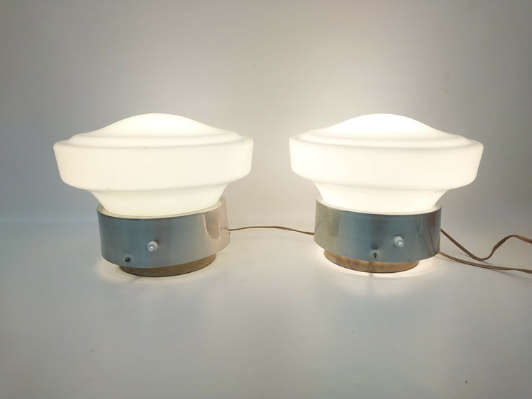 Par de luminárias vintage com cúpulas em vidro opalino branco, de desenho orgânico e linhas suaves, típicas do design modernista das décadas de 1960/70. As bases cilíndricas em metal conferem contraste industrial e sustentação sólida ao conjunto.