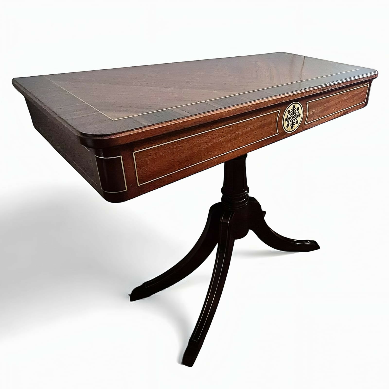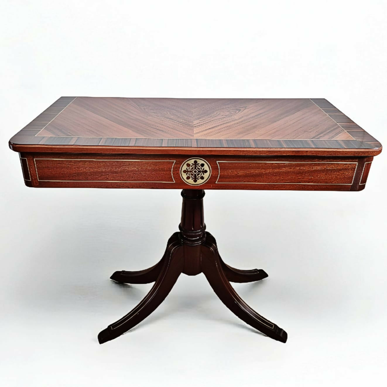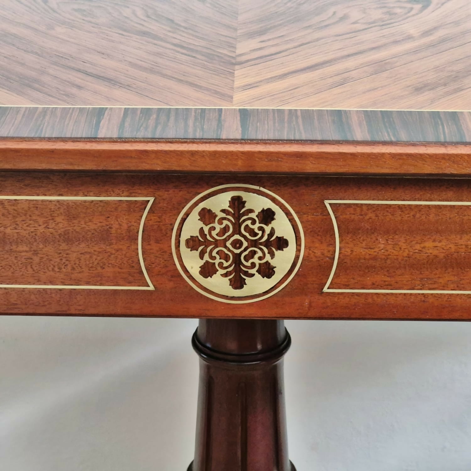 As saias exibem frisos em latão e um medalhão central com ornamento floral dourado, de execução artesanal primorosa. O conjunto apoia-se sobre um fuste central torneado em madeira nobre, sustentado por quatro pés recurvos elegantemente moldados, típicos do período Regência, que garantem leveza e estabilidade.