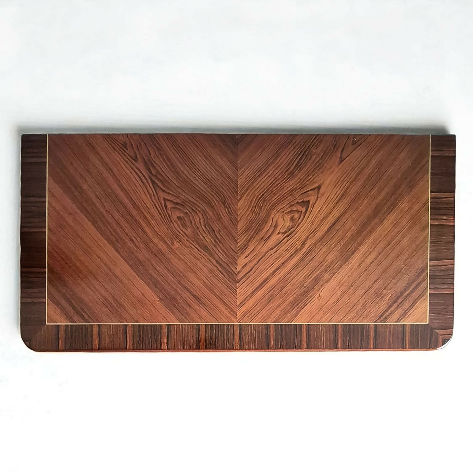 Os tampos retangulares, medindo 92 x 46 cm, são folheados em jacarandá de exuberante tonalidade, formando um desenho geométrico em espinha de peixe que valoriza o veio natural da madeira. O contorno é realçado por filetes de marchetaria em madeira clara e delicadas incrustações de latão, conferindo luminosidade e contraste à peça.