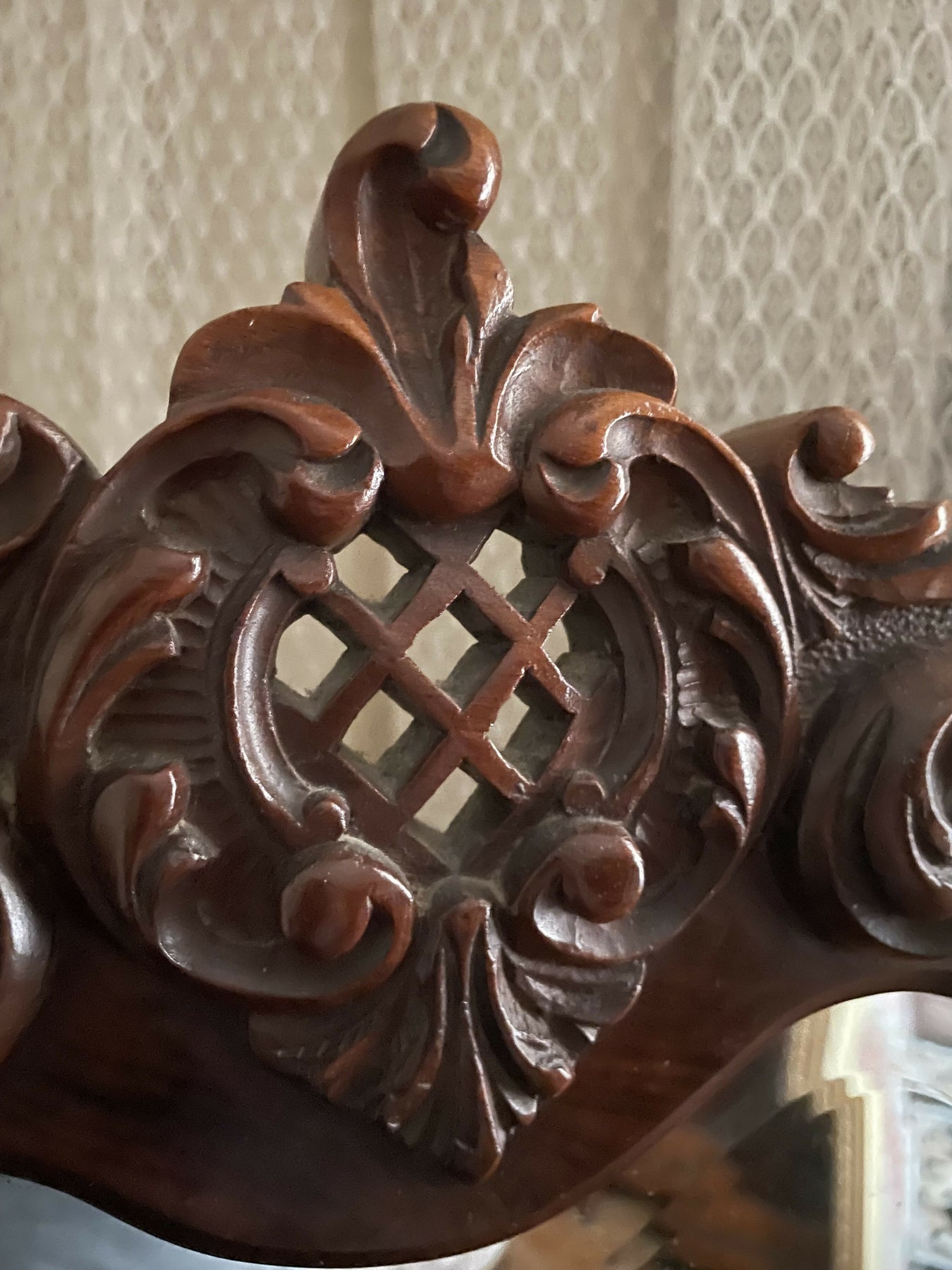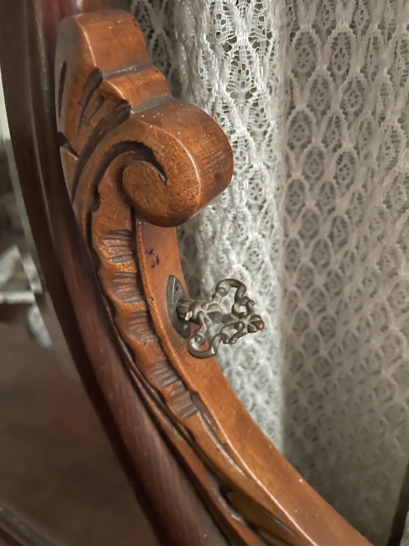 Belíssimo espelho estilo Luís XV em madeira nobre com moldura desenhada em curvas com bilros e cordão de tassel para pendurar. Delicado florão central entalhado à mão . Espelho antigo em cristal bisotado. R$1480