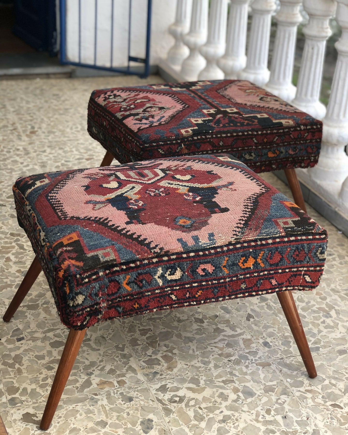 2 puffs maravilhosos com pés palito e tapeçaria persa.