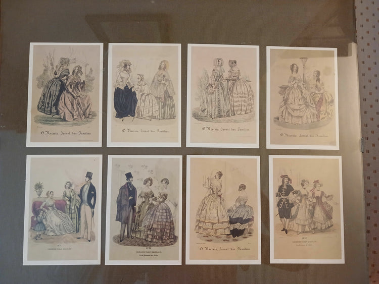 Quadro de 52 x 47 cm com oito cartões antigos e passepartout de tecido. Apresenta lindas ilustrações do periódico do século XIX "O Recreio, Jornal das Famílias" e do "Jardim das Damas". O vidro está trincado num dos lados. Envio via Correios.