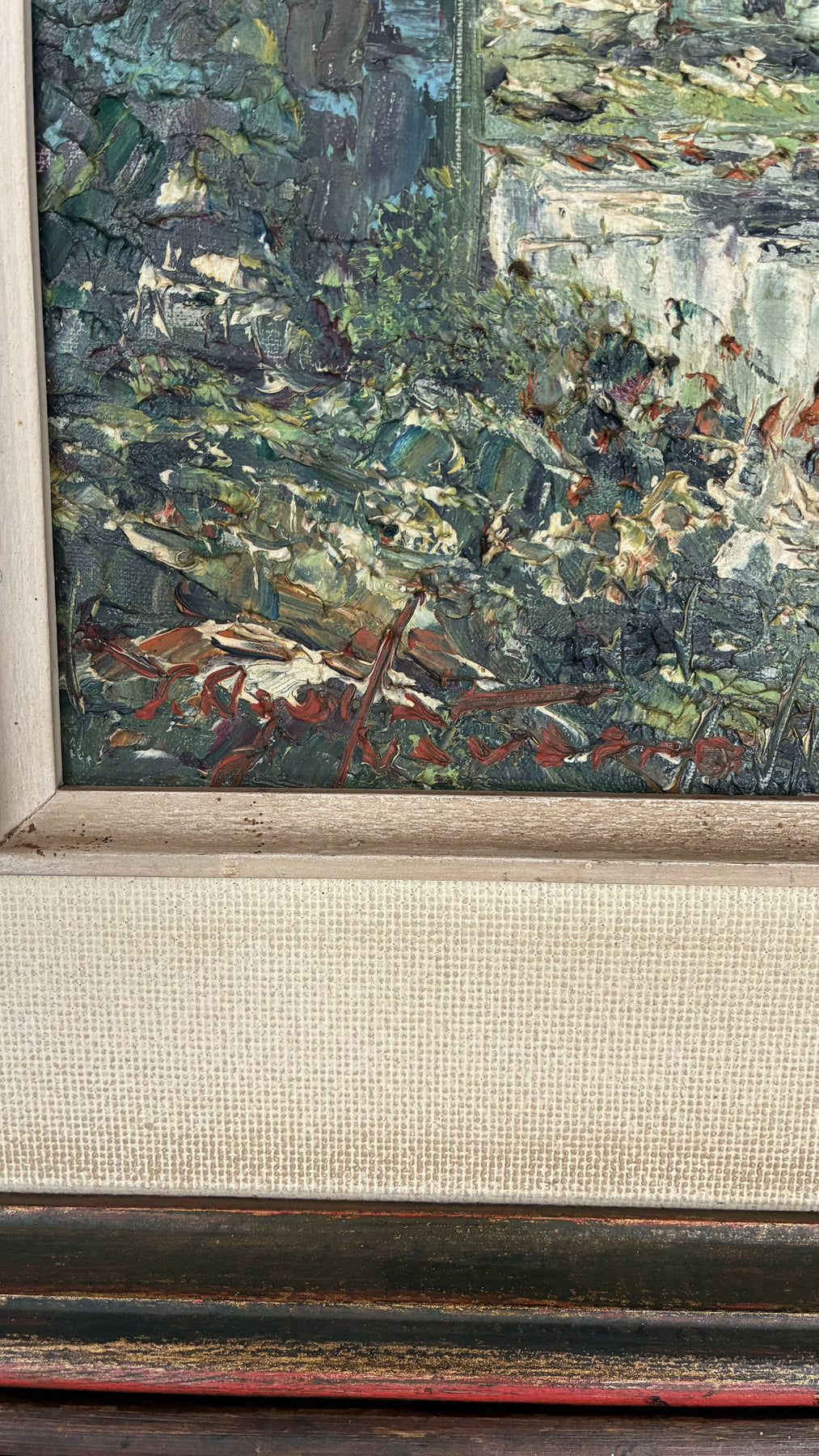 Obra original do artista Aguilar Navarro, apresentando uma encantadora paisagem europeia com construções antigas, torre ao fundo e rica vegetação ao redor. A pintura, executada em técnica óleo sobre tela, traz pinceladas marcadas e textura expressiva, características que dão profundidade e vivacidade à cena.