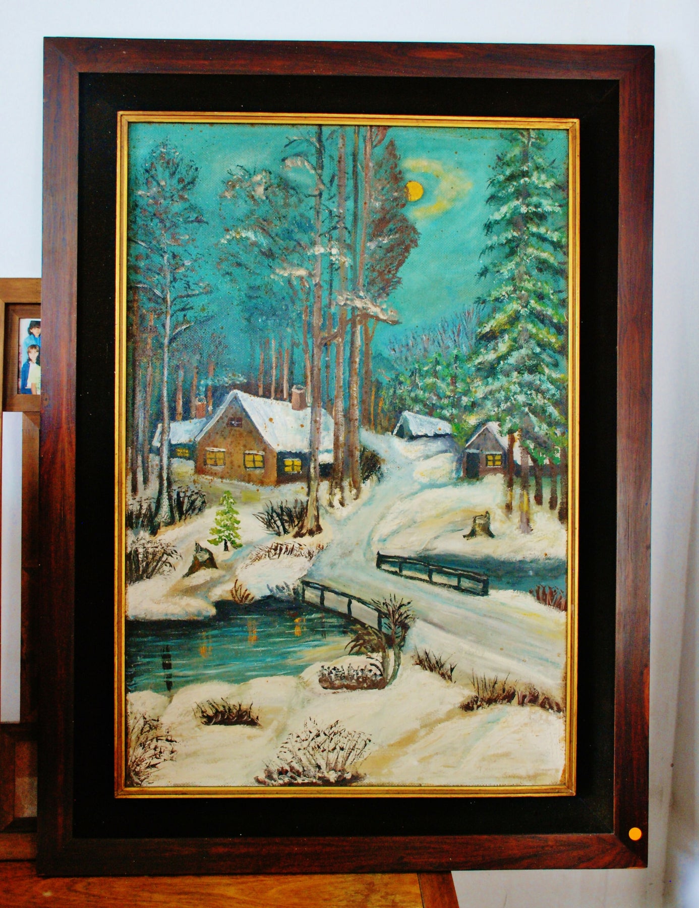 pintura de paisagem de inverno vintage, provavelmente uma litografia ou óleo/acrílico, que retrata uma cena noturna com cabanas rústicas, árvores cobertas de neve e um riacho com uma pequena ponte. . anos 70  moldura madeira , veludo e filete dourado , medida 97 x 70 - pintura 75 x 50