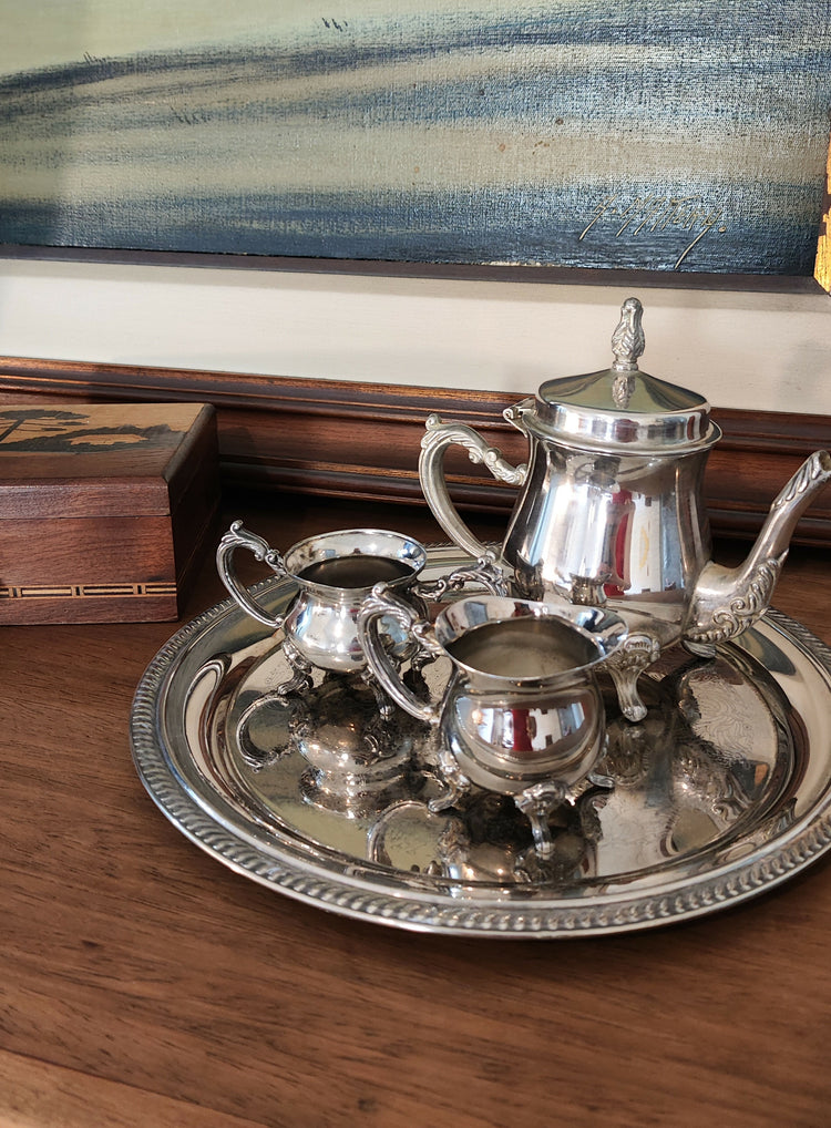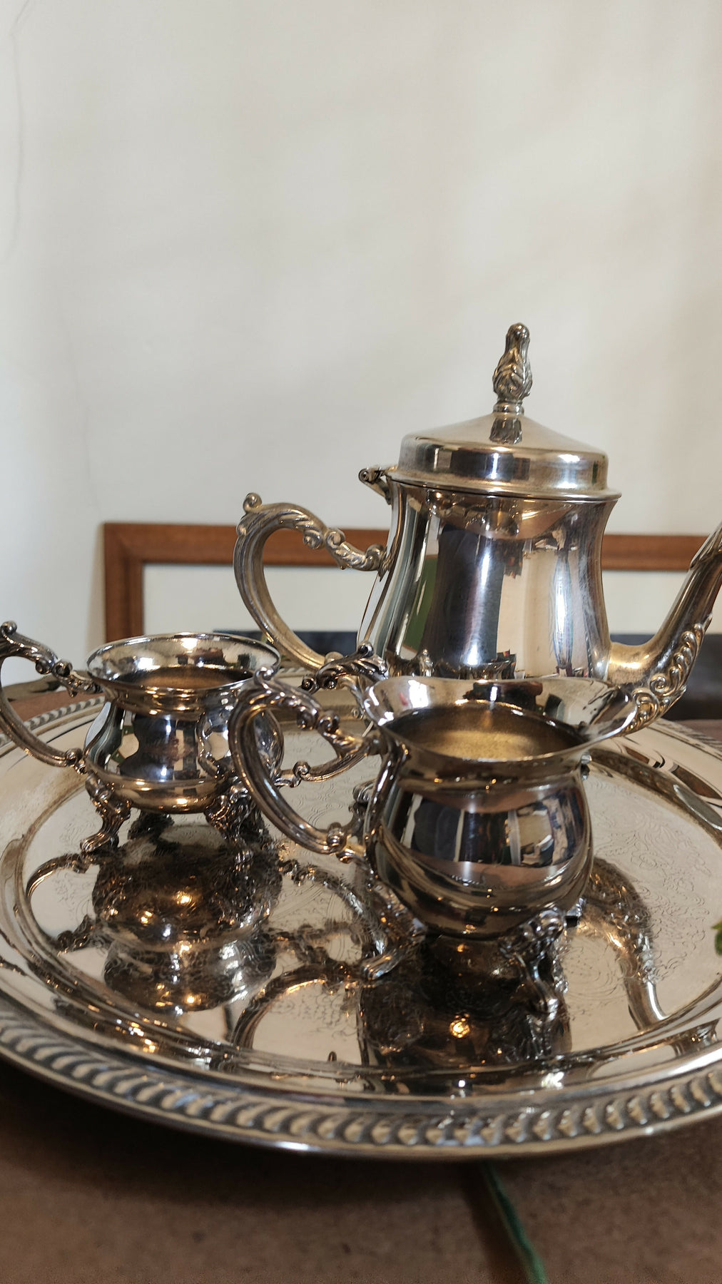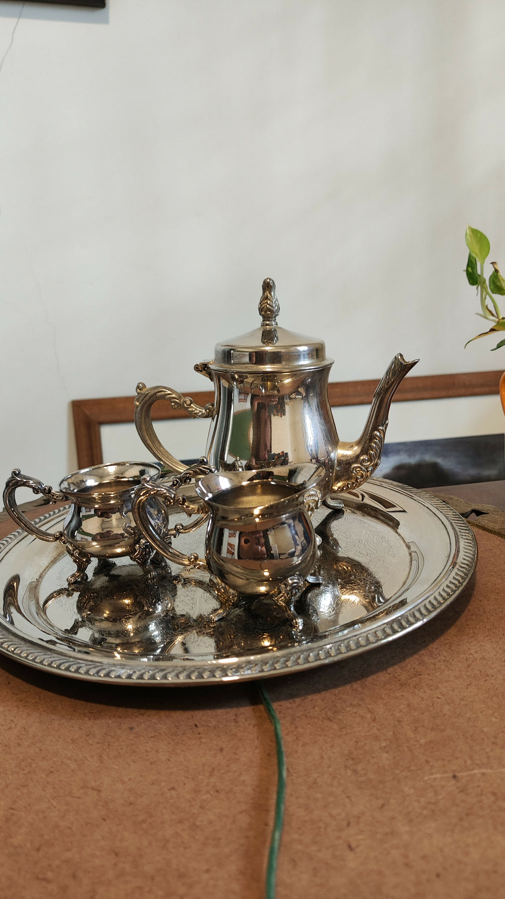 Lindo serviço de chá espessurado à prata de meados do século passado, contendo: bandeja, cremeira, açucareiro e bule.