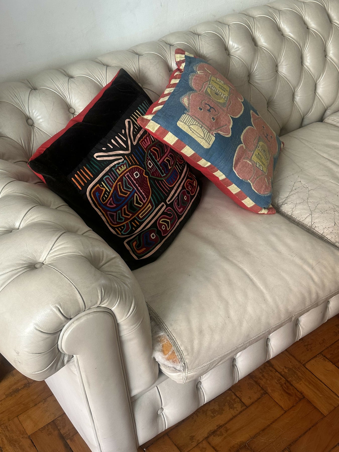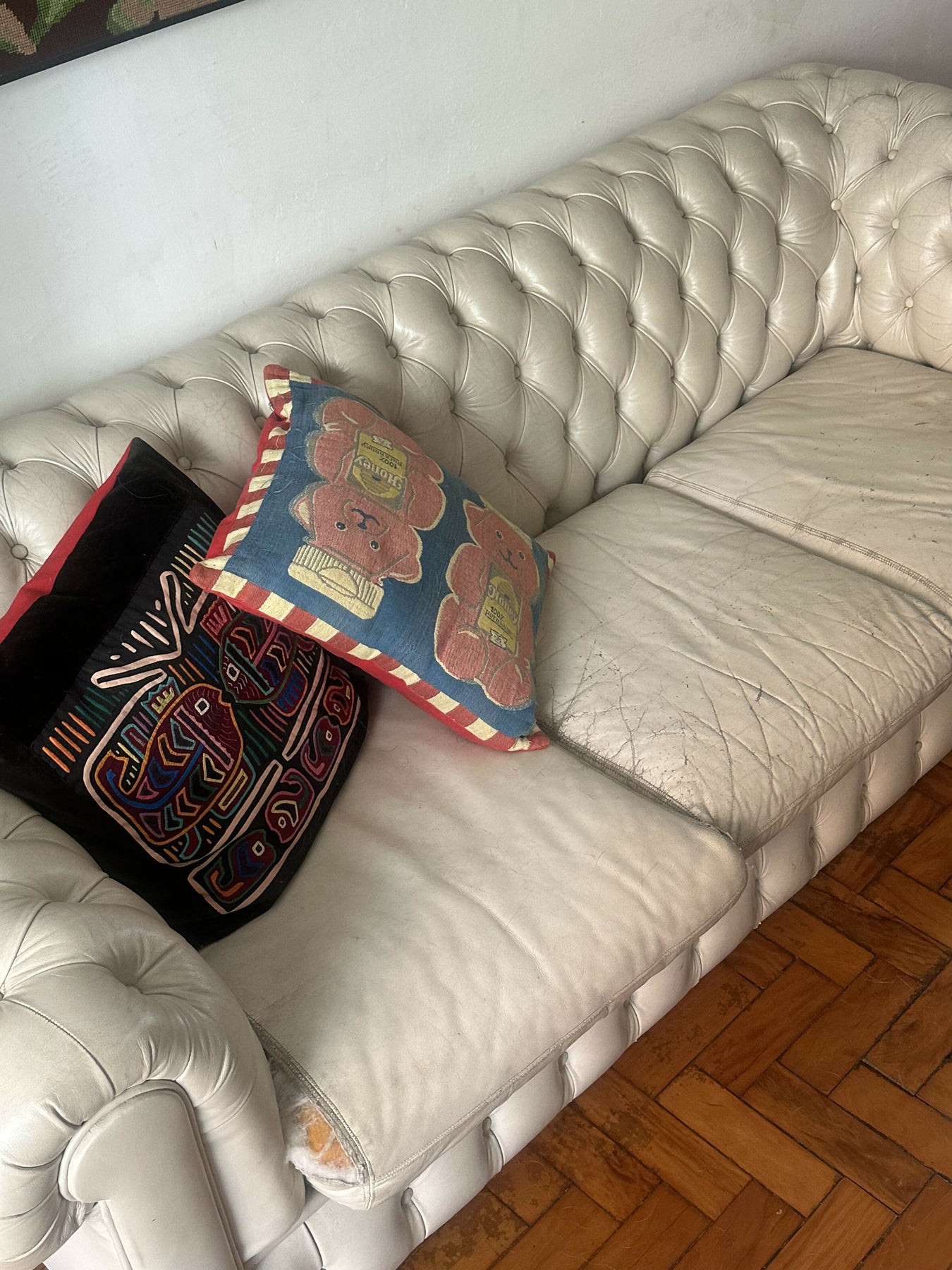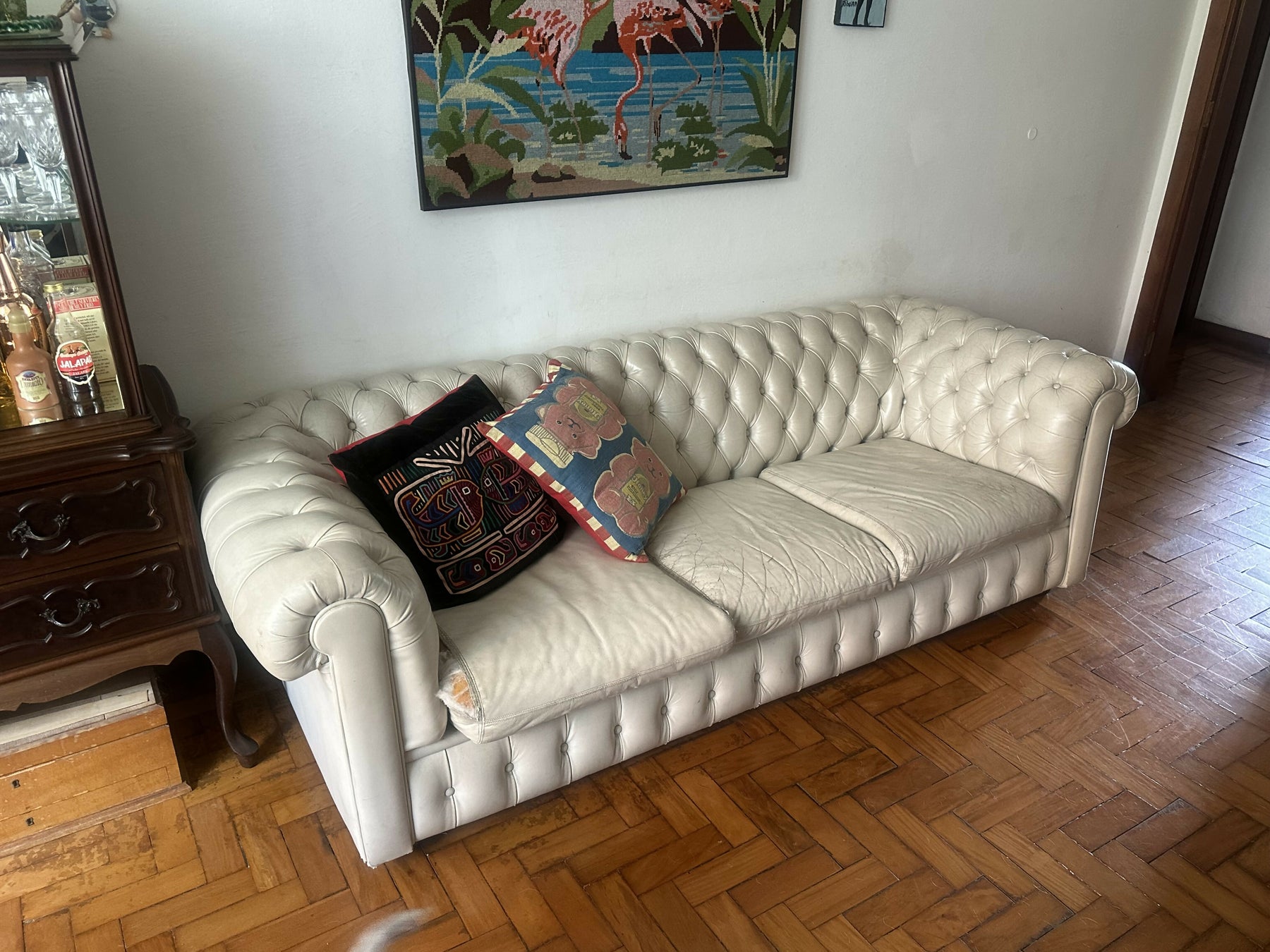 marcas de uso pelo tempo e um rasguinho no estofado.