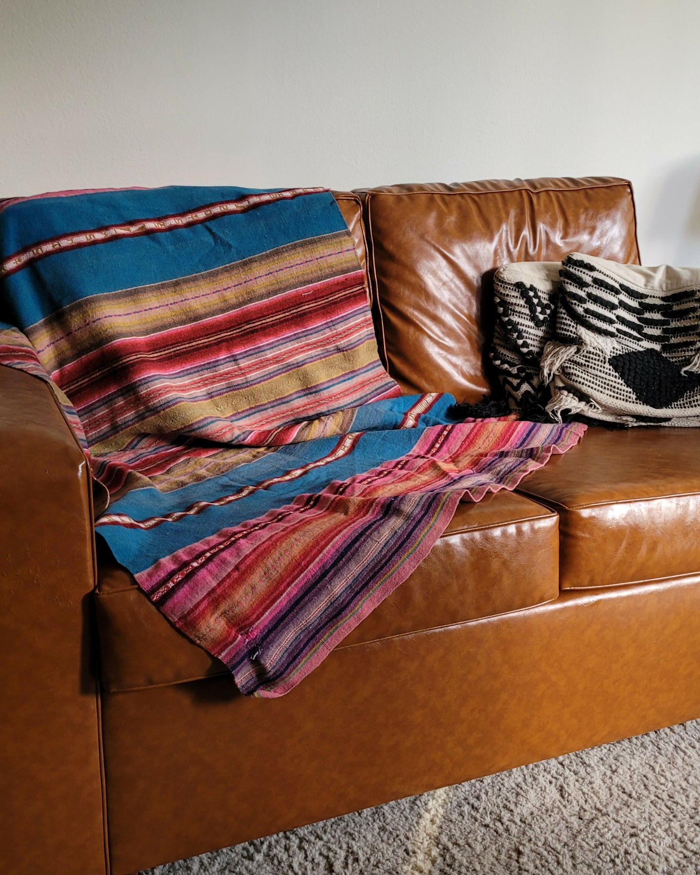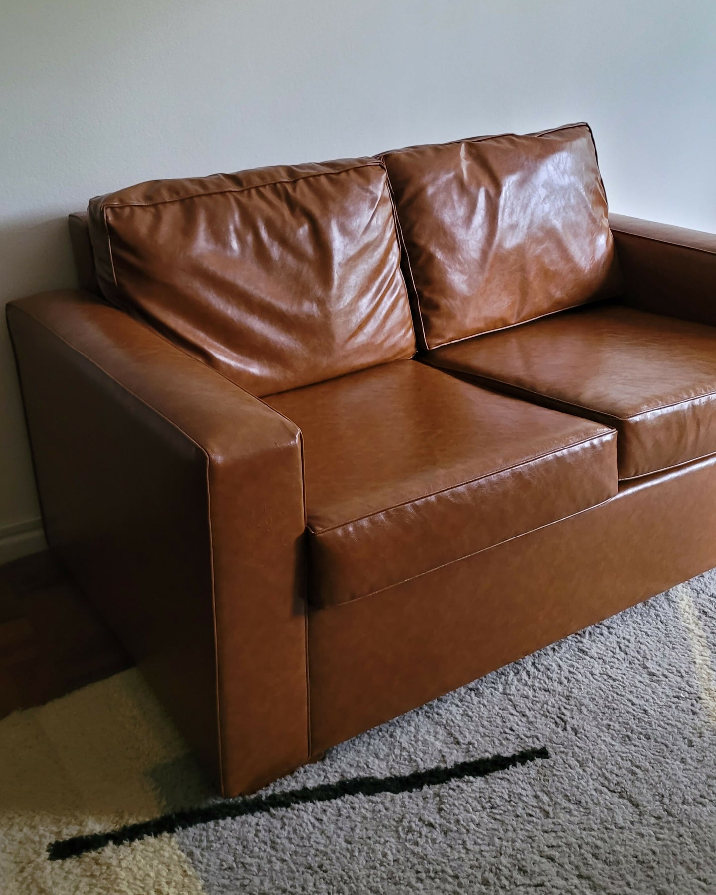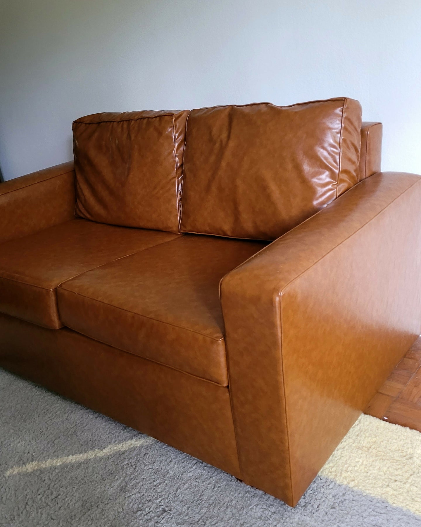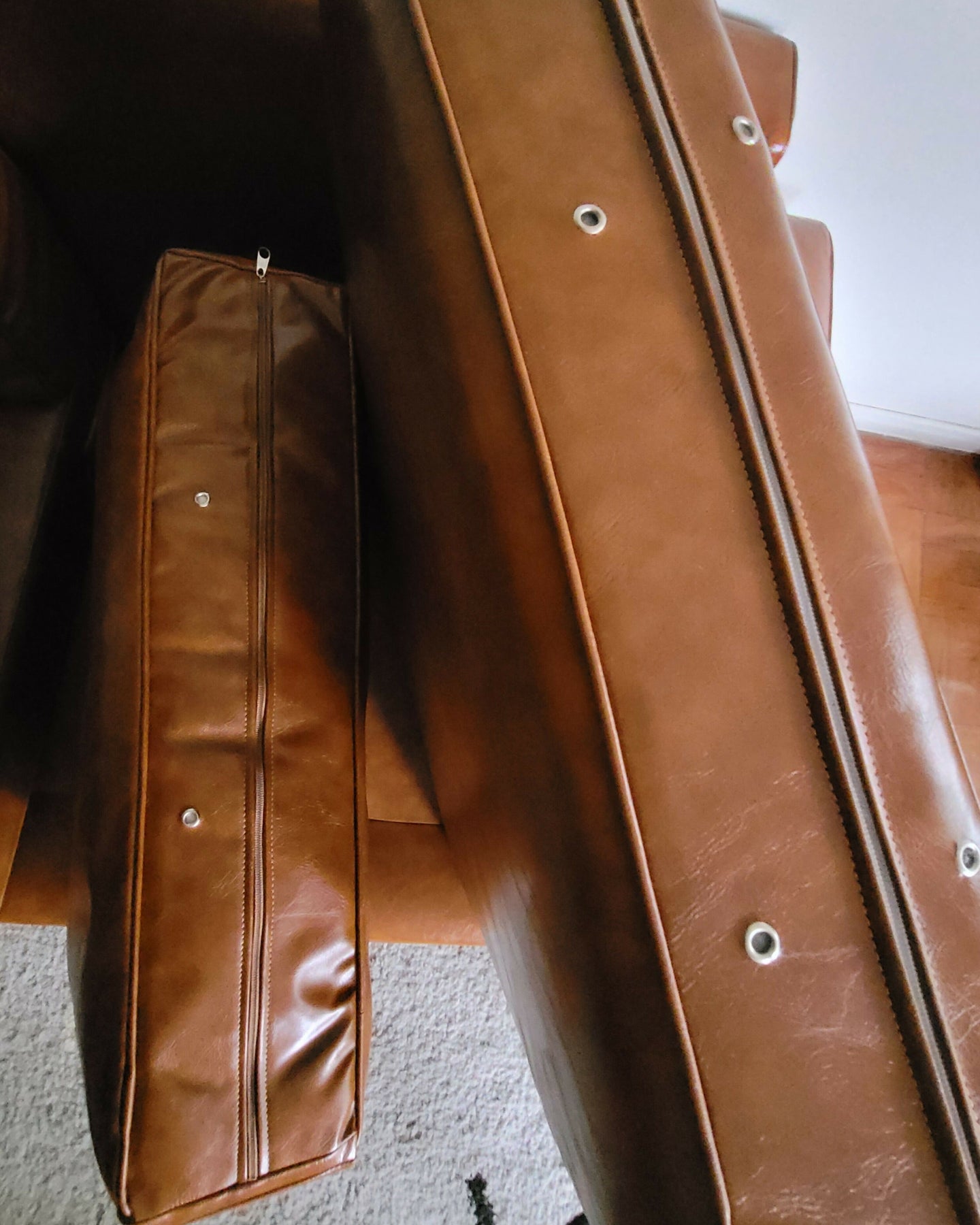 Sofá recém restaurado com estofado em couro ecológico caramelo