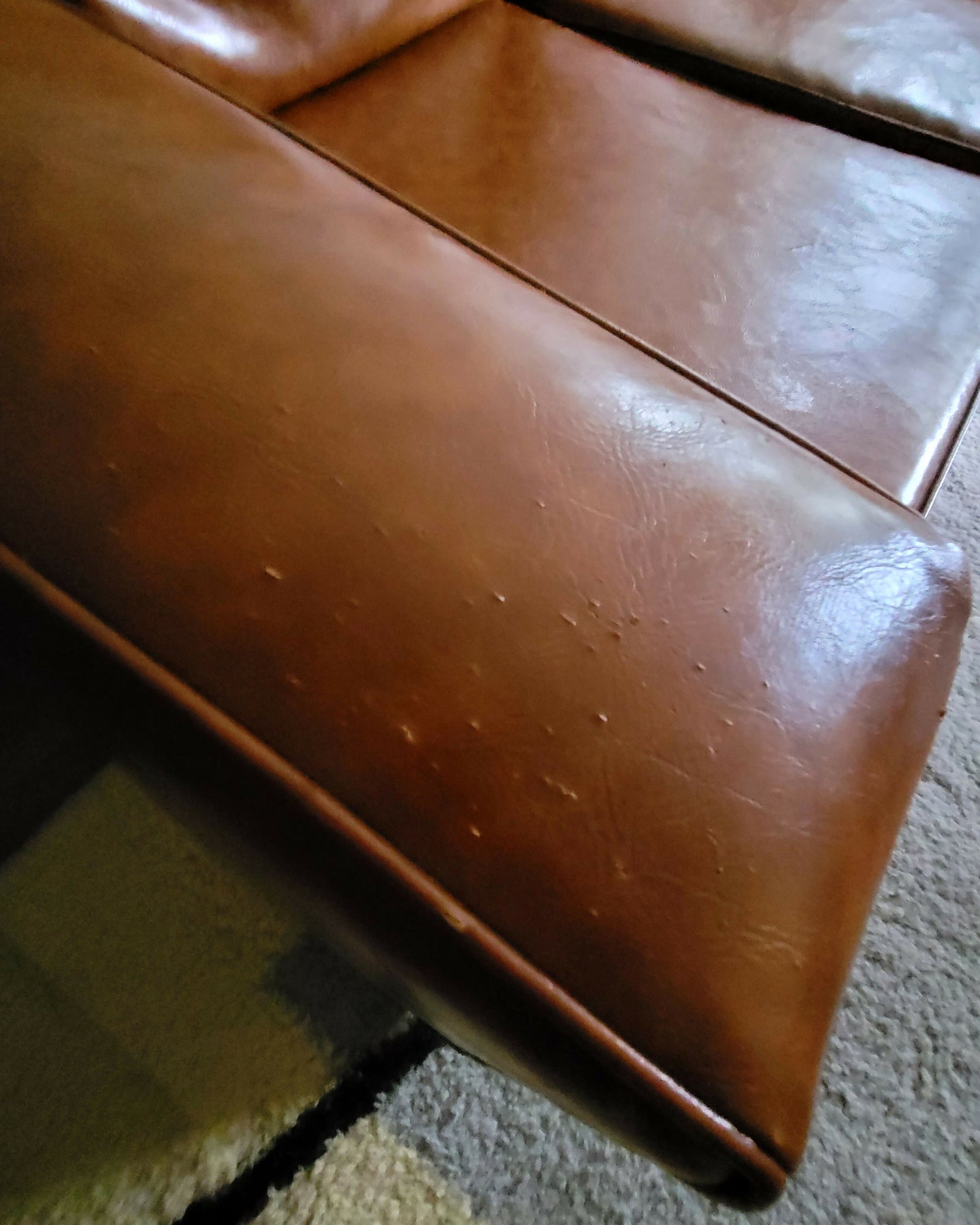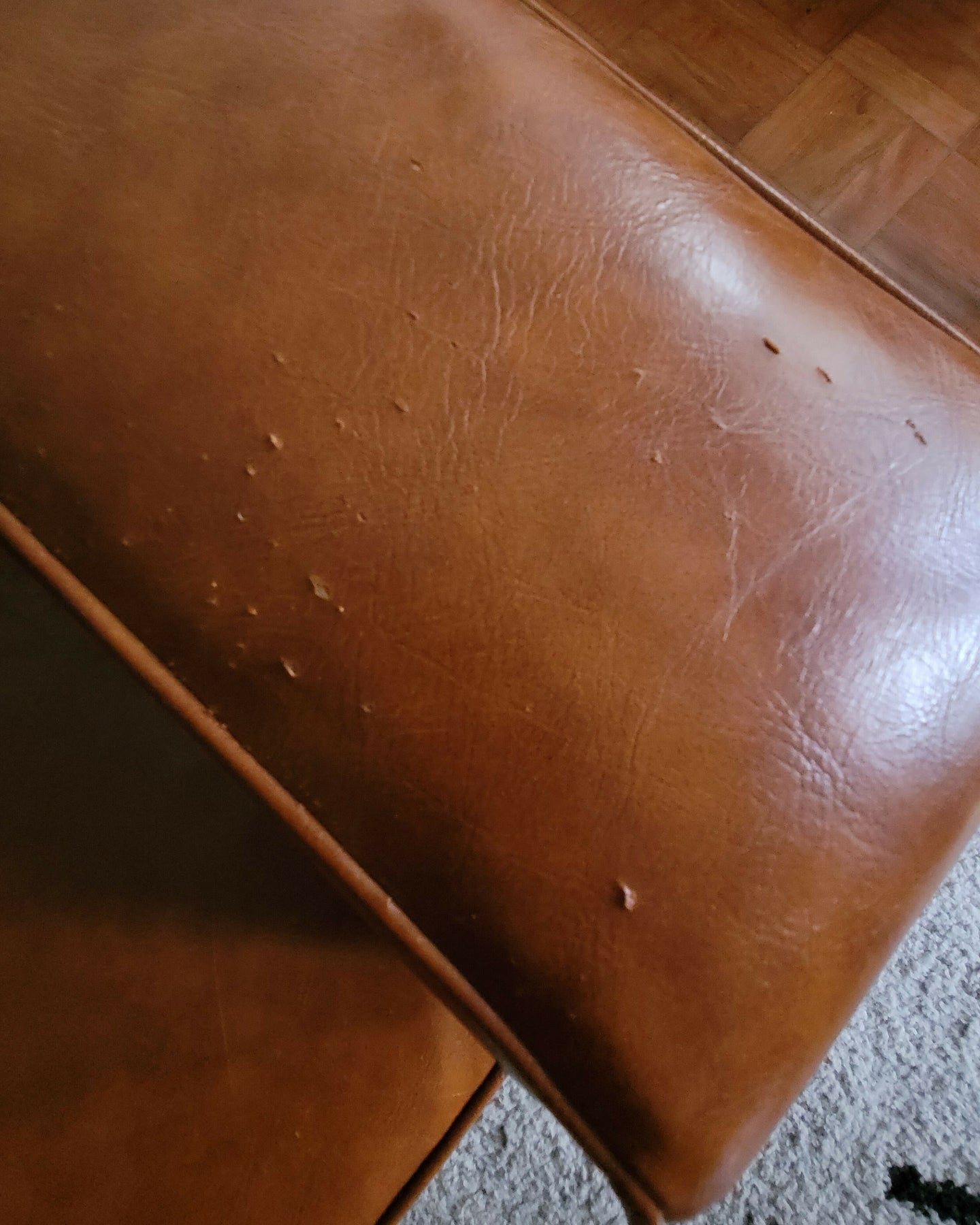 O couro possui algumas marcas nos braços e na parte de trás (fotos).