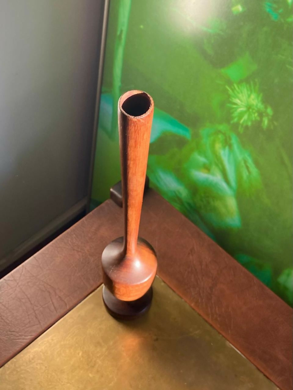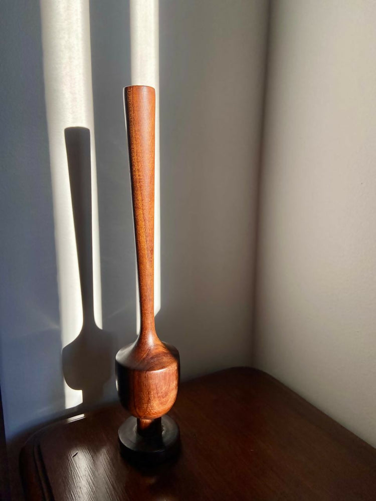 Solifleur executado em madeira torneada, de proporção vertical alongada e base bem resolvida, que garante estabilidade e presença visual. A peça se destaca pelo desenho limpo e pelo trabalho de tornearia, que valoriza o volume contínuo e a leitura da madeira.