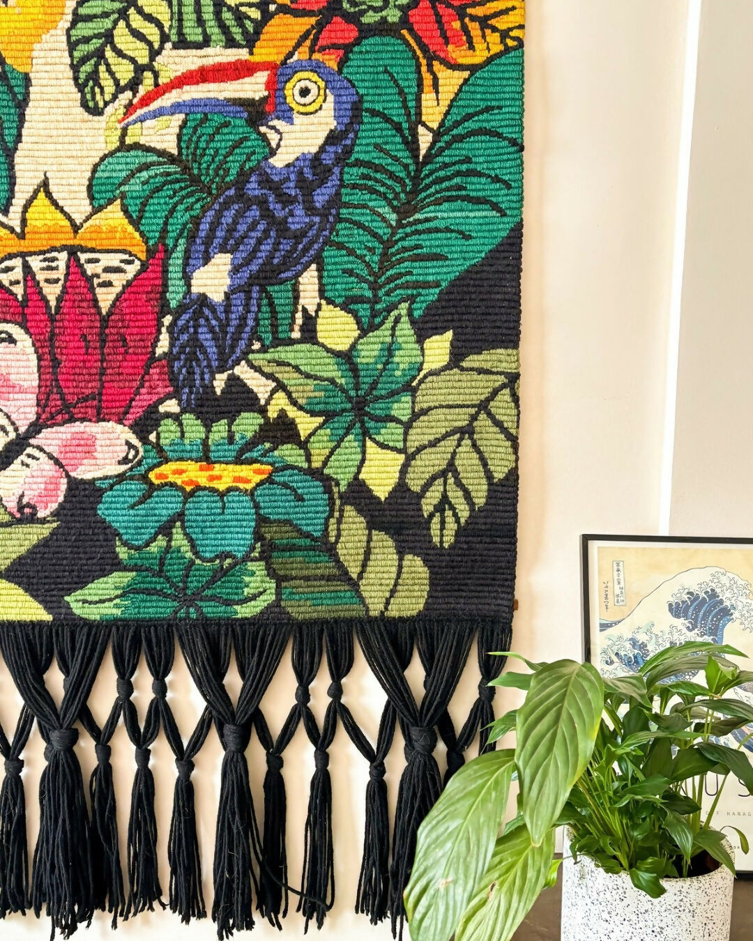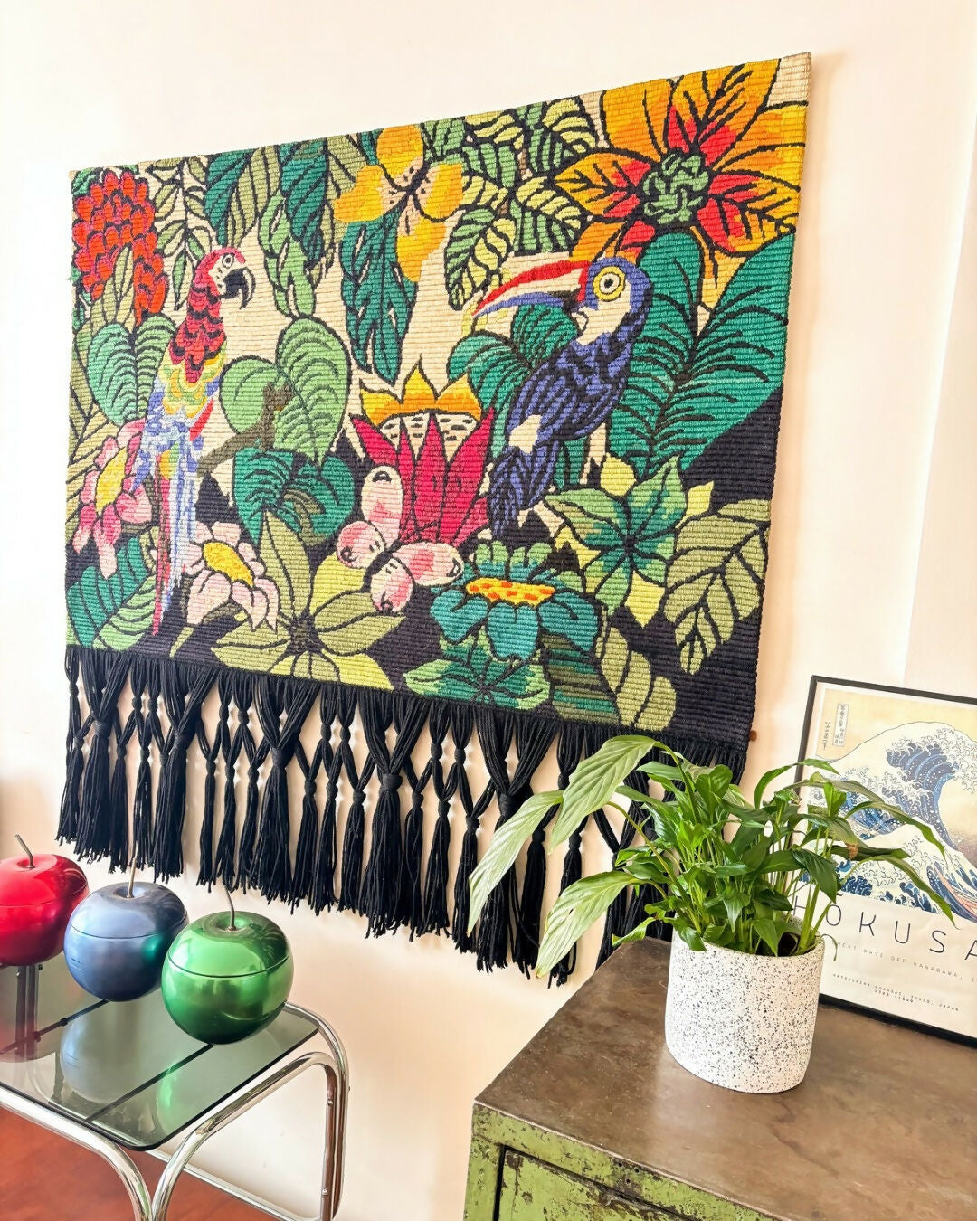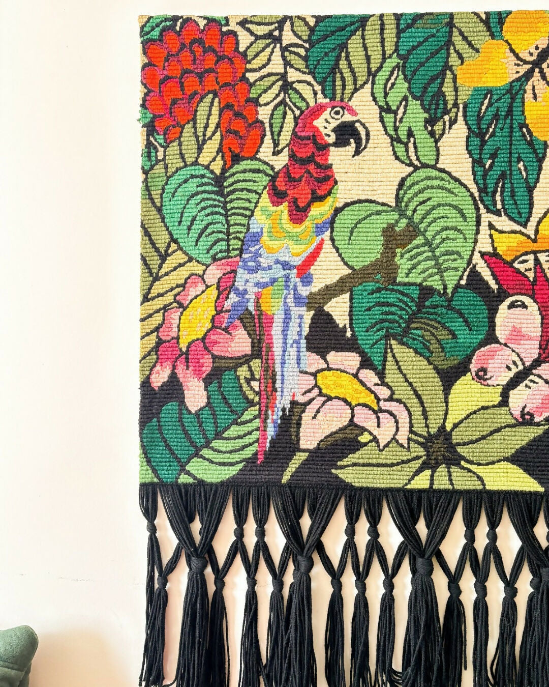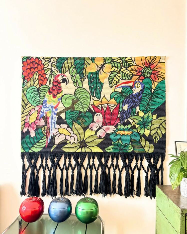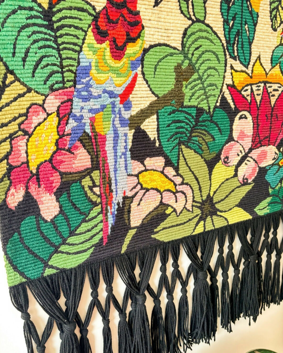 Tapeçaria bordada à mão em lã, bordado paralelo, com franjas longas em preto. Desenho de natureza, araras e borboleta. Colorida e elegante, em ótimo estado, sem desfiados, franja impermecável. Com resina atrás protegendo o bordado em excelente conservação e madeira com ganchinhos.