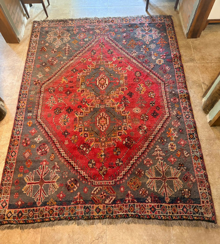 Tapete de estilo oriental/persa com forte influência tribal, marcado por um grande medalhão central geométrico em vermelho intenso, que domina a composição. Acabamento tem franjas discretas nas extremidades, reforçando o aspecto artesanal.