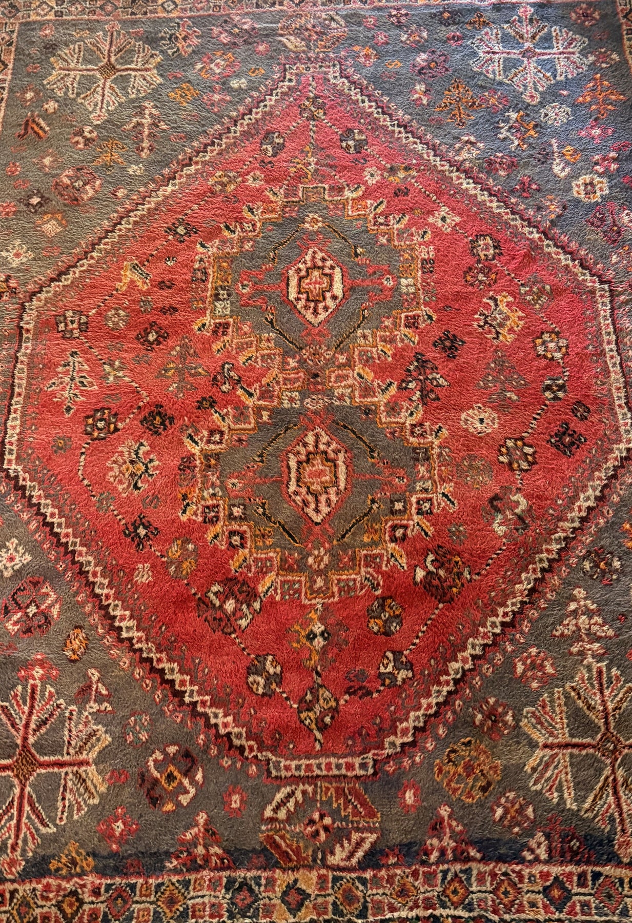 Tapete persa com medalhão central geométrico em vermelho intenso