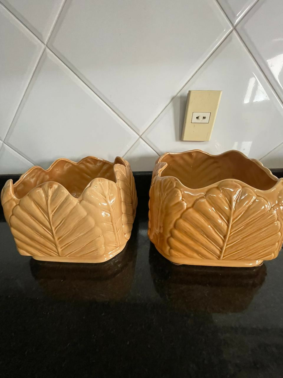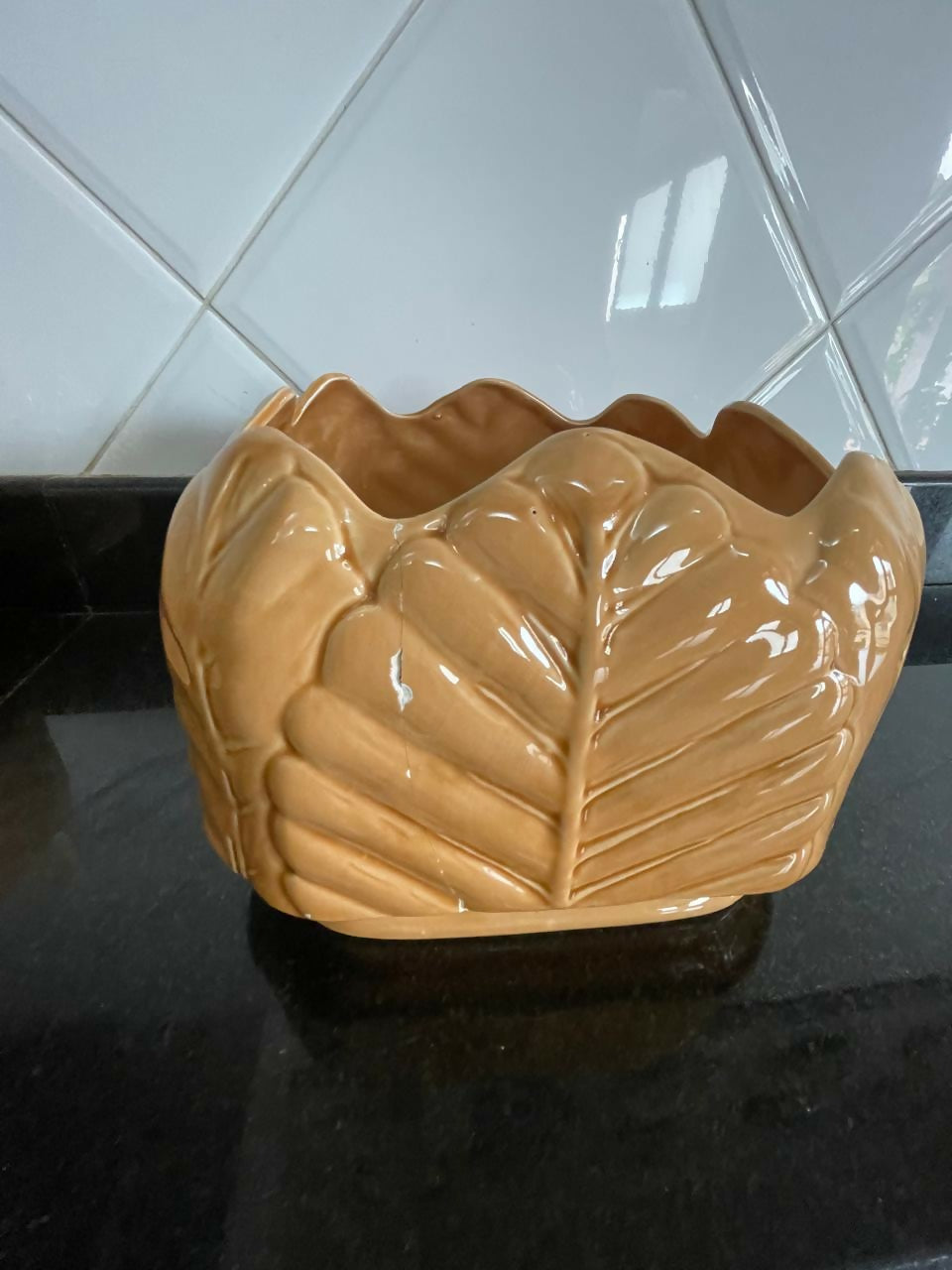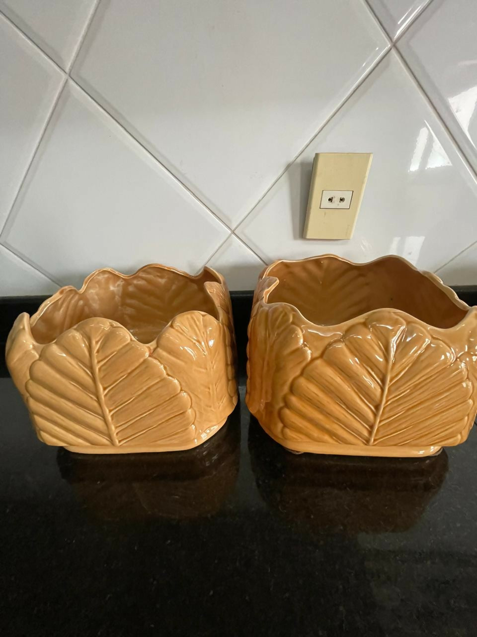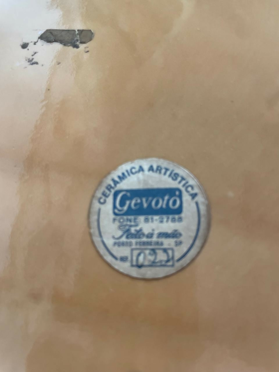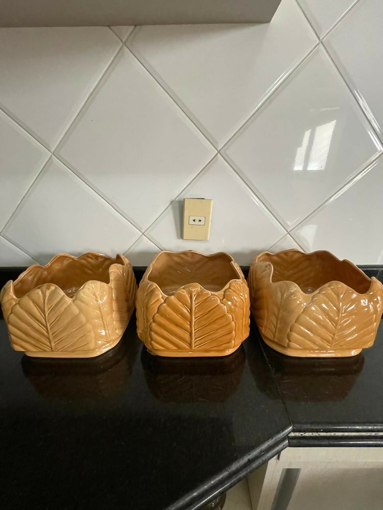 Três vasos/ cachepots grandes, em cerâmica artística da antiga fábrica Gevoto de Porto Ferreira . Cerâmica artesanal, numerada. Um dos vasos está trincado, não foi recuperado, os outros dois em perfeito estado!