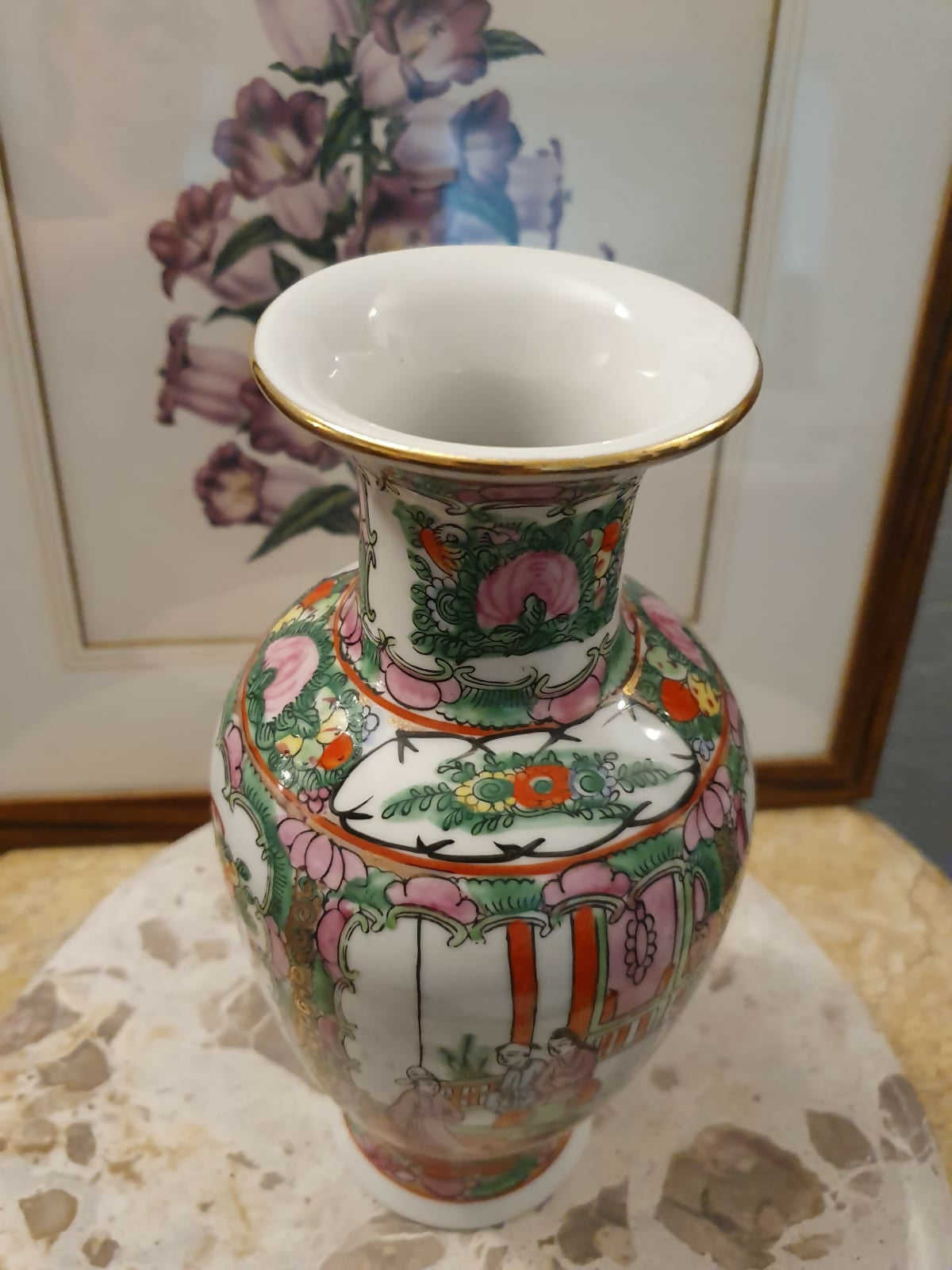 Vaso em porcelana chinesa esmaltada padrão Família Rosa, decoração Mandarim. Lindo e impecável!