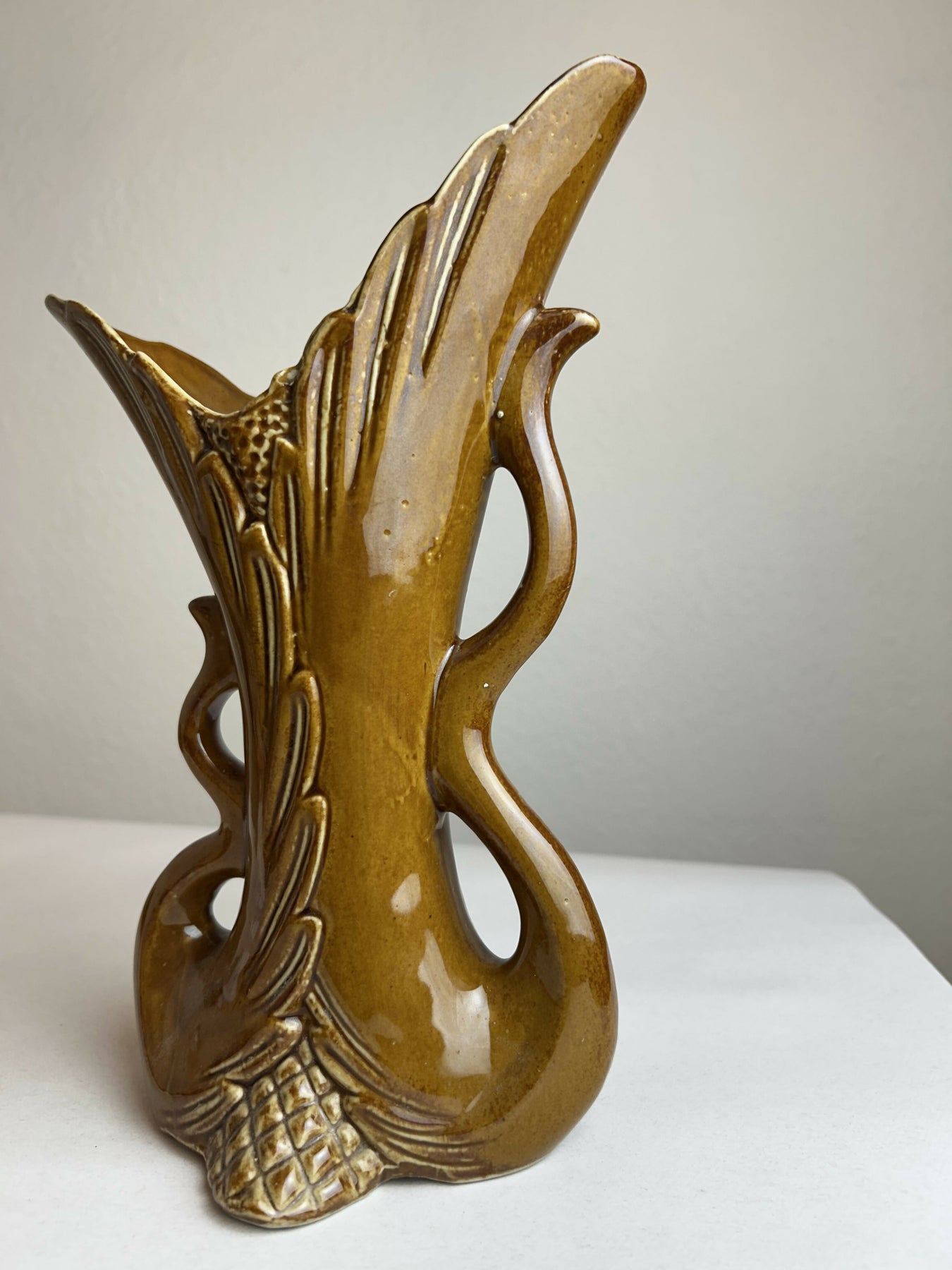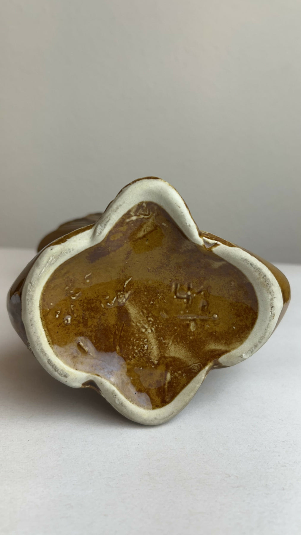 Sofisticado vaso de cerâmica decorativa, produzido entre as décadas de 1960 e 1970. A peça apresenta um design orgânico e fluido com alças vazadas, característica marcante do design Mid-Century Modern. Seu acabamento em esmalte brilhante cor caramelo/âmbar possui detalhes em relevo na base que enriquecem a peça