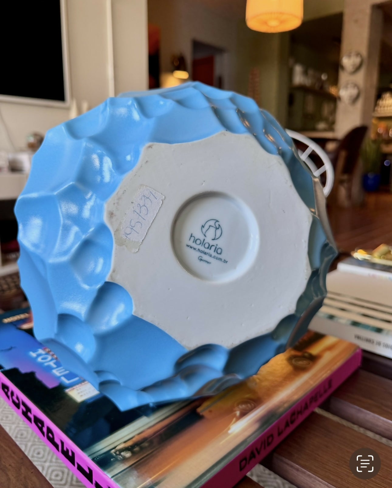Grande vaso Krater em tom azul céu na parte externa, sendo uma das cores mais raras de serem encontradas nesta peça e branco na parte interna, é uma produção Holaria a qual faz parte do grupo Germer Porcelanas Finas, com tradição desde 1978. Em grego, Krater significa ‘grande vaso’. Com o tempo, apenas a boca do vaso manteve esse significado, o que explica porque chamamos a boca de um vulcão de cratera. A Linha Krater explora essa duplicidade de sentidos, num imponente vaso cuja superfície é recoberta de crateras, resultando em um padrão plástico e expressivo.