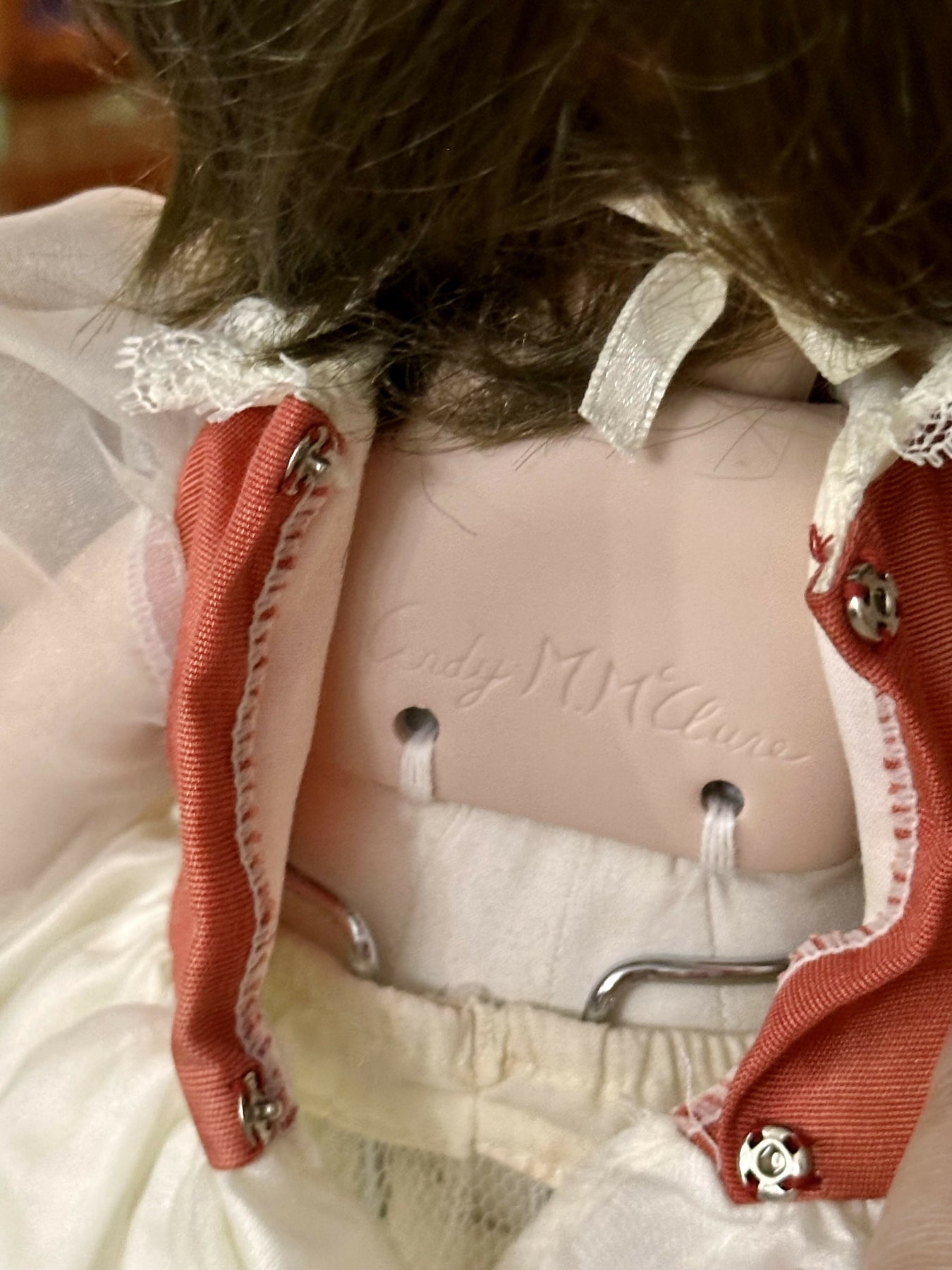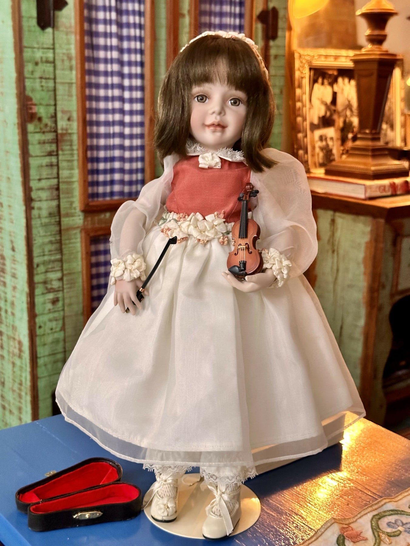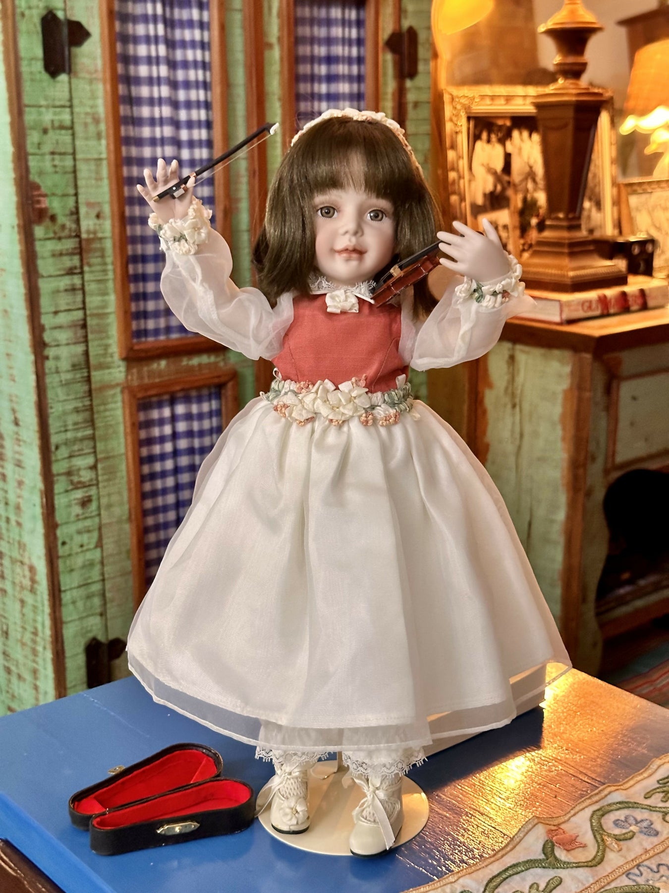 A artista Cindy McClure criou esta coleção de bonecas exclusiva de influência vitoriana “Little Performers” em 1997 pelas Galerias Ashton-Drake. “Lauren” é feita à mão e pintada à mão em porcelana e tecido. Numerada na nuca e vem com seu violino.