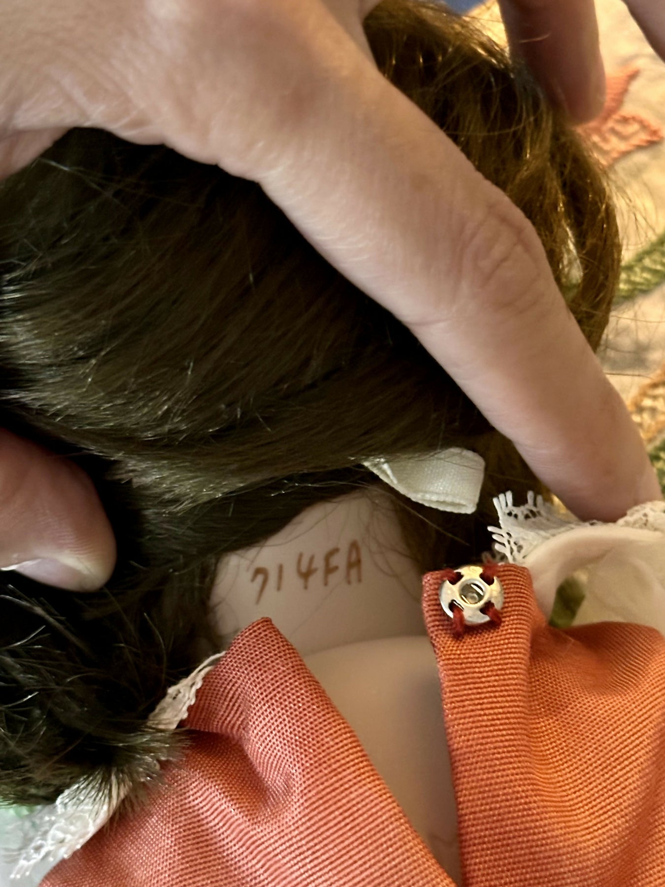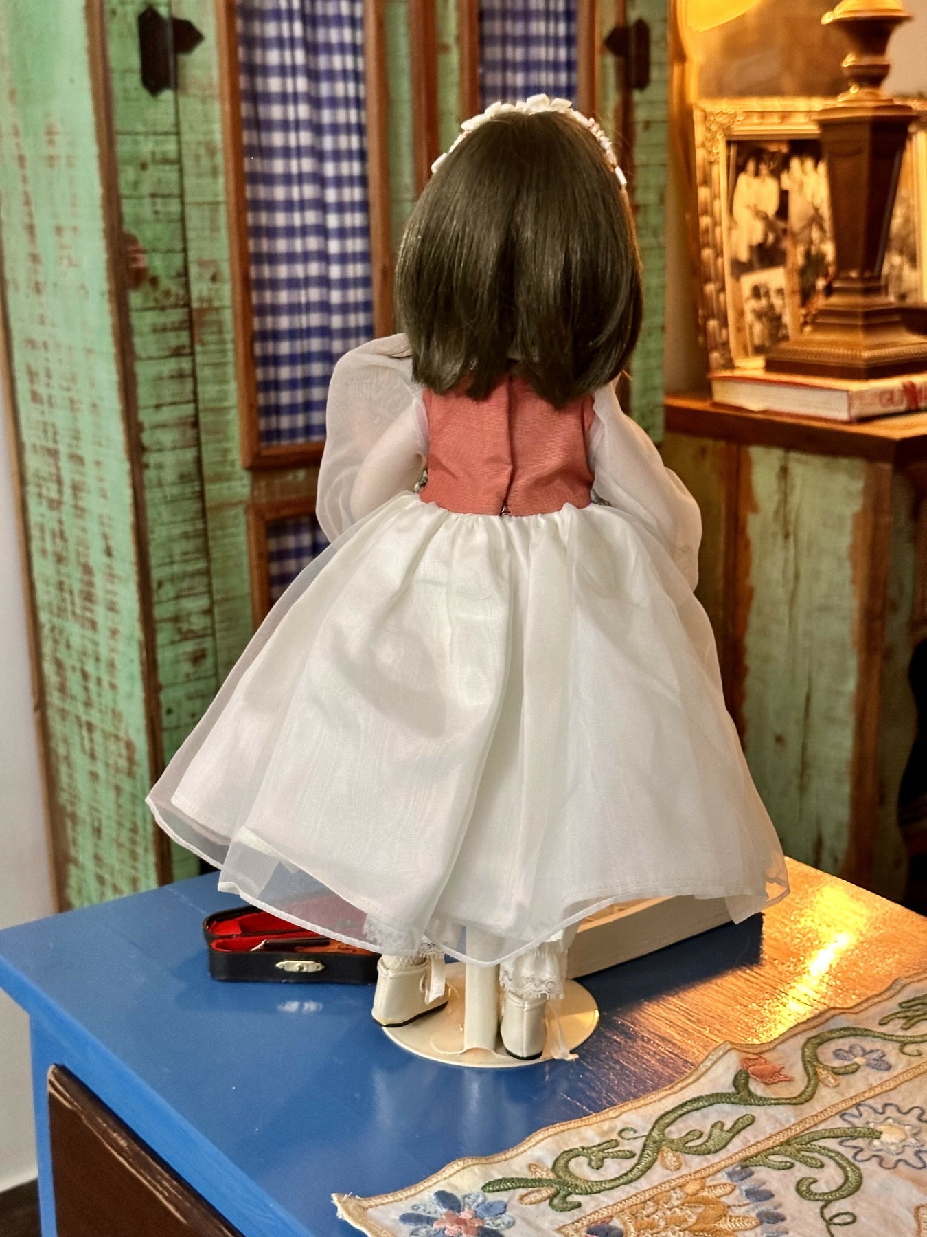 Uma peça rica em detalhes , braços articulados, cílios , sapatos e meias , vestido com flores e saia de tule , tiara de flores e pedestal ! Peça importada e vintage !